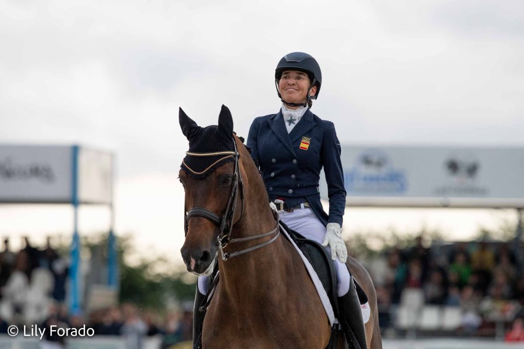 Beatriz Ferrer-Salat con Elegance tomó la delantera. En un ir y venir de lluvias , la finalista olímpica montó de escándalo. Cada tranco fue una fusión de magia, elegancia, sintonía y armonía etc. Elegance estuvo pletórico en los ejercicios de máxima reunión destacando el piaffe. Beatriz que se perdió la última edición del Cameponato por lesión de Elegance, este año ha vuelto a la carga con fuerza y viene a pelear por su gran trono, el que ha conquistado ya nueve veces. Tras su saludo final, Beatriz no pudo contener su emoción, elevó el puño hacia arriba con fuerza y una gran sonrisa en la cara. Su nota final fue de 75.456.