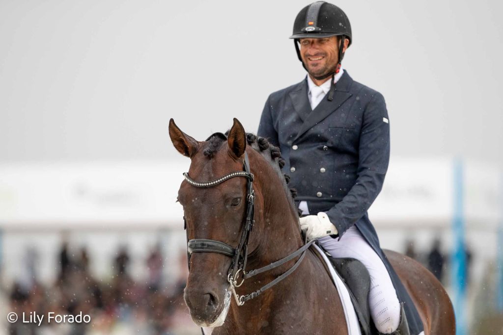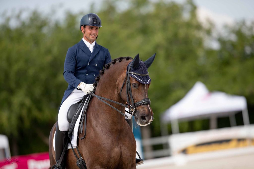 José Daniel Martin Dockx le sigue detrás con su gran compañero Malagueño LXXXIII.. Lloviendo a cantaros, el duo malagueño realizó una de las mejores actuaciones de la jornada. El jinete olímpico demostró su gran destreza ya que fue a por todas. No sólo voló en las extensiones de trote y galope, sino que Malagueño en el piaffe y passage exhibió por todo lo alto su calidad. Pese a la pista, Dockx arriesgó, apretó y brilló en cada uno de los ejercicios. Al finalizar su prueba, Dockx con una sonrisa de oreja a oreja sentenció una prueba maestra, aquellas de que te dejan sin aire. El público no tardó en involucrarse y ovacionó el jinete con un gran aplauso. Varios jueces del elenco lo situaron primero, y con su nota de 75.456 se sitúa en posición de plata provisional, pero a pocas décimas del gran escalón de oro. Sí hace unos meses, Dockx tuvo que retirarse del CDI de las Cadenas por molestias en la Espalda, ayer evidenció que está listo para la gran pelea.