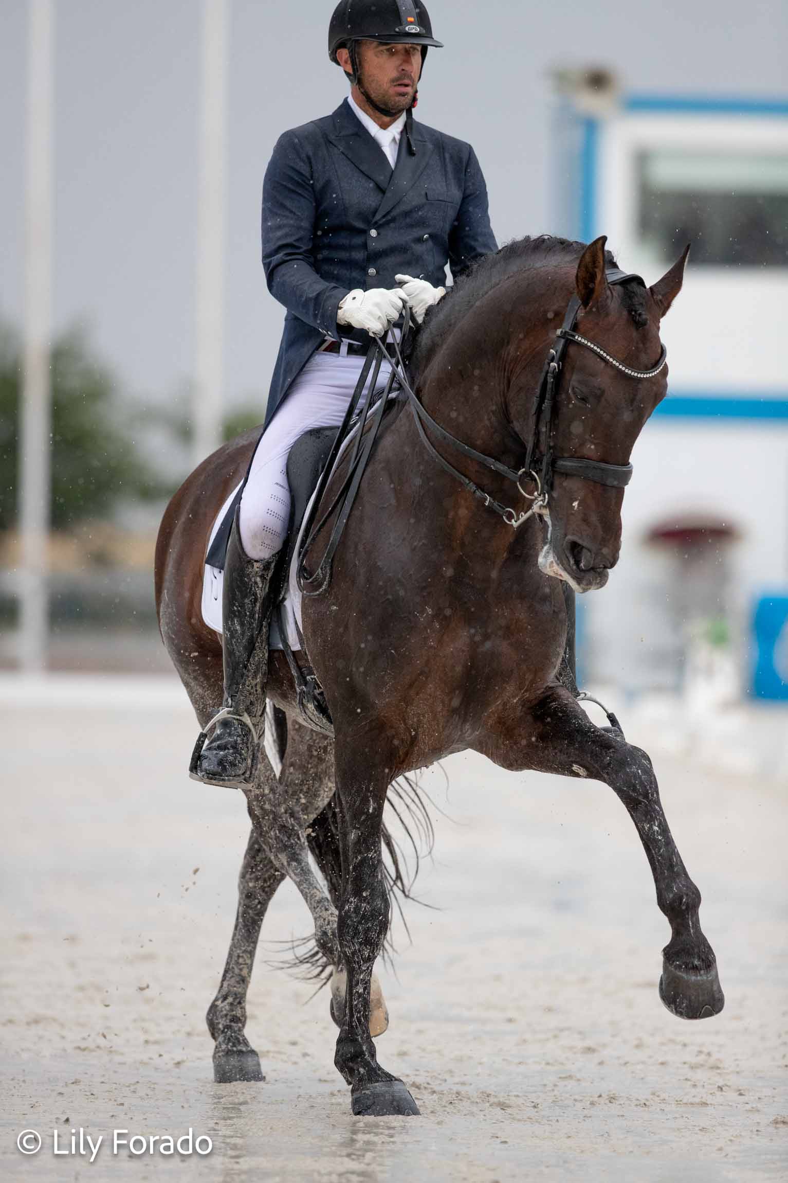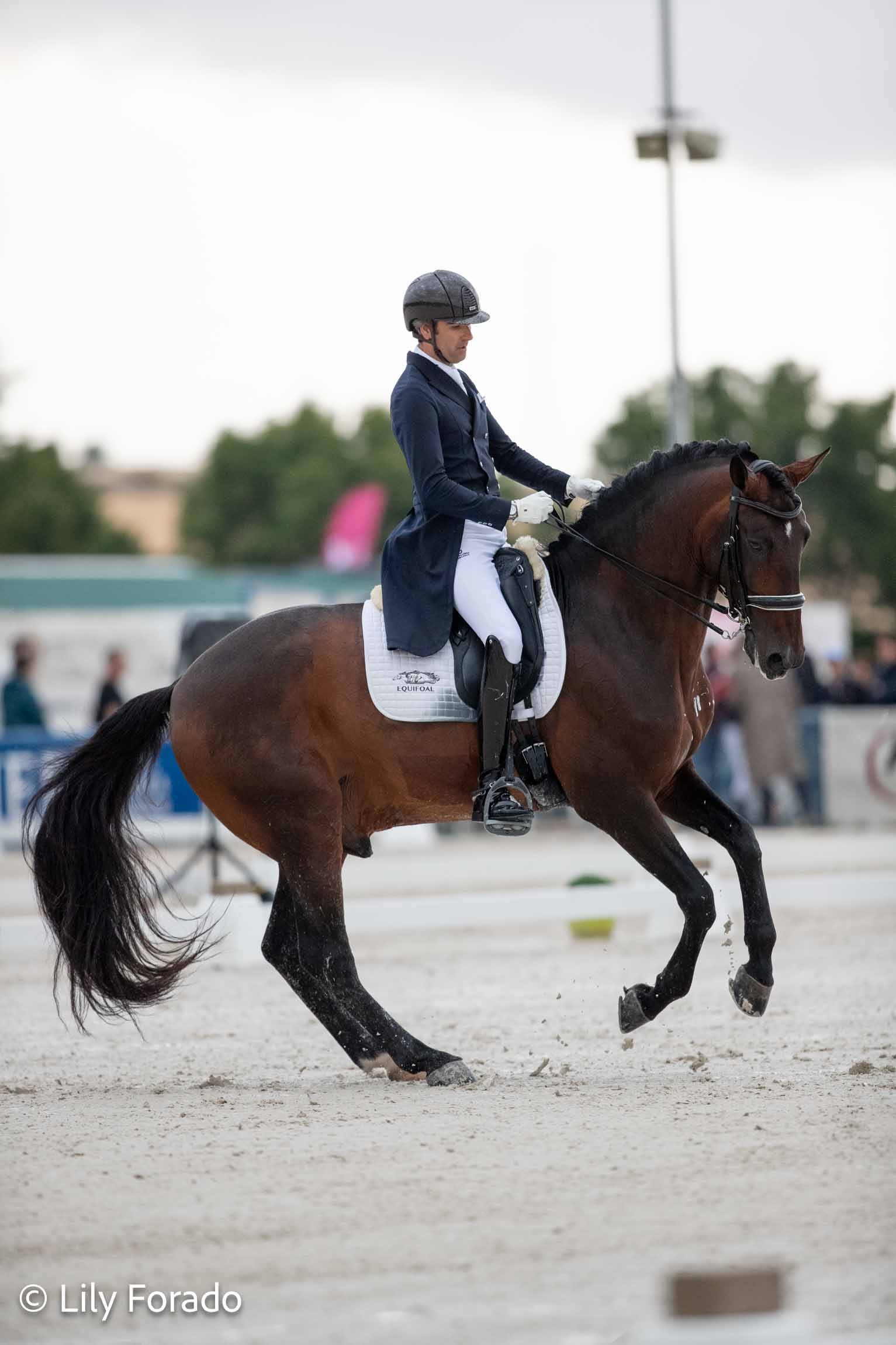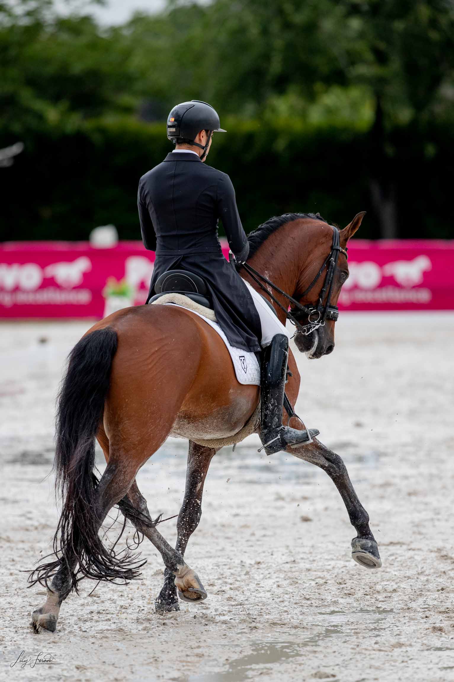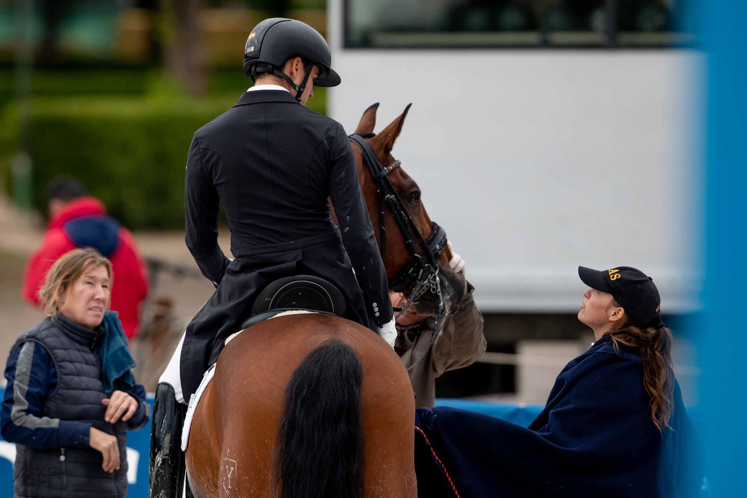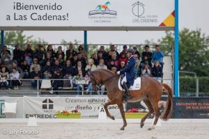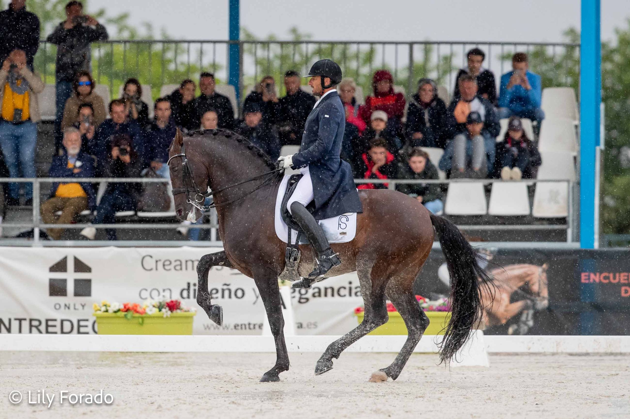 José Daniel Martin Dockx le sigue detrás con su gran compañero Malagueño LXXXIII.. Lloviendo a cantaros, el duo malagueño realizó una de las mejores actuaciones de la jornada. El jinete olímpico demostró su gran destreza ya que fue a por todas. No sólo voló en las extensiones de trote y galope, sino que Malagueño en el piaffe y passage exhibió por todo lo alto su calidad. Pese a la pista, Dockx arriesgó, apretó y brilló en cada uno de los ejercicios. Al finalizar su prueba, Dockx con una sonrisa de oreja a oreja sentenció una prueba maestra, aquellas de que te dejan sin aire. El público no tardó en involucrarse y ovacionó el jinete con un gran aplauso. Varios jueces del elenco lo situaron primero, y con su nota de 75.456 se sitúa en posición de plata provisional, pero a pocas décimas del gran escalón de oro. Sí hace unos meses, Dockx tuvo que retirarse del CDI de las Cadenas por molestias en la Espalda, ayer evidenció que está listo para la gran pelea.
