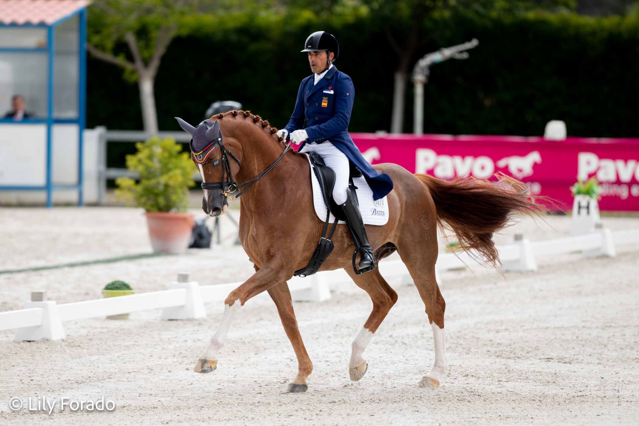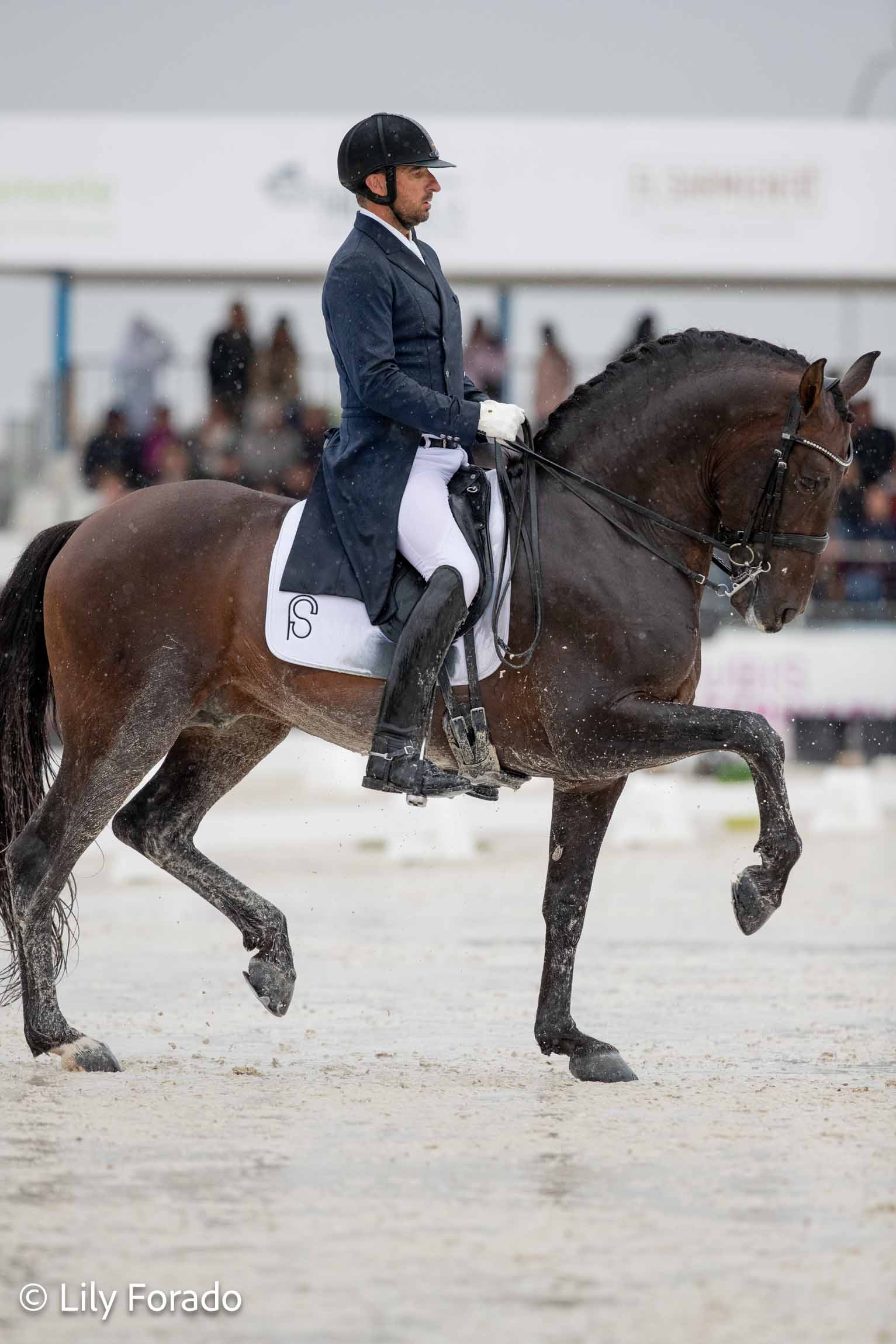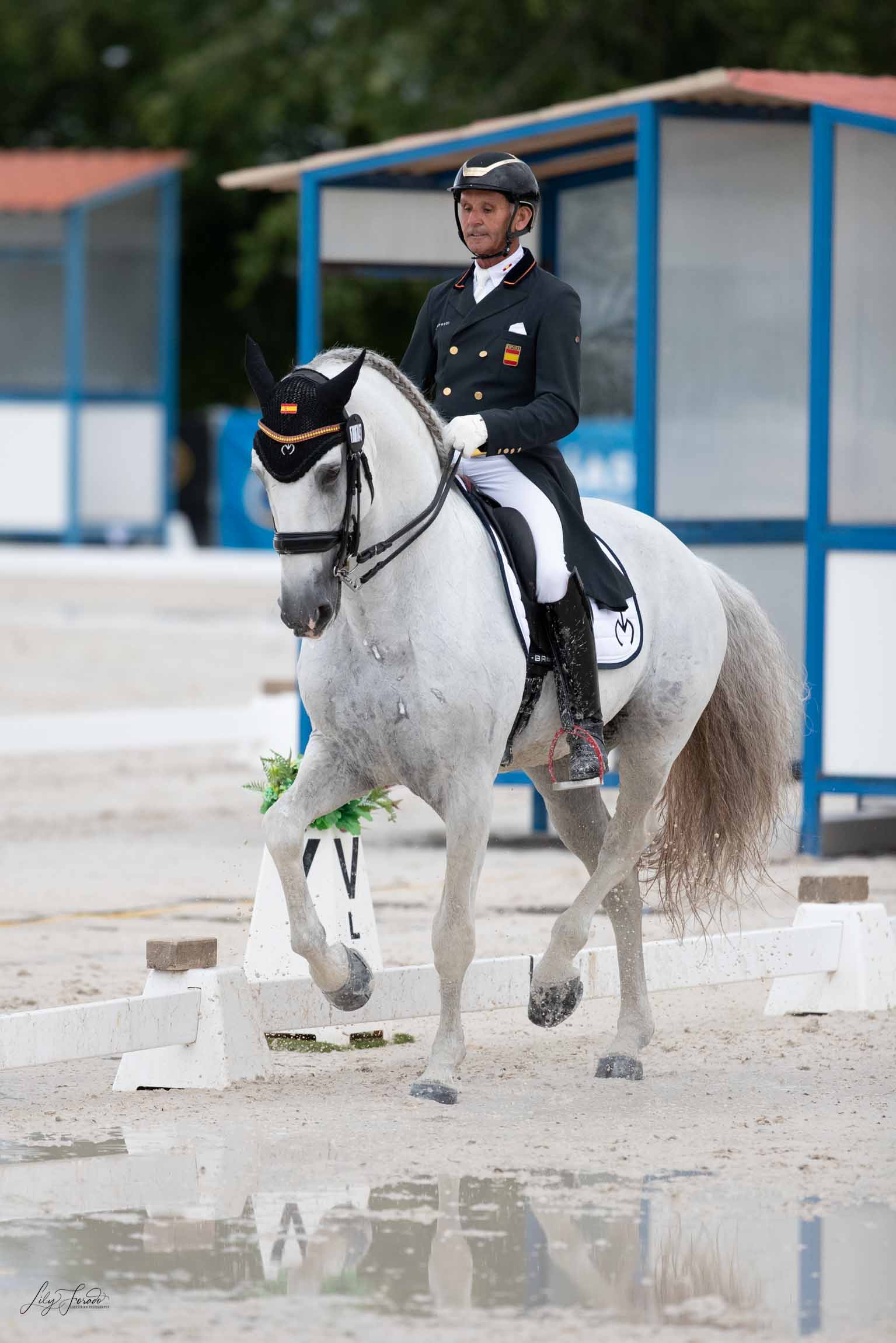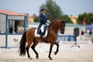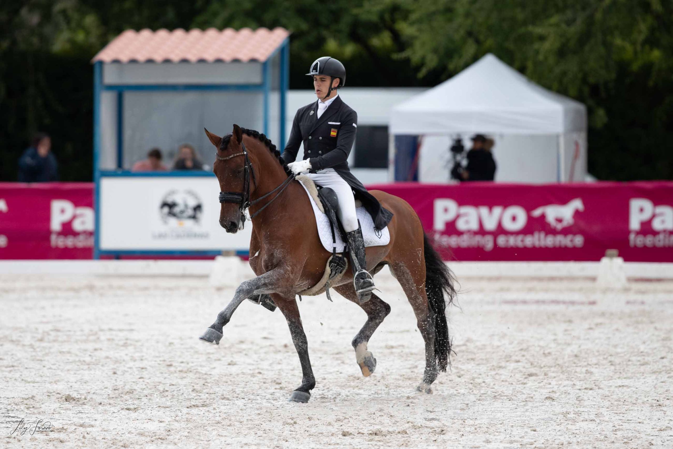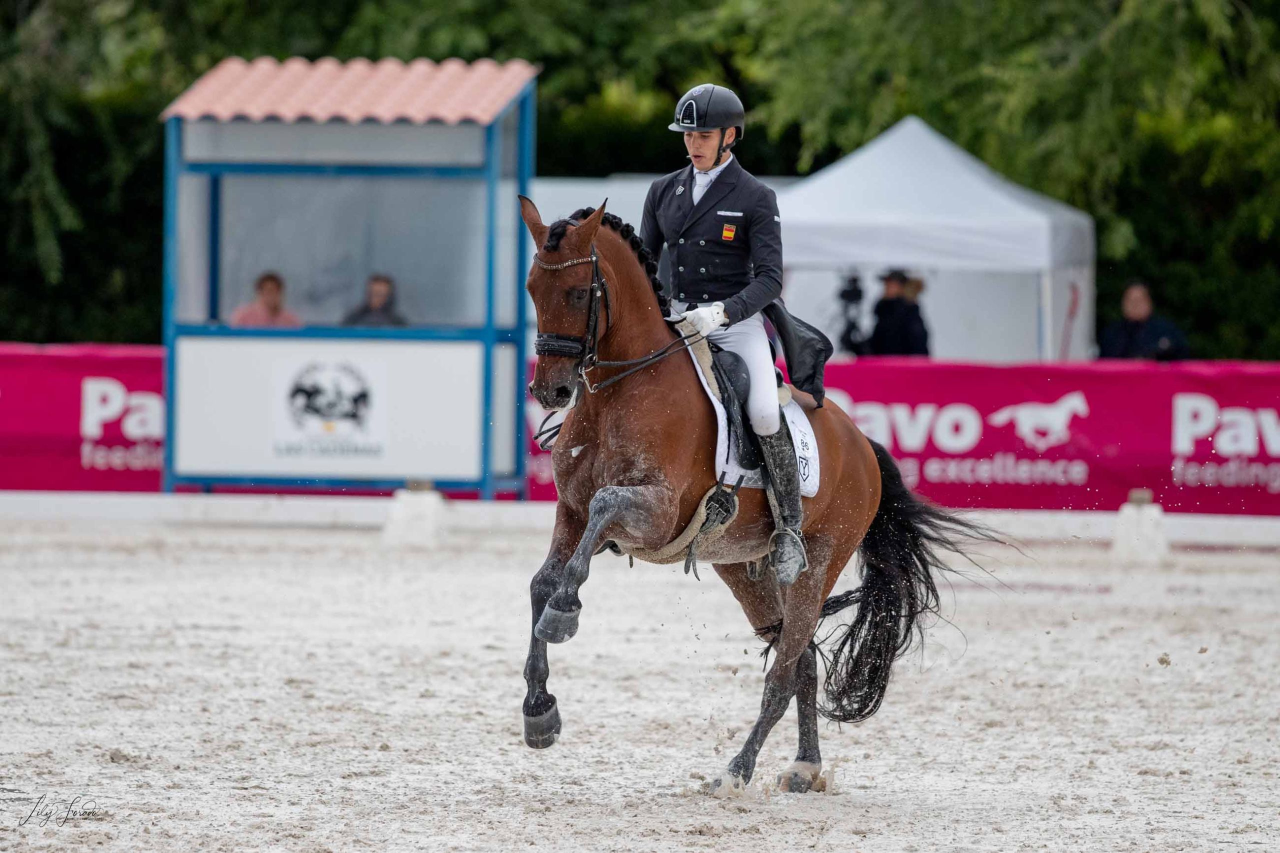 José Daniel Martin Dockx le sigue detrás con su gran compañero Malagueño LXXXIII.. Lloviendo a cantaros, el duo malagueño realizó una de las mejores actuaciones de la jornada. El jinete olímpico demostró su gran destreza ya que fue a por todas. No sólo voló en las extensiones de trote y galope, sino que Malagueño en el piaffe y passage exhibió por todo lo alto su calidad. Pese a la pista, Dockx arriesgó, apretó y brilló en cada uno de los ejercicios. Al finalizar su prueba, Dockx con una sonrisa de oreja a oreja sentenció una prueba maestra, aquellas de que te dejan sin aire. El público no tardó en involucrarse y ovacionó el jinete con un gran aplauso. Varios jueces del elenco lo situaron primero, y con su nota de 75.456 se sitúa en posición de plata provisional, pero a pocas décimas del gran escalón de oro. Sí hace unos meses, Dockx tuvo que retirarse del CDI de las Cadenas por molestias en la Espalda, ayer evidenció que está listo para la gran pelea.