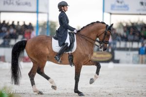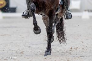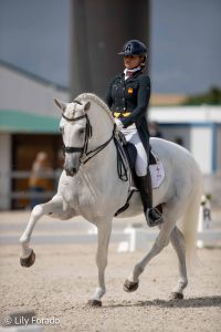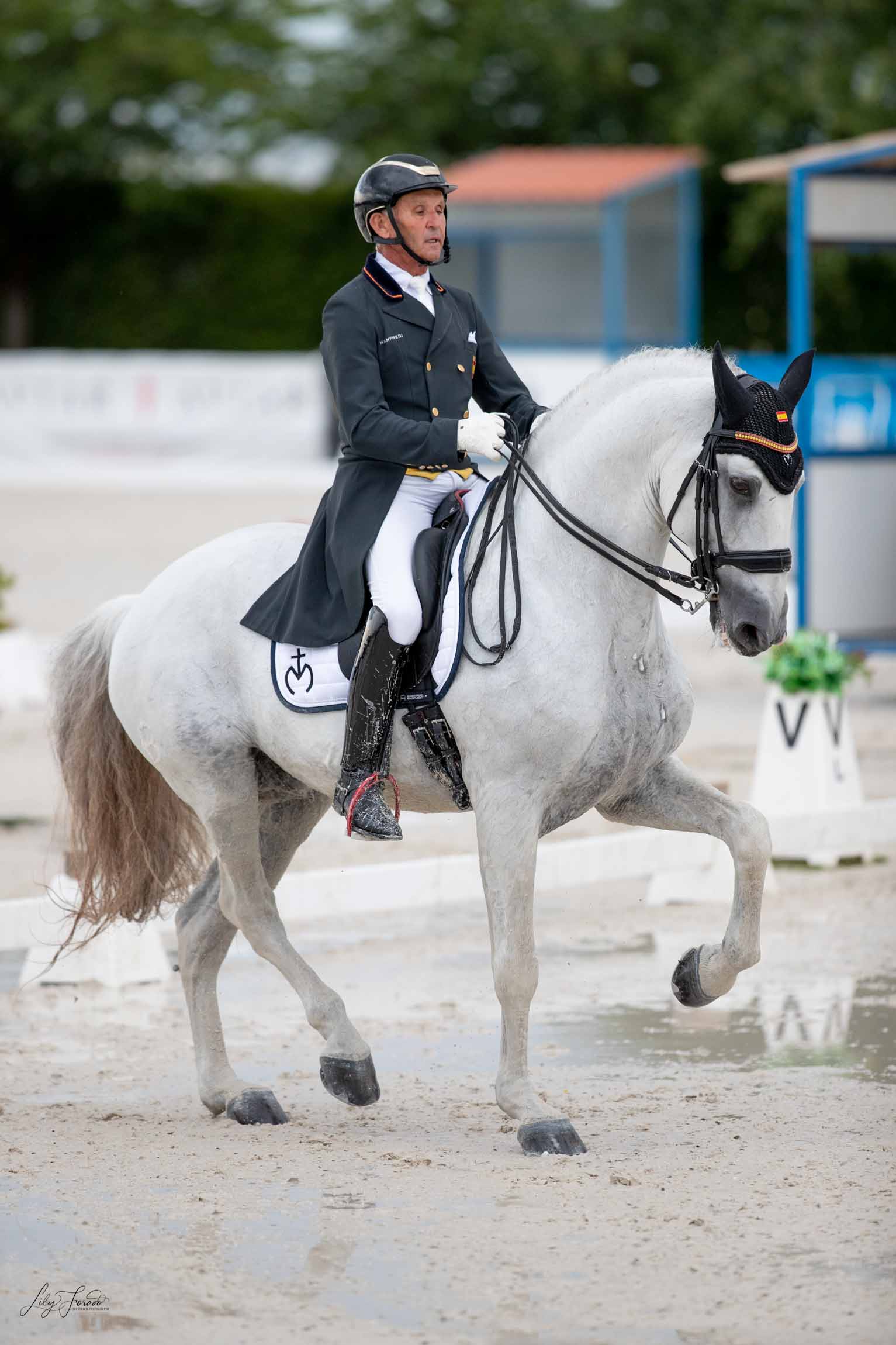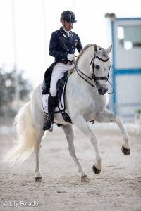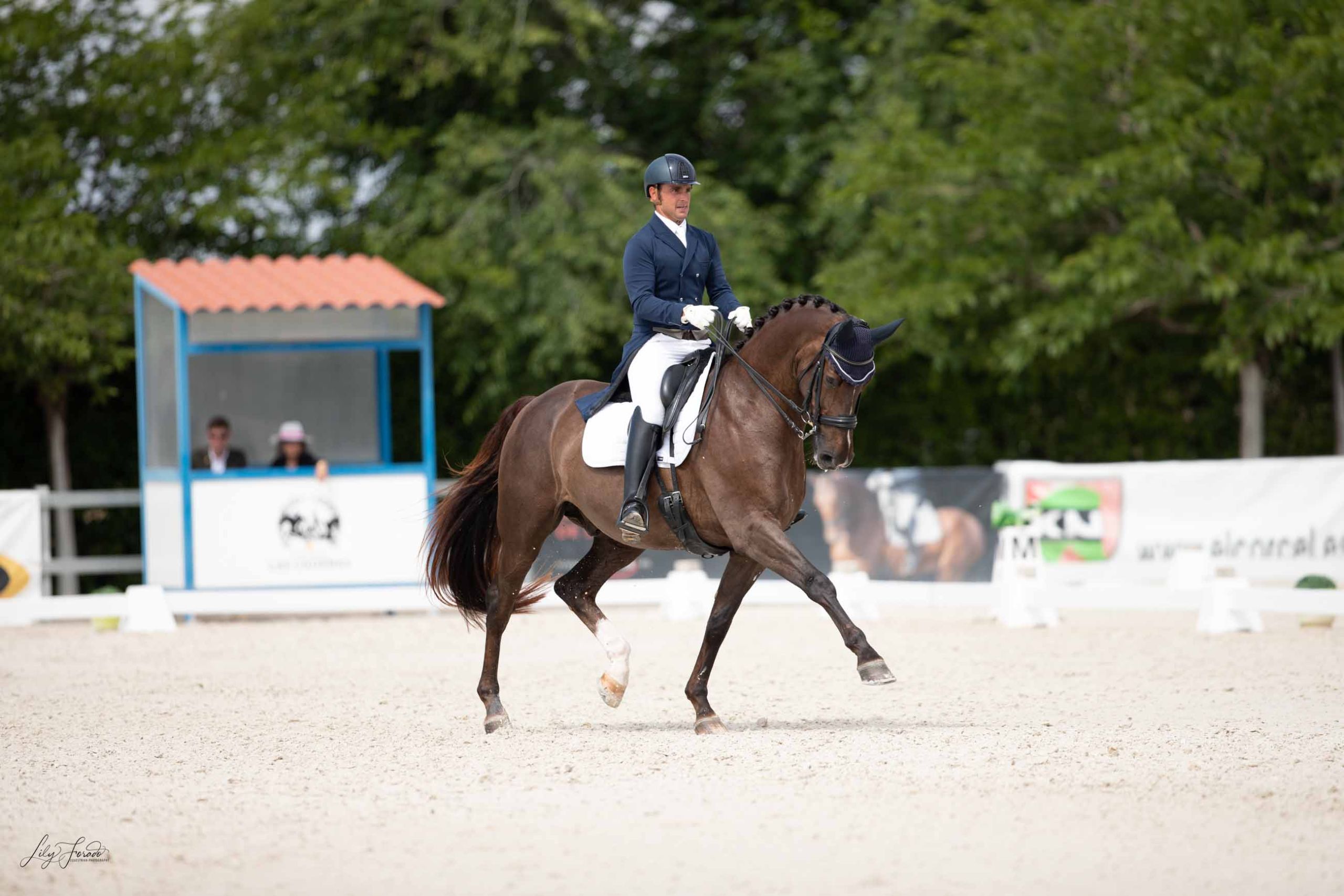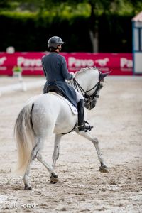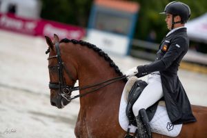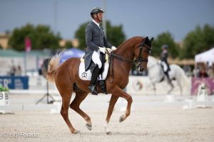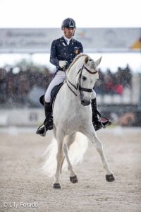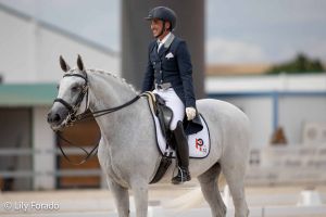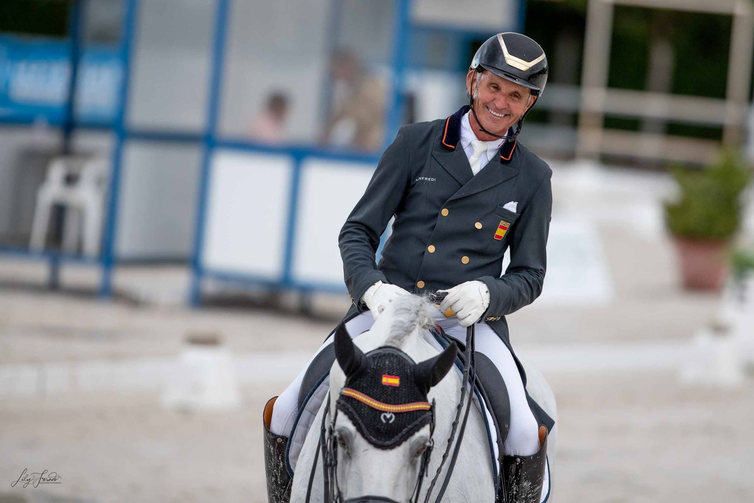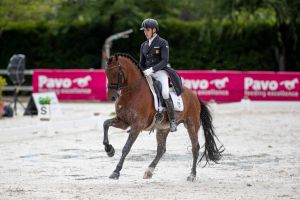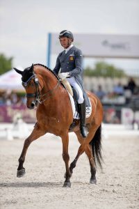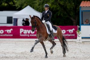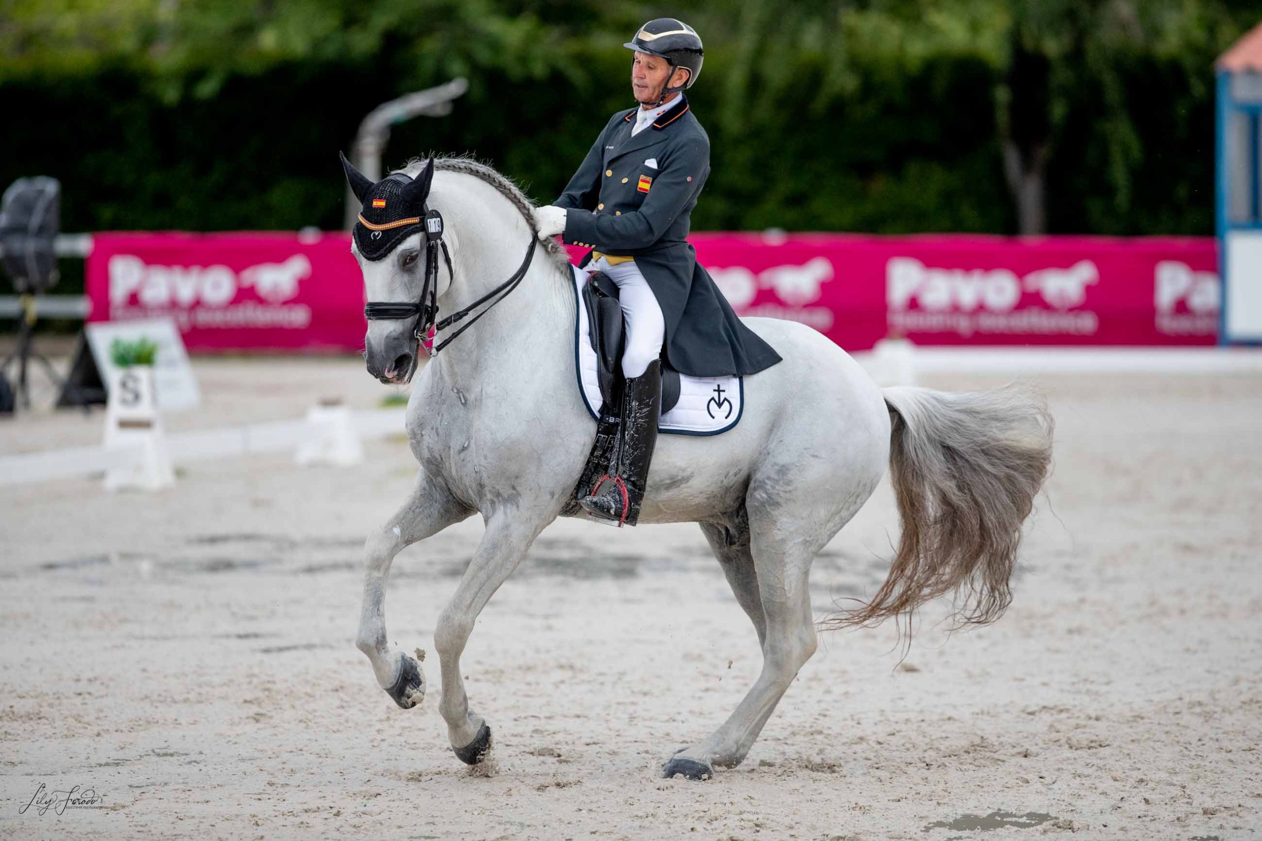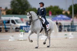 José Daniel Martin Dockx le sigue detrás con su gran compañero Malagueño LXXXIII.. Lloviendo a cantaros, el duo malagueño realizó una de las mejores actuaciones de la jornada. El jinete olímpico demostró su gran destreza ya que fue a por todas. No sólo voló en las extensiones de trote y galope, sino que Malagueño en el piaffe y passage exhibió por todo lo alto su calidad. Pese a la pista, Dockx arriesgó, apretó y brilló en cada uno de los ejercicios. Al finalizar su prueba, Dockx con una sonrisa de oreja a oreja sentenció una prueba maestra, aquellas de que te dejan sin aire. El público no tardó en involucrarse y ovacionó el jinete con un gran aplauso. Varios jueces del elenco lo situaron primero, y con su nota de 75.456 se sitúa en posición de plata provisional, pero a pocas décimas del gran escalón de oro. Sí hace unos meses, Dockx tuvo que retirarse del CDI de las Cadenas por molestias en la Espalda, ayer evidenció que está listo para la gran pelea.