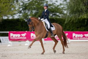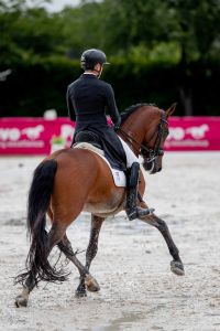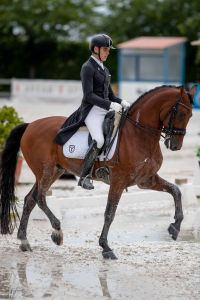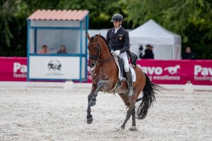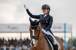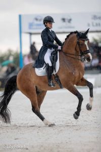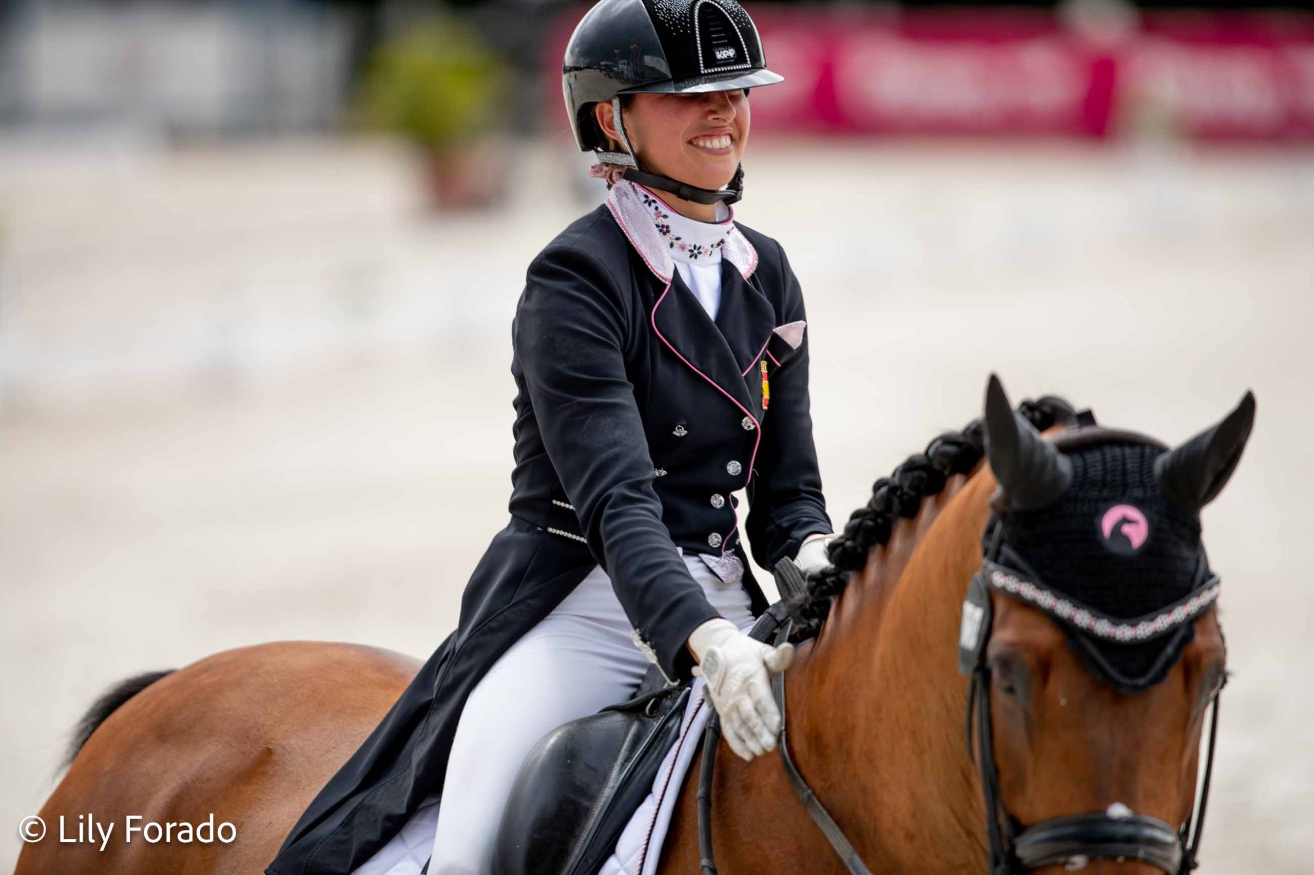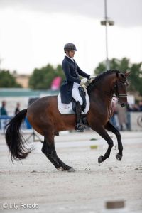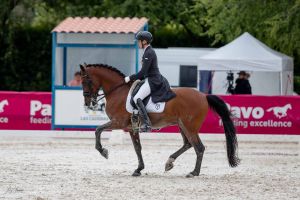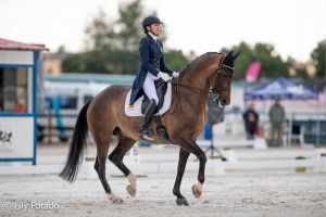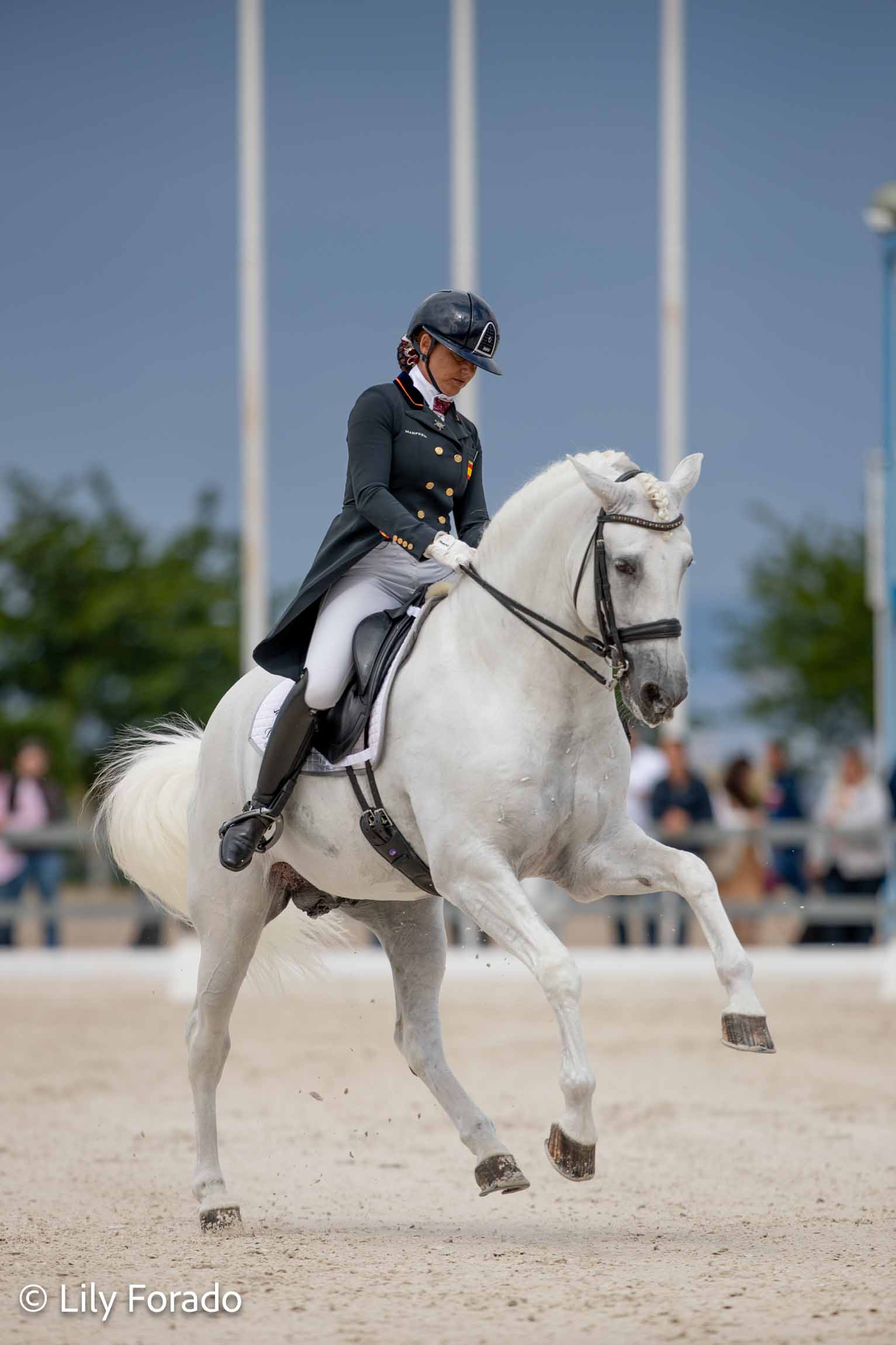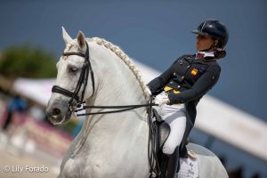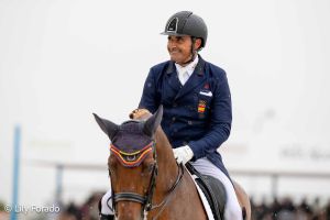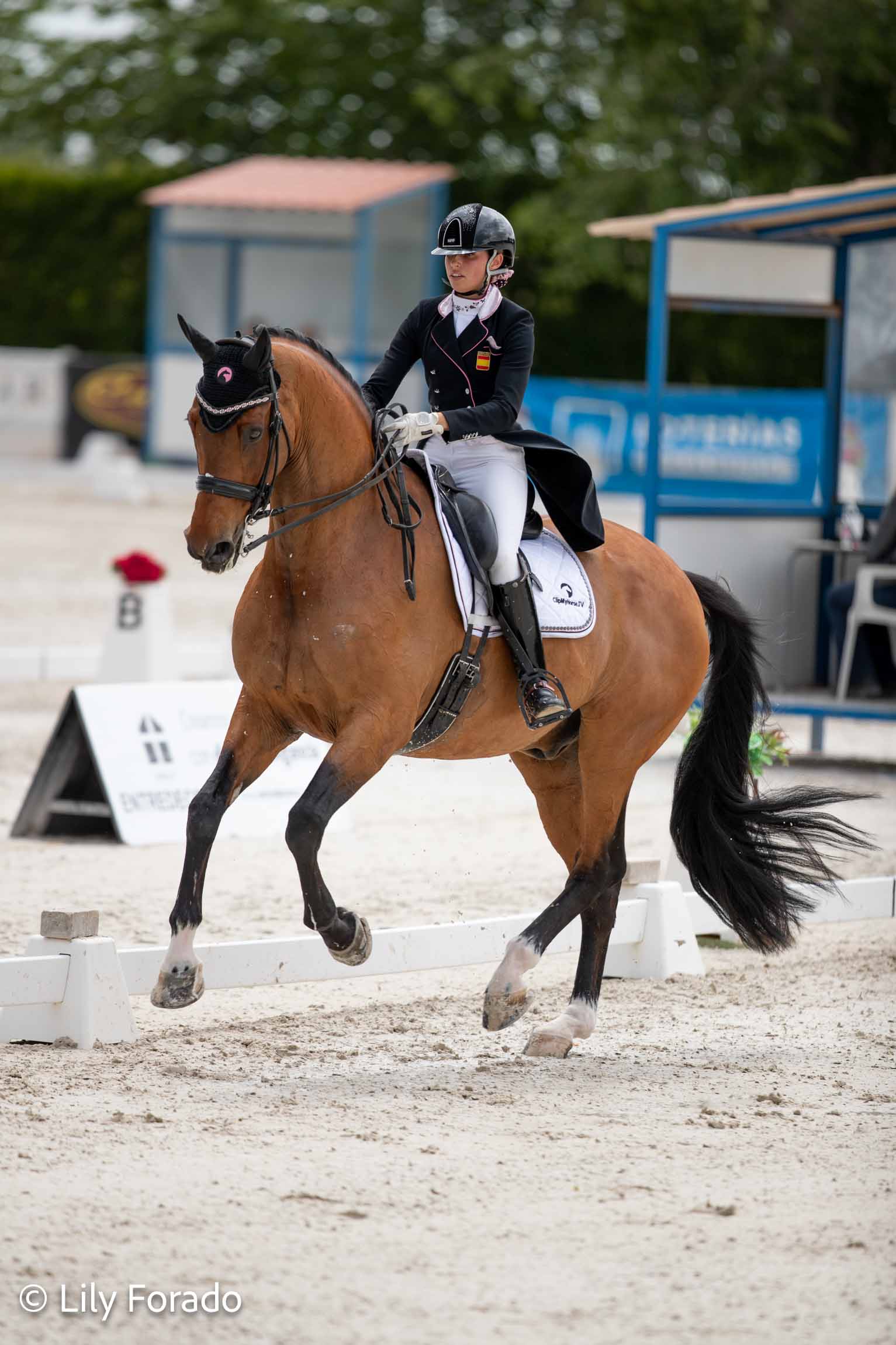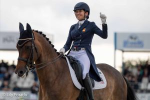 Beatriz Ferrer-Salat con Elegance tomó la delantera. En un ir y venir de lluvias , la finalista olímpica montó de escándalo. Cada tranco fue una fusión de magia, elegancia, sintonía y armonía etc. Elegance estuvo pletórico en los ejercicios de máxima reunión destacando el piaffe. Beatriz que se perdió la última edición del Cameponato por lesión de Elegance, este año ha vuelto a la carga con fuerza y viene a pelear por su gran trono, el que ha conquistado ya nueve veces. Tras su saludo final, Beatriz no pudo contener su emoción, elevó el puño hacia arriba con fuerza y una gran sonrisa en la cara. Su nota final fue de 75.456.