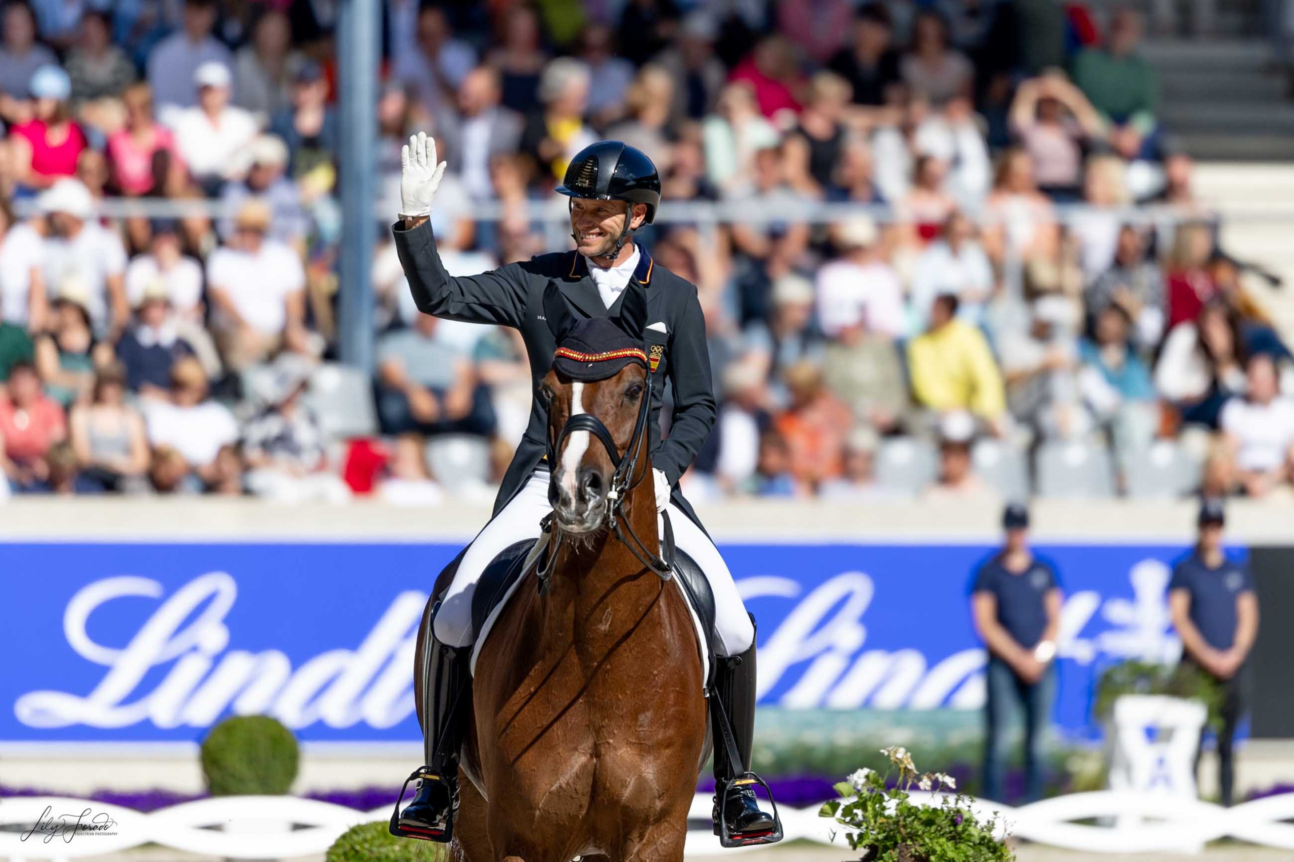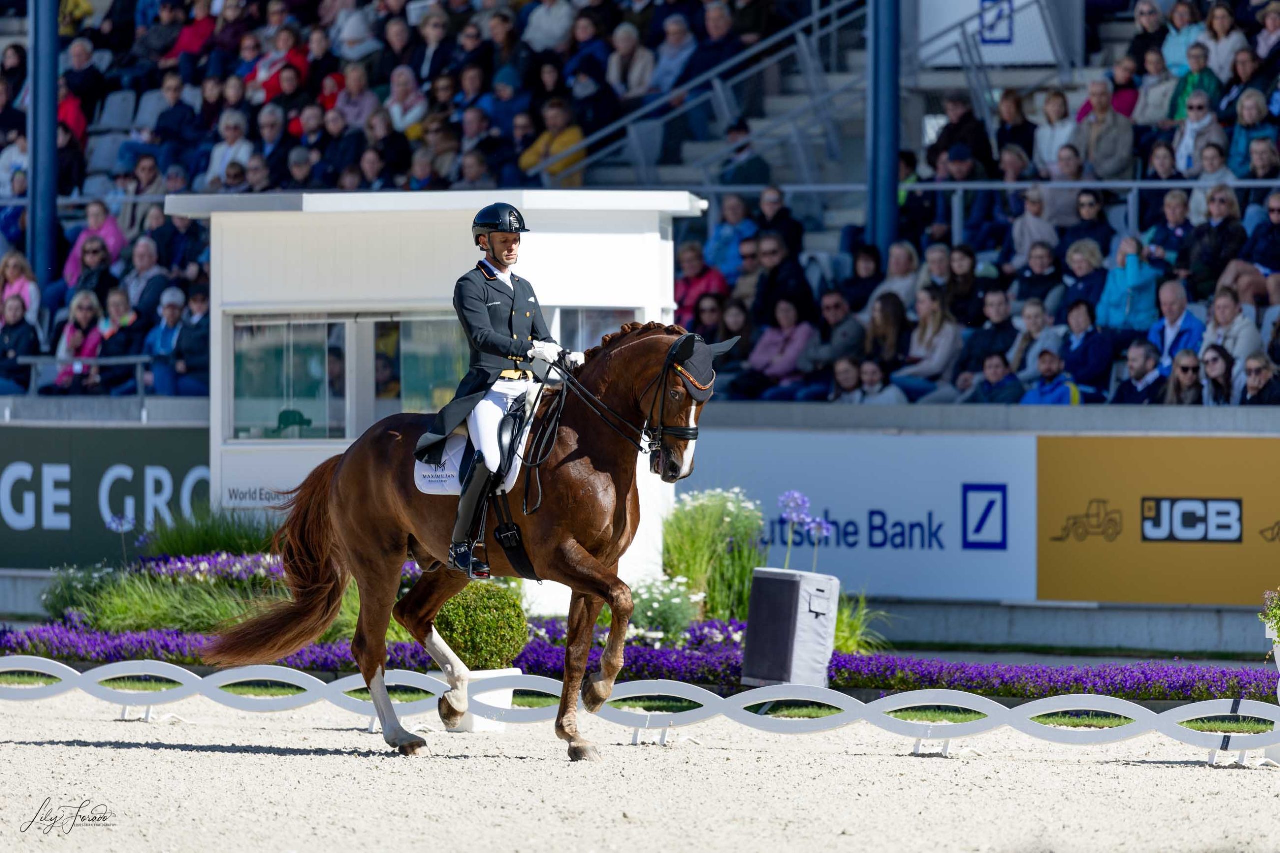 Juan Rodriguez con Meggle’s Boston realizó su debut de Aachen por todo lo alto puesto que fue uno de los 18 afortunados en encarar la línea central de la prueba musical. Al son de compendio de música clásica, el jinete español presentó una gran sinergia con su compañero. Los ejercicios de piaffe y passage fueron elegancia pura y sobre todo armonía en pista. Su nota final fue de 73.305%.