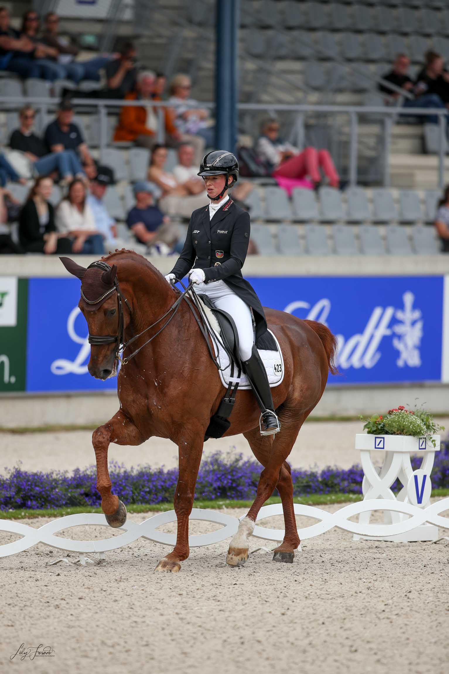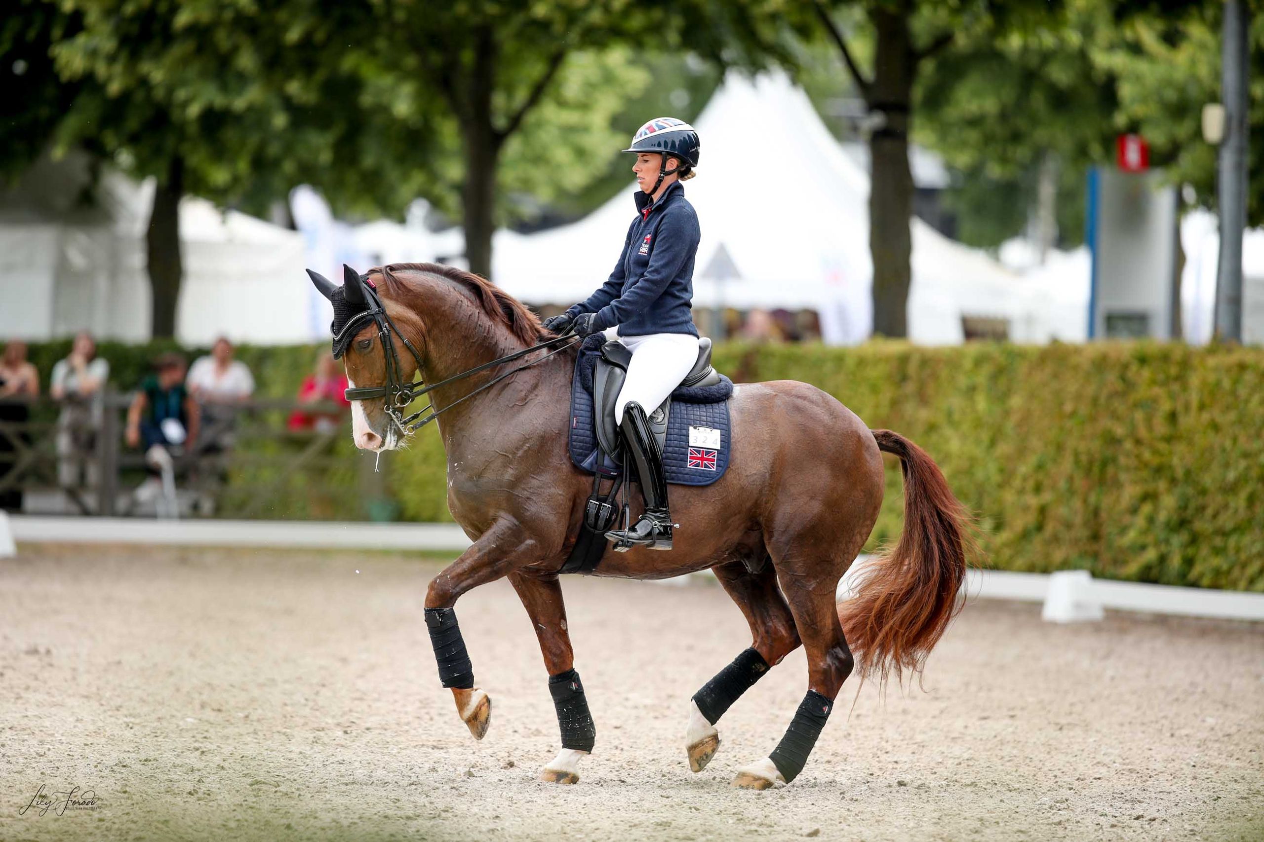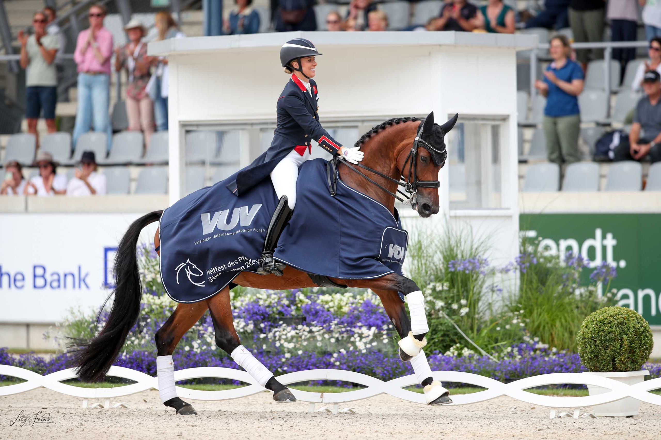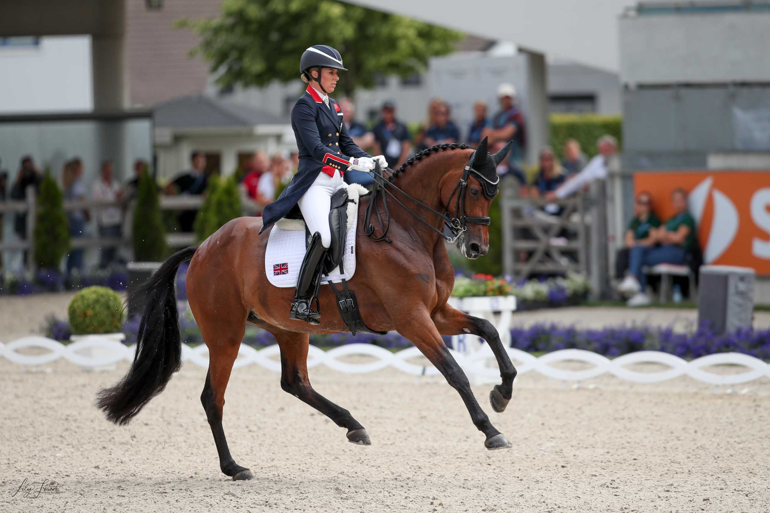 La segunda posición fue para Charlotte Fry con una de sus múltiples monturas. Su número uno, Glamourdale, se ha quedado en casa para cumplir sus funciones de semental, lo que deja entrever que su gran momento de la temporada será el Cto. de Europa- Hoy . Fry junto a Lars van de Hoenderheide no ha defaudado en la parte de galope, con unos cambios de pies muy saltados y cuesta arriba. Su nota plateada de 75.196%.