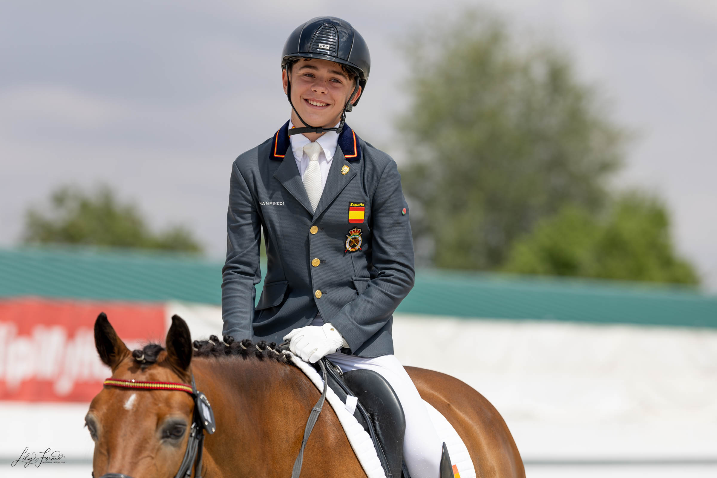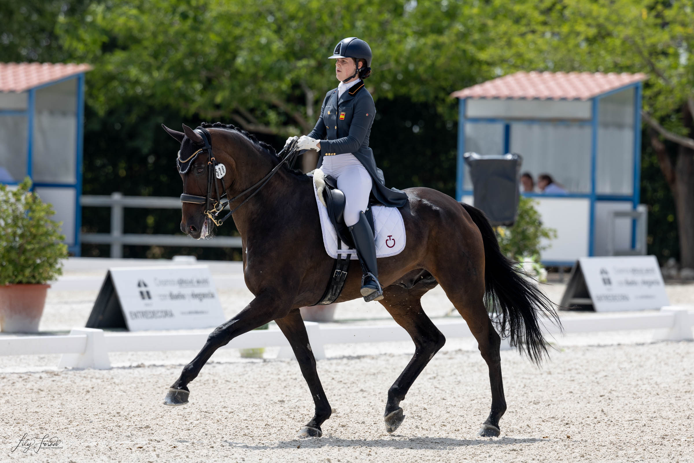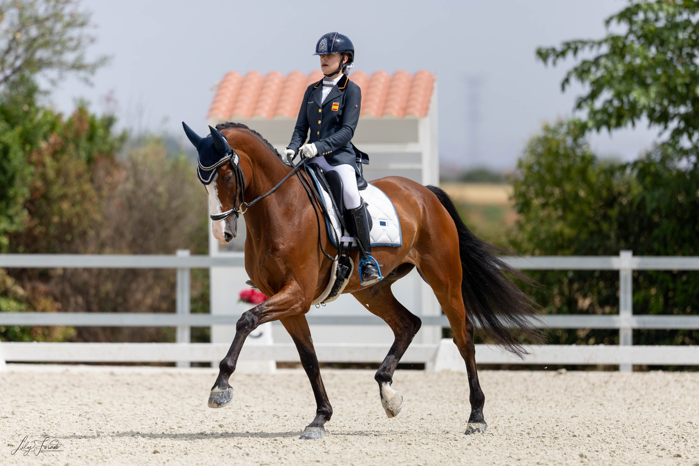 La pupila de Valvanera Palacios, Triana Vargas  selló su segunda victoria consecutiva dejando claro que viene a pelear por el metal dorado (78,759%%), aquel que ya ganó en 2023 en el nivel de Alevin. Con muy poco que perder y mucho que ganar, la alumna de Victor Álvarez, Ònia Maldonado a lomos de Dinky Toy Van Het Bloemenhof    fue a por todas. Dicho y hecho ha escalado cuatro posiciones comparado con la primera jornada gracias a su potente 78.066. La tercera posición ha sido para el finalista europeo, el jinete murciano Alejandro Navarro con su yegua Inquieta FSR y un acumulado de 76.142. Su nota pudo ser mayor, pero tuvo una imprecisión en una de las transiciones descendientes de Galope a Paso.