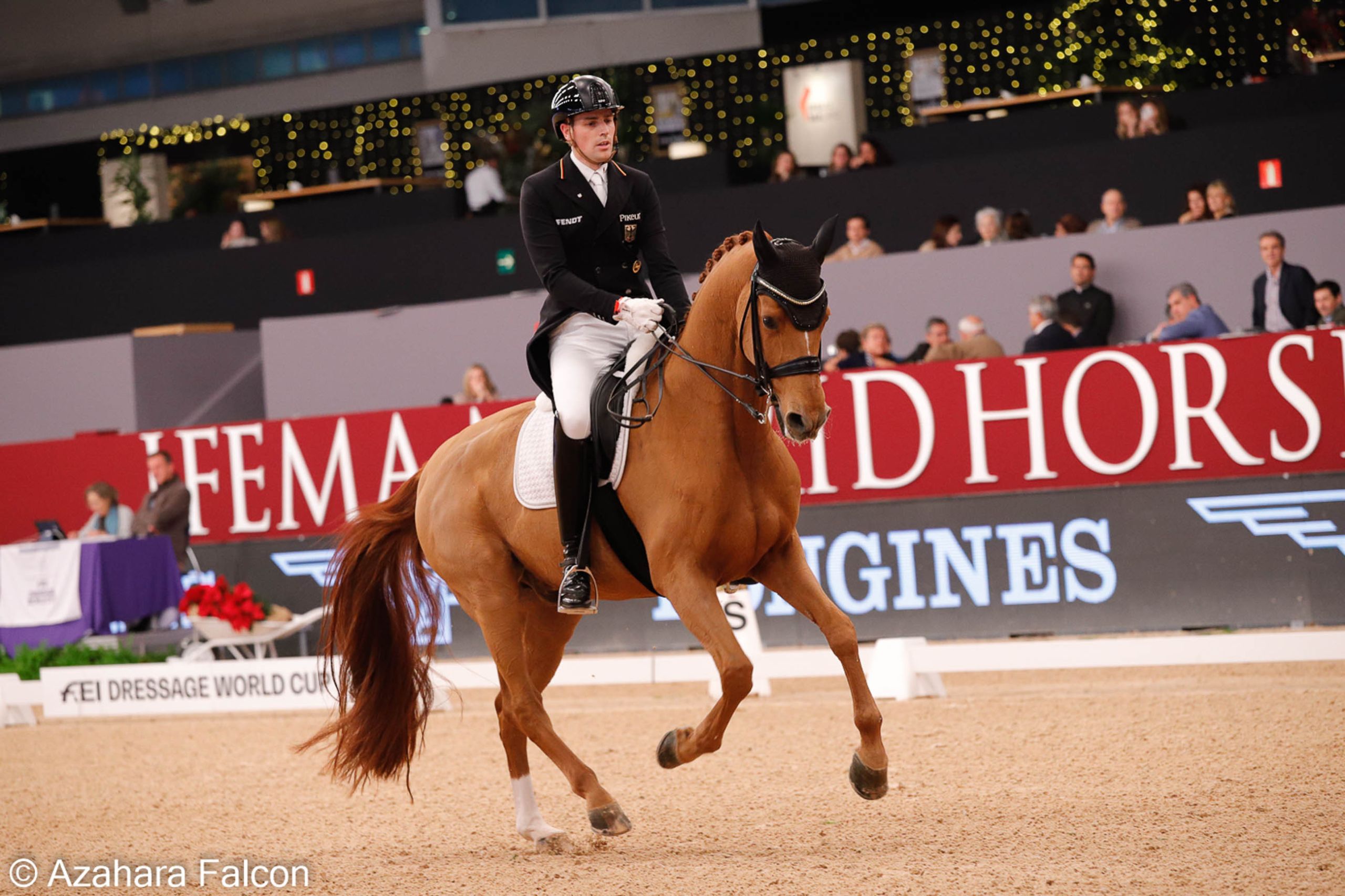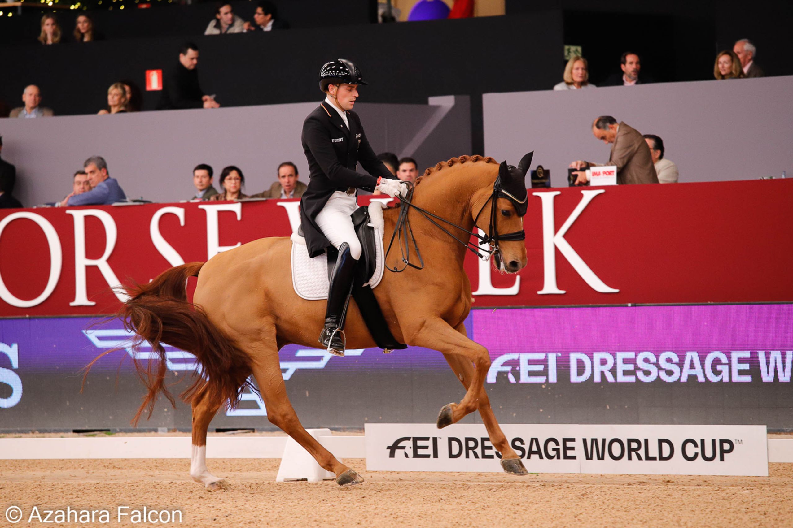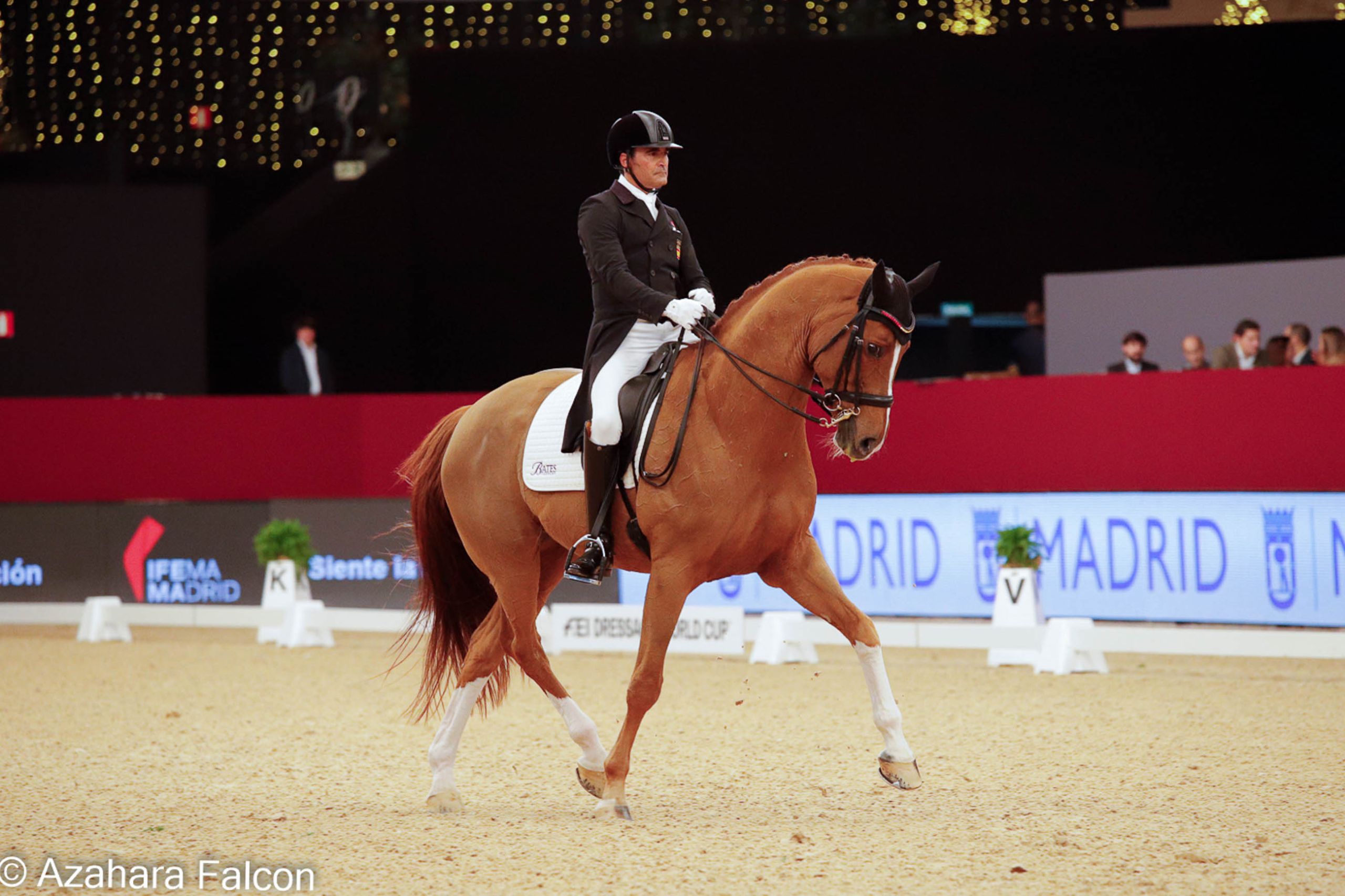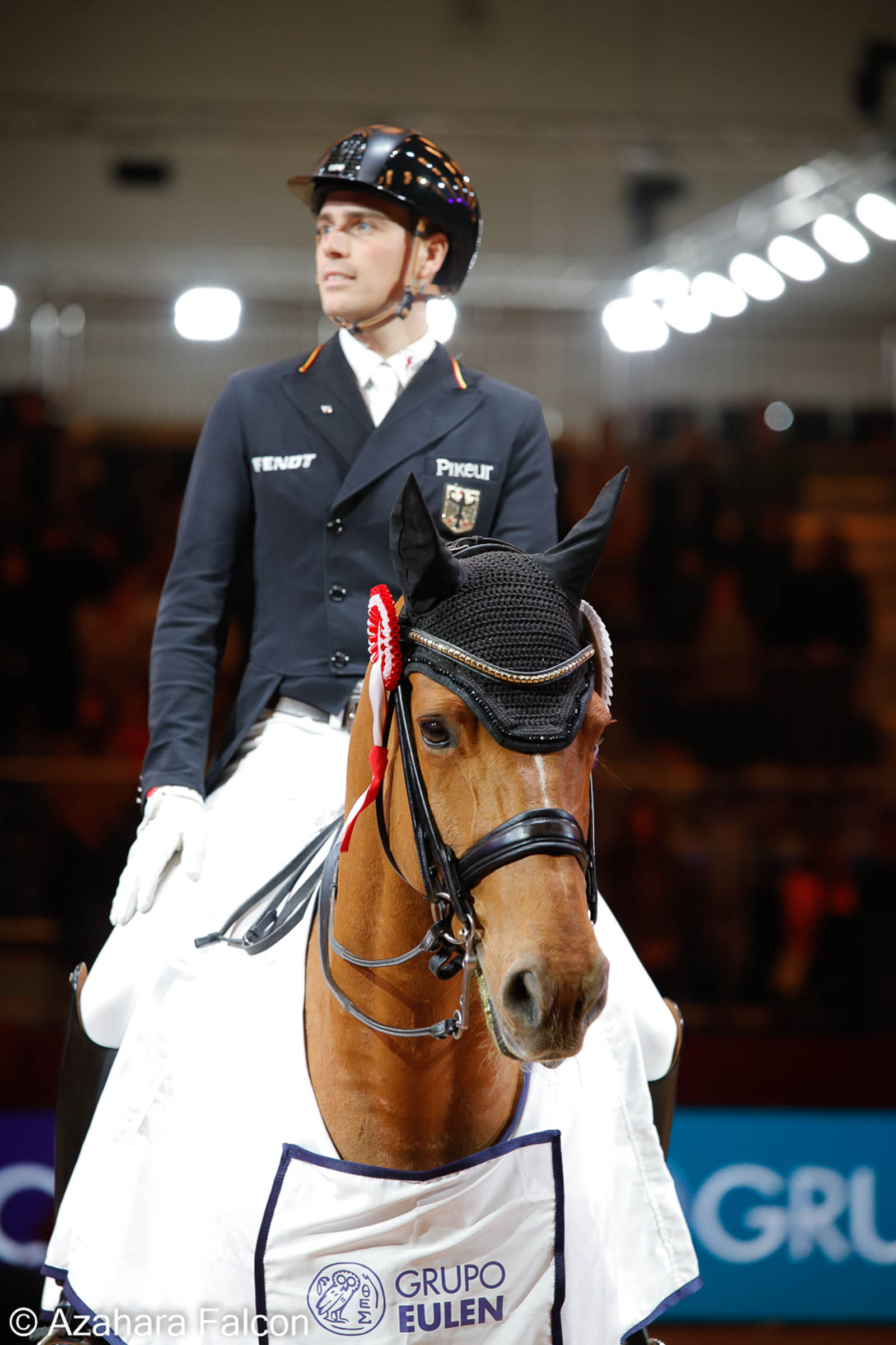 El vigente líder del ranking de la Liga Occidental de la Copa del Mundo, el alemán Frederic Wandres cabalgó con su montura estrella, Duke of Britain FRH. El jinete central de Hof Kasselmann lleva una temporada de ensueño. Ya en Aachen brilló, pero este verano pudo cumplir su sueño de representar los colores de la bandera alemana en el Cto. del Mundo de Herning, donde se colgó la medalla de oro por equipos. Ayer en Ifema, el duo alemán brilló con luz propia. Frederic fue encadenando los ejercicios con gran facilidad, armonía y sobre todo calidad. Siendo el único en superar el 75%, su nota final de 77.152 % lo situó en la cima y nadie pudo hacerle frente.