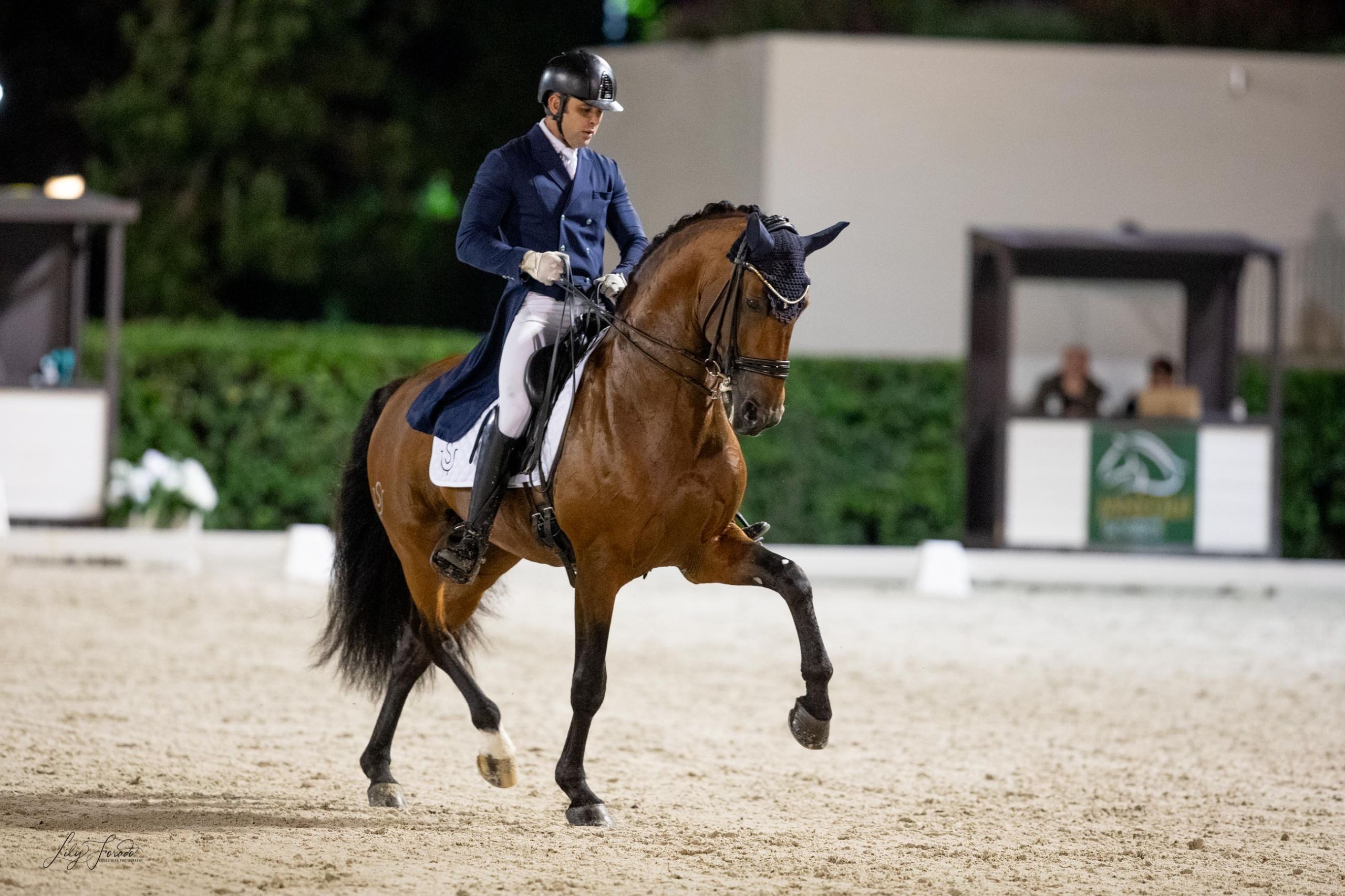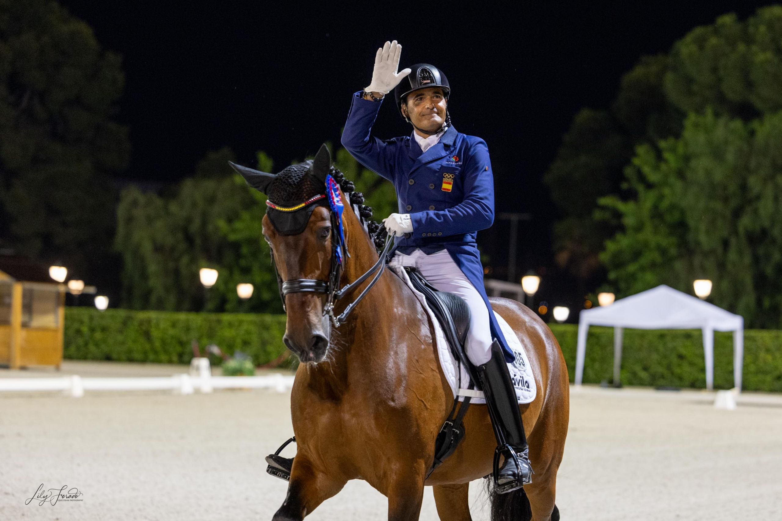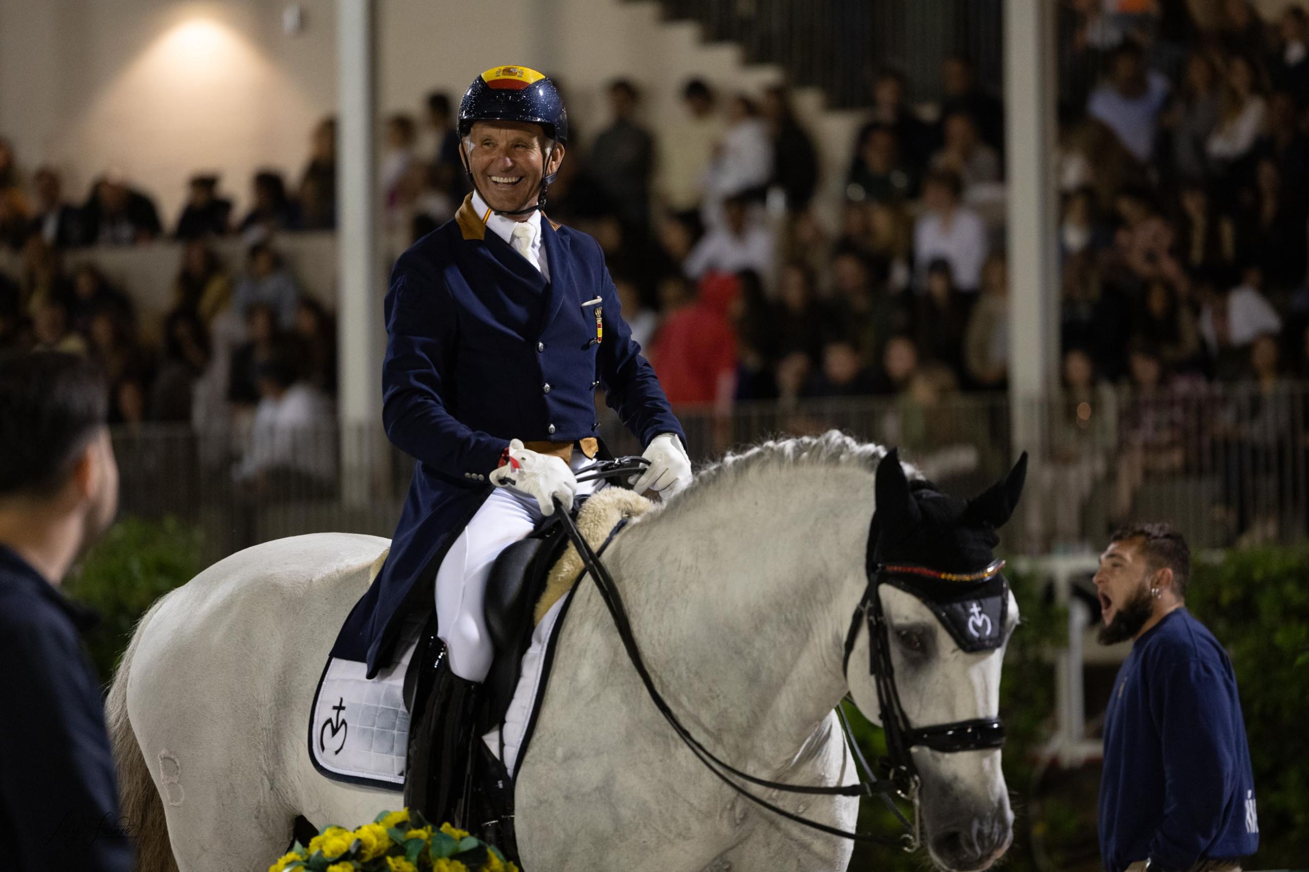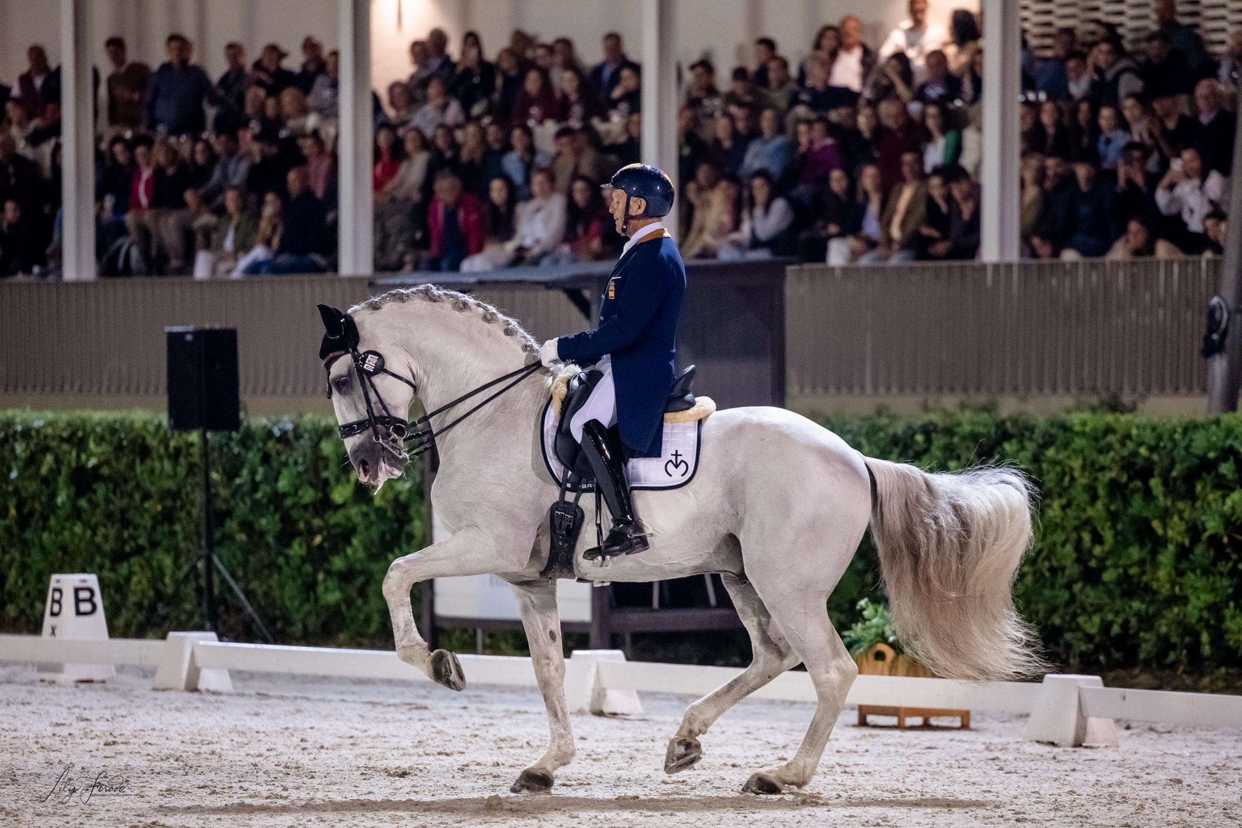Juan Antonio Jiménez con el buque de insignia de Yeguada Las Morerias fue el penúltimo en competir. Ejecutando su famosa freestyle de “Rafael” firmaron una prueba de esas que te quitan el aire. Con una entrada triunfal al son de “Digan lo que digan los demás” arrancó su baile con un círculo cambiando cada dos trancos. Dicho du duo de baile brilló en las dobles piruetas al galope, cambios al tranco y sobre todo en el tramo final, con la pirueta de piaffe al ritmo de las melodías de “Escándalo”. Sus batidas fueron apoteósicas a nivel de cadencia y sobre todo reunión. El elenco de jueces premió dicha kur con un notable 78.390 y lo situó detrás de Dockx.