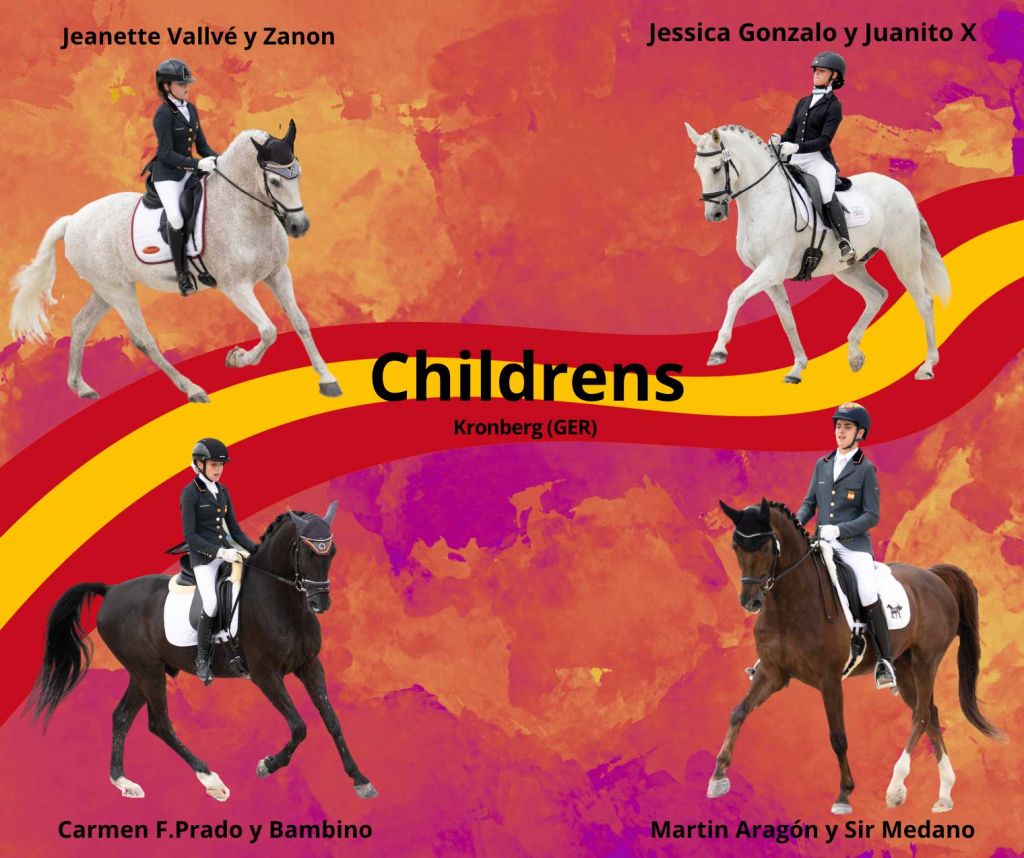 El cuadro de Infantiles cuenta con grandes bazas. Las finalistas europeas Jeanette Vallvé como Carmen F.Prado tienen ya un rodaje en el cuadrilongo europeo. Jeanette cuenta con dos Oliva Nova 2021 y Budapest 2022, y Carmen con uno ( Budapest 2022). En cuanto a Martin Aragón su experiencia europea en Ponis (2022) la va plasmar con su maestro Sir Medano ( caballo que estuvo en el Cto. de Europa de Juveniles en 2018 con Alvaro Perdomo). Jessica Gonzalo que esta temporada ha batido récord tras récord forma parte de este cuarteto europeo y por primera vez cabalgará con la bandera española en la chaqueta.