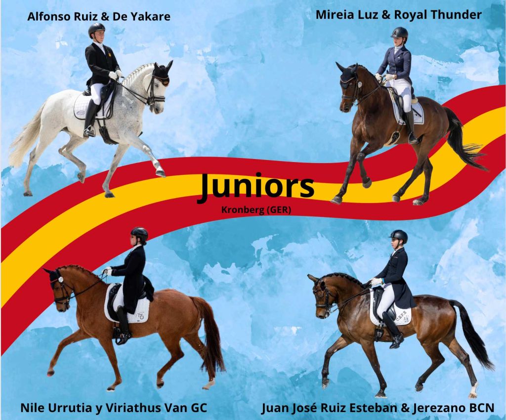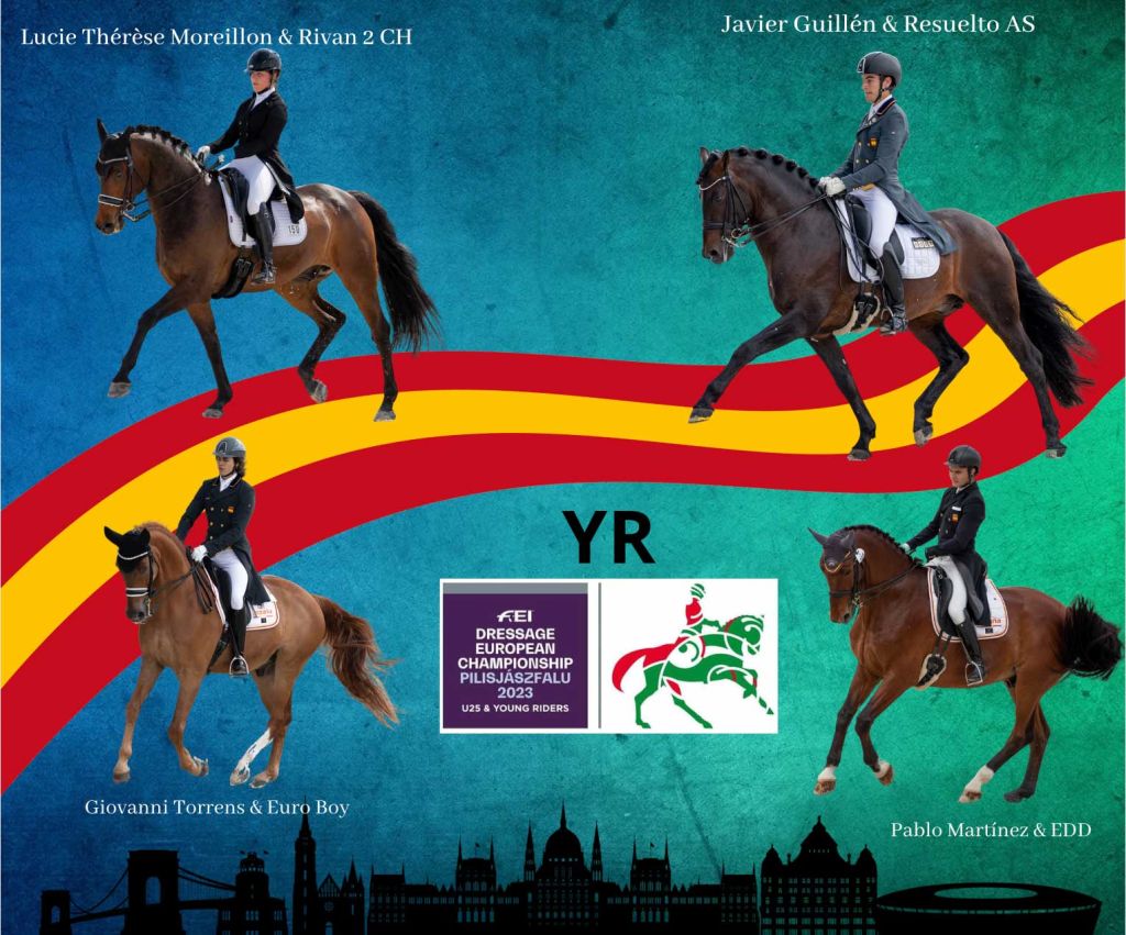 En este cuarteto contamos con la experiencia de Javier Guillén con Resuelto AS, que siendo su primera temporada en Jóvenes Jinetes cabalgará por su cuarto europeo: el primero fue fallido siendo el de Budapest en 2020, el segundo fue Oliva Nova de 2021(JR) y el tercero fue el año pasado en Hartpury (JR). Giovanni Torrens continúa con su camino europeo, y esta temporada junto a Euro boy sigue de nuevo en las filas de selección. Su primera experiencia fue el año pasado en Hartpury. Tanto para Lucie Thérèse ( amazona afincada en Suiza), como para Pablo Martínez cabalgaran por primera vez en el cuadrilongo europeo representando los colores de la bandera española.
