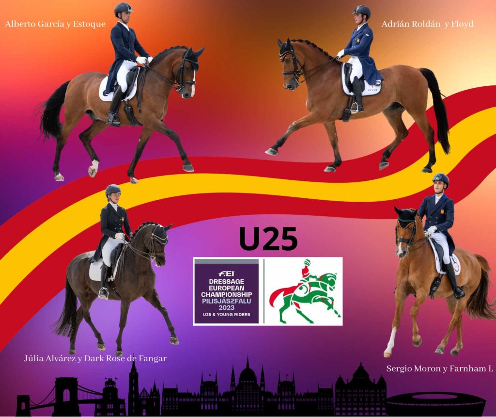 En cuanto a Júlia Álvarez, la pupila de Beatriz Ferrer-Salat volverá a cabalgar con su bailarina Dark Rose de Fangar en un cuadrilongo Europeo. Su primera vez fue en 2018 en el nivel Juveniles en Fontainebleau, donde se situó entre las 18 mejores. Junto con Dark competirá en su cuarto Campeonato de Europa ( Fontainebleau 2018 (JR), Budapest 2020 (YR) y Oliva Nova (2021). En la misma línea, Sergio Morón con su inseparable Farnham L, ha escalado todos lo niveles FEI de menores y pone rumbo a lo que será su sexto campeonato (Hartpury 2022 (YR), Oliva Nova 2021 (YR), Budapest 2020 (YR), San Giovanni 2019 (JR) y Fontainebleau 2018 (JR). En cuanto a Adrián Roldán , finalista europeo de 2022, es aquel que cuenta con más experiencia en el nivel puesto que este será su tercer campeonato en el nivel de U25 (Hagen 2021, Budapest 2022) y su quinto europeo en general ( Rosendaal 2017 (JR), Fontainebleau 2018 (YR). De la experiencia pasamos a Alberto García Abela que claramente ha sido la gran sensación esta temporada. El medallista del año pasado, ha debutado este año en nivel internacional y sus éxitos no han cesado , de allí su selección para lo que será su primer Campeonato de EUROPA.