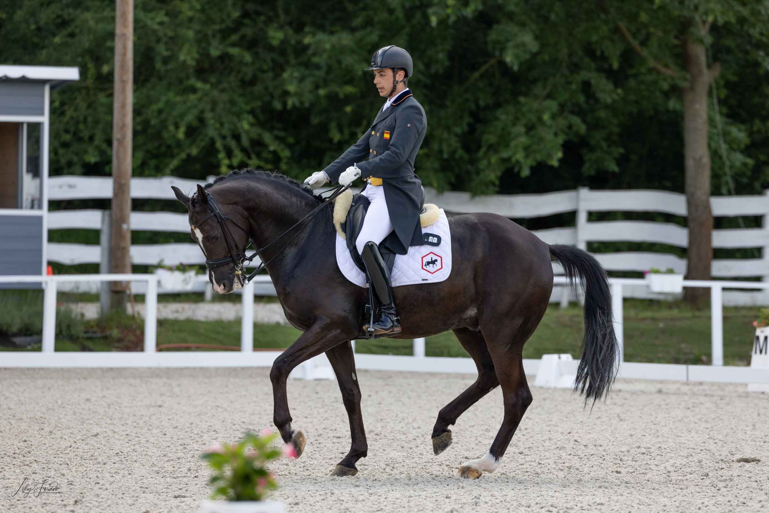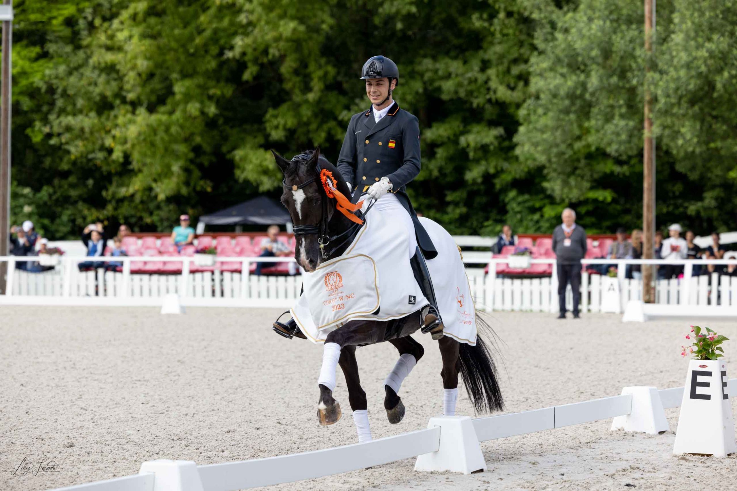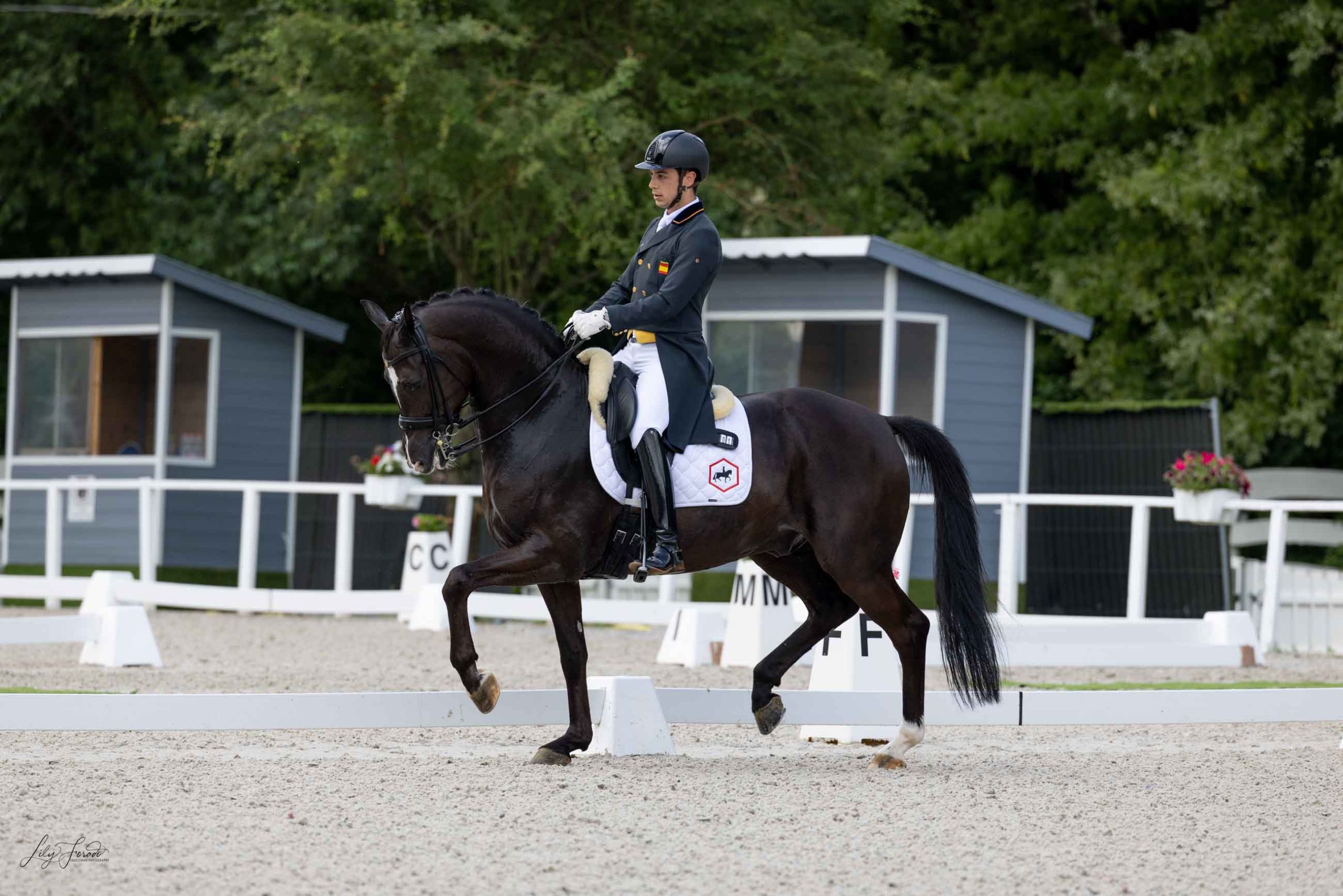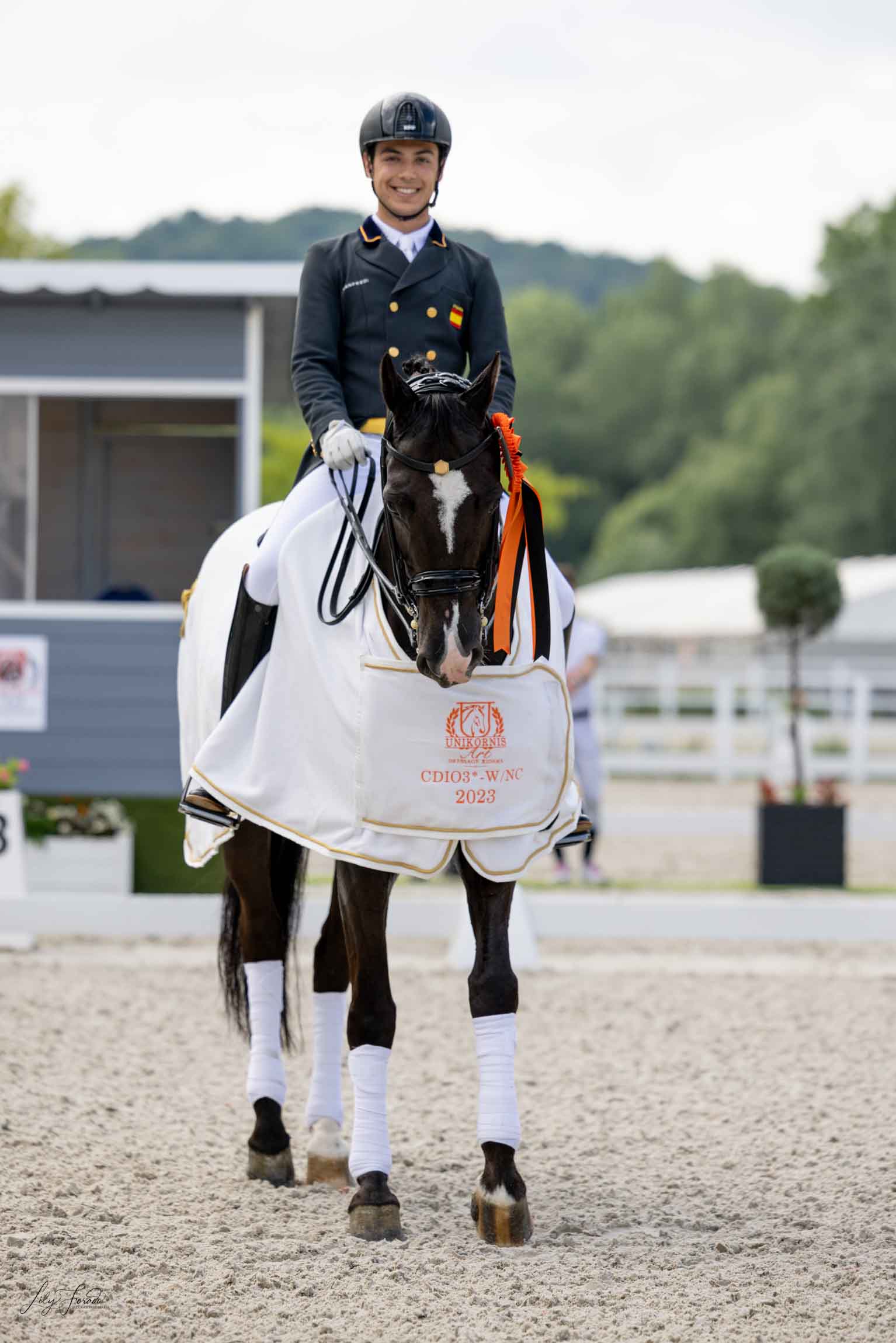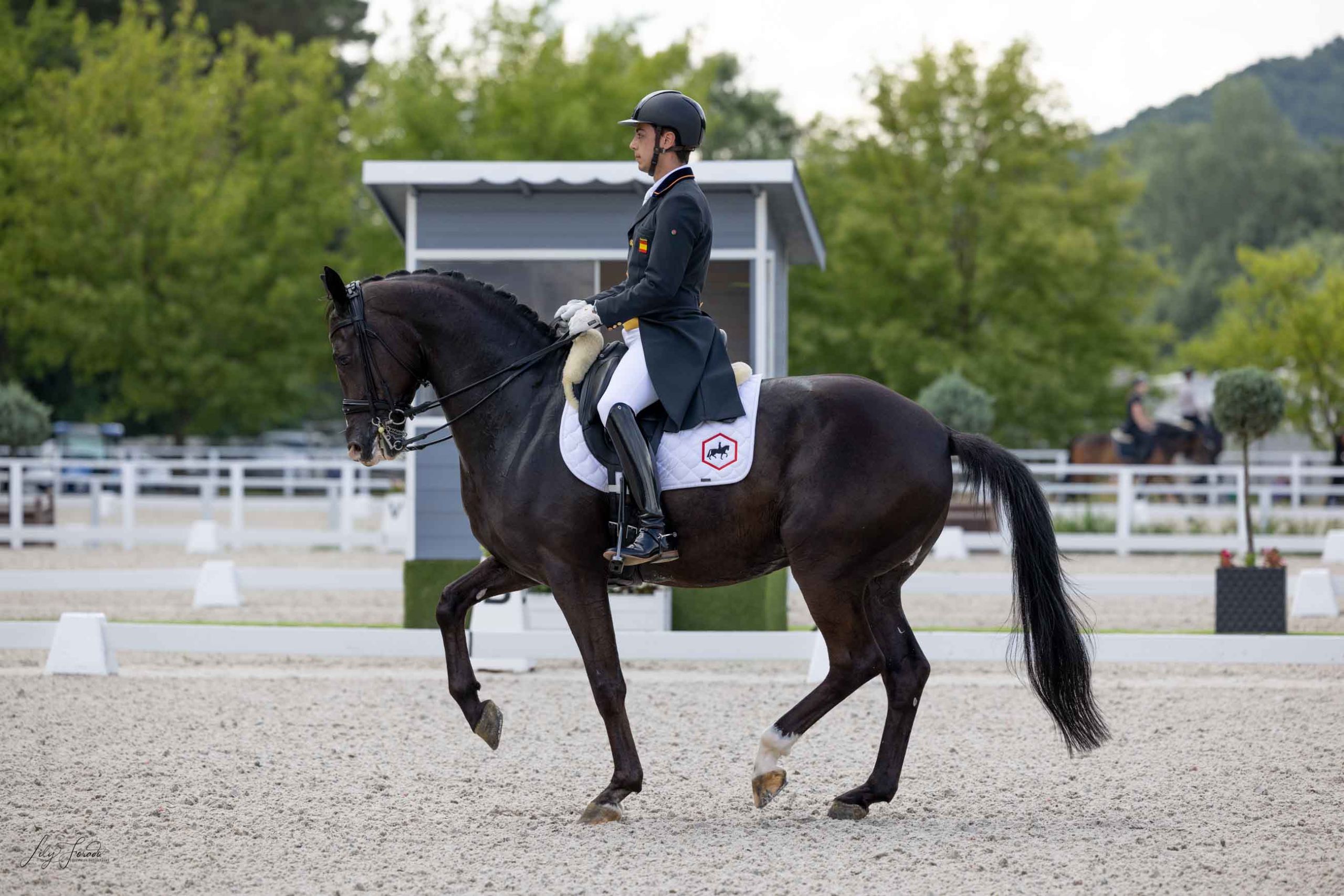 Dejando de lado la Copa de Naciones, hoy se ha disputado un CDIW. De los seis participantes, Sergio García con Hexagon’s Innuendo ha cerrado el podio en su primer concurso de la Copa del Mundo. Junto a su gran compañero de hazañas, Hexagon’s Innuendo, aquel con el formó parte del cuarteto europeo a nivel U25 en 2021, con el que se situó en el top 3 en el ranking FEI de U25 y con el primero caballo que ha roto el hielo en el nivel absoluto, hoy ha realizado su primer GP de CDIW. Toda la parte del trote ha sido muy fluida y elegante cuyo marcador giraba entorno al 70% , no obstante en el primer piaffe el caballo mostró resistencia y las notas se dispararon hacia abajo. Sergio mantuvo la calma y corrigió in situ, pero las notas descendieron.