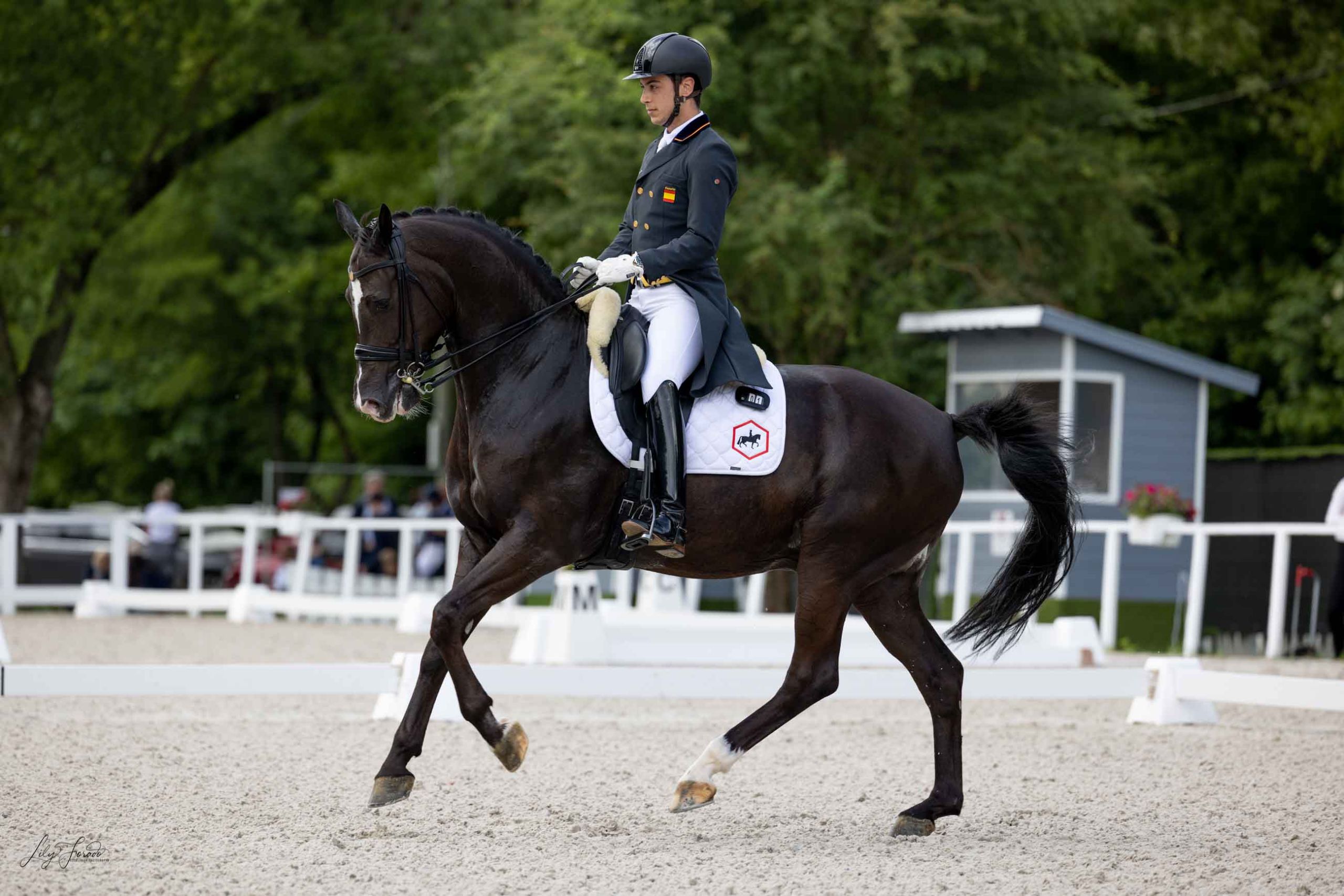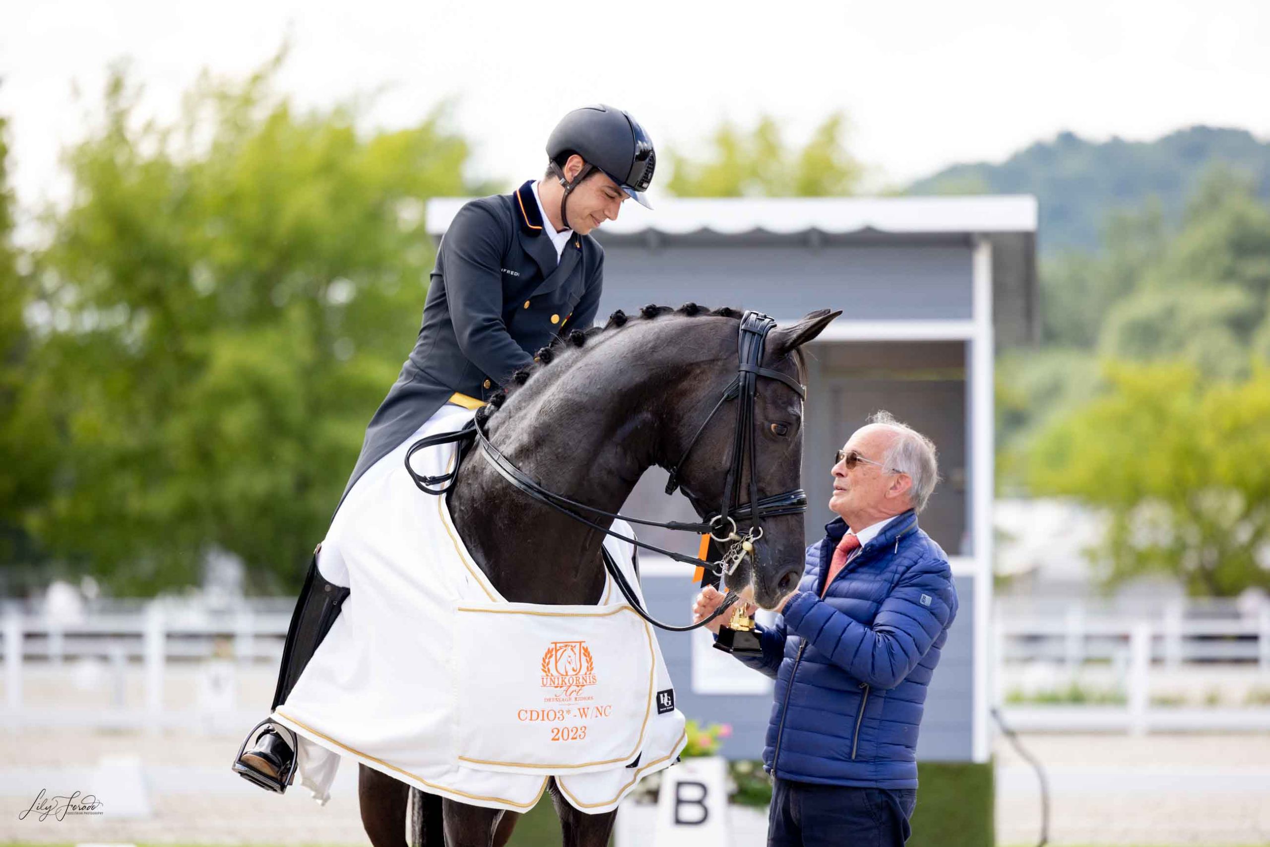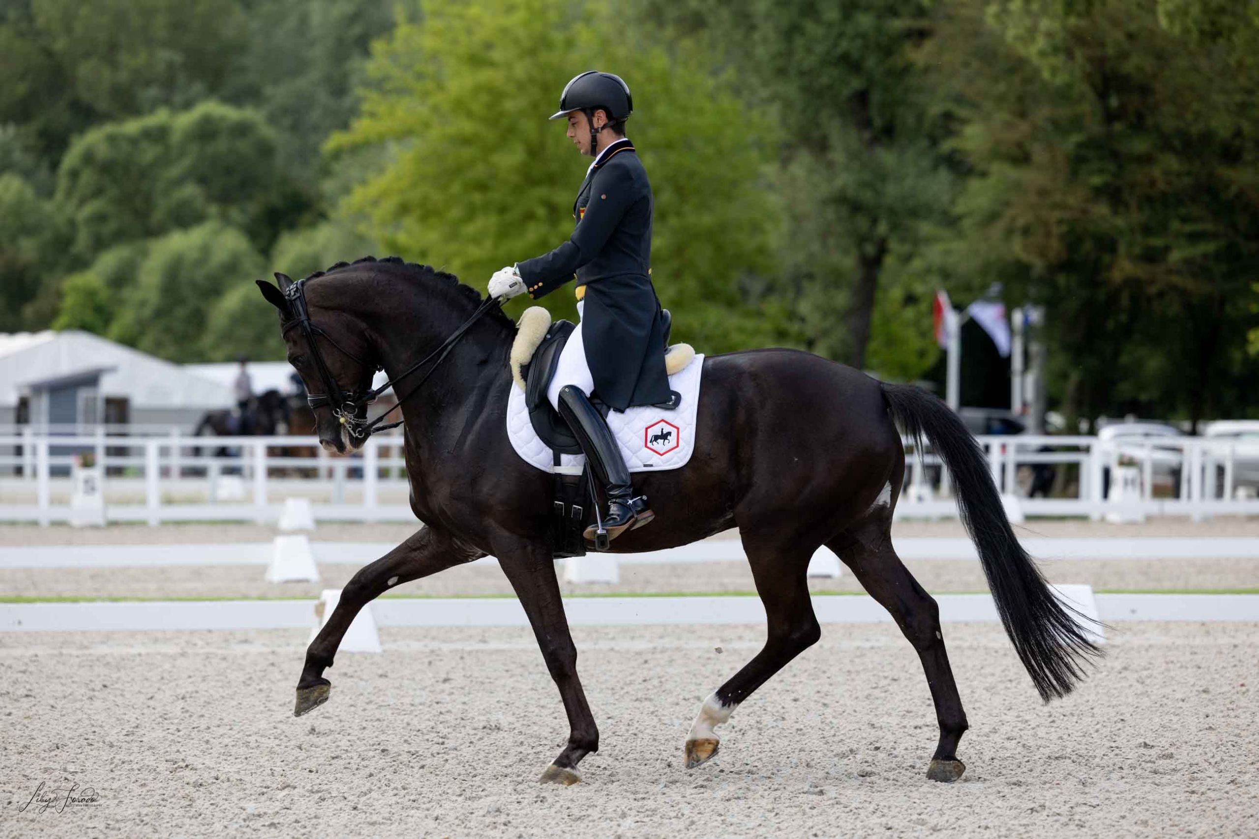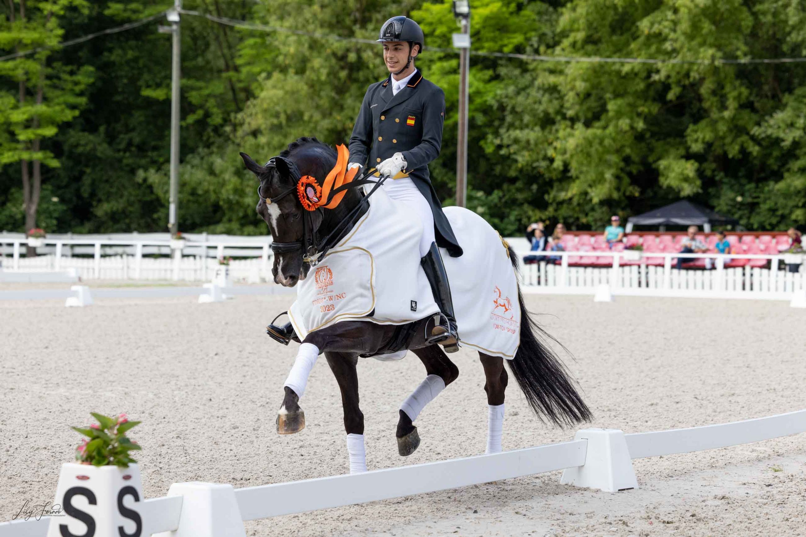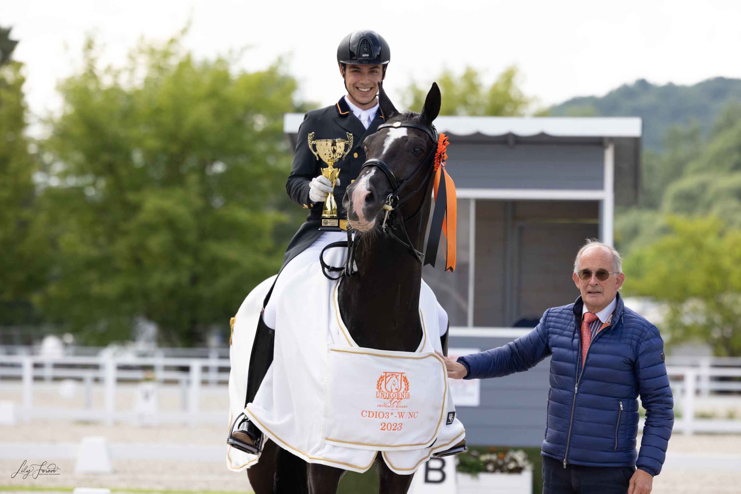 Dejando de lado la Copa de Naciones, hoy se ha disputado un CDIW. De los seis participantes, Sergio García con Hexagon’s Innuendo ha cerrado el podio en su primer concurso de la Copa del Mundo. Junto a su gran compañero de hazañas, Hexagon’s Innuendo, aquel con el formó parte del cuarteto europeo a nivel U25 en 2021, con el que se situó en el top 3 en el ranking FEI de U25 y con el primero caballo que ha roto el hielo en el nivel absoluto, hoy ha realizado su primer GP de CDIW. Toda la parte del trote ha sido muy fluida y elegante cuyo marcador giraba entorno al 70% , no obstante en el primer piaffe el caballo mostró resistencia y las notas se dispararon hacia abajo. Sergio mantuvo la calma y corrigió in situ, pero las notas descendieron.