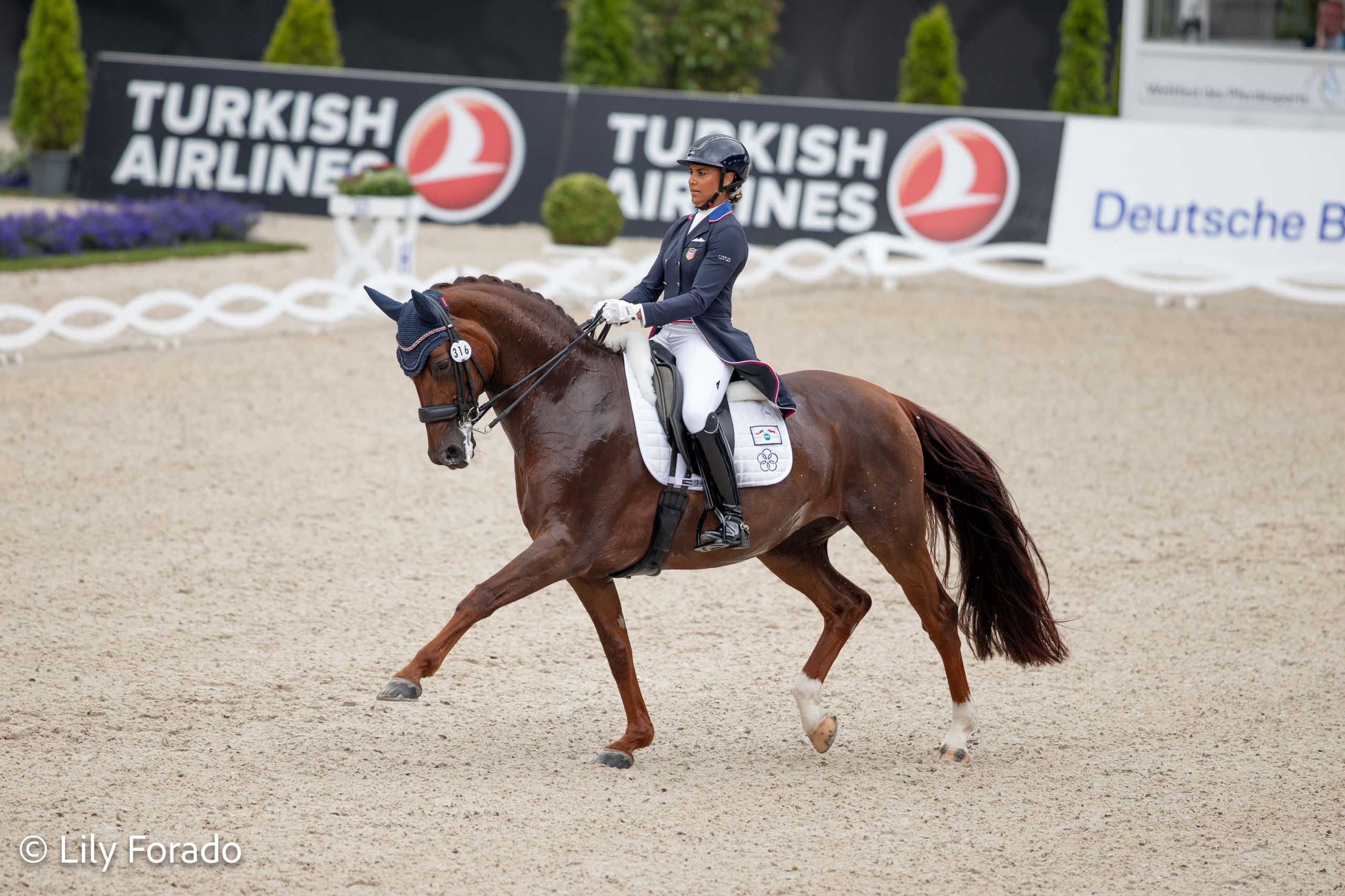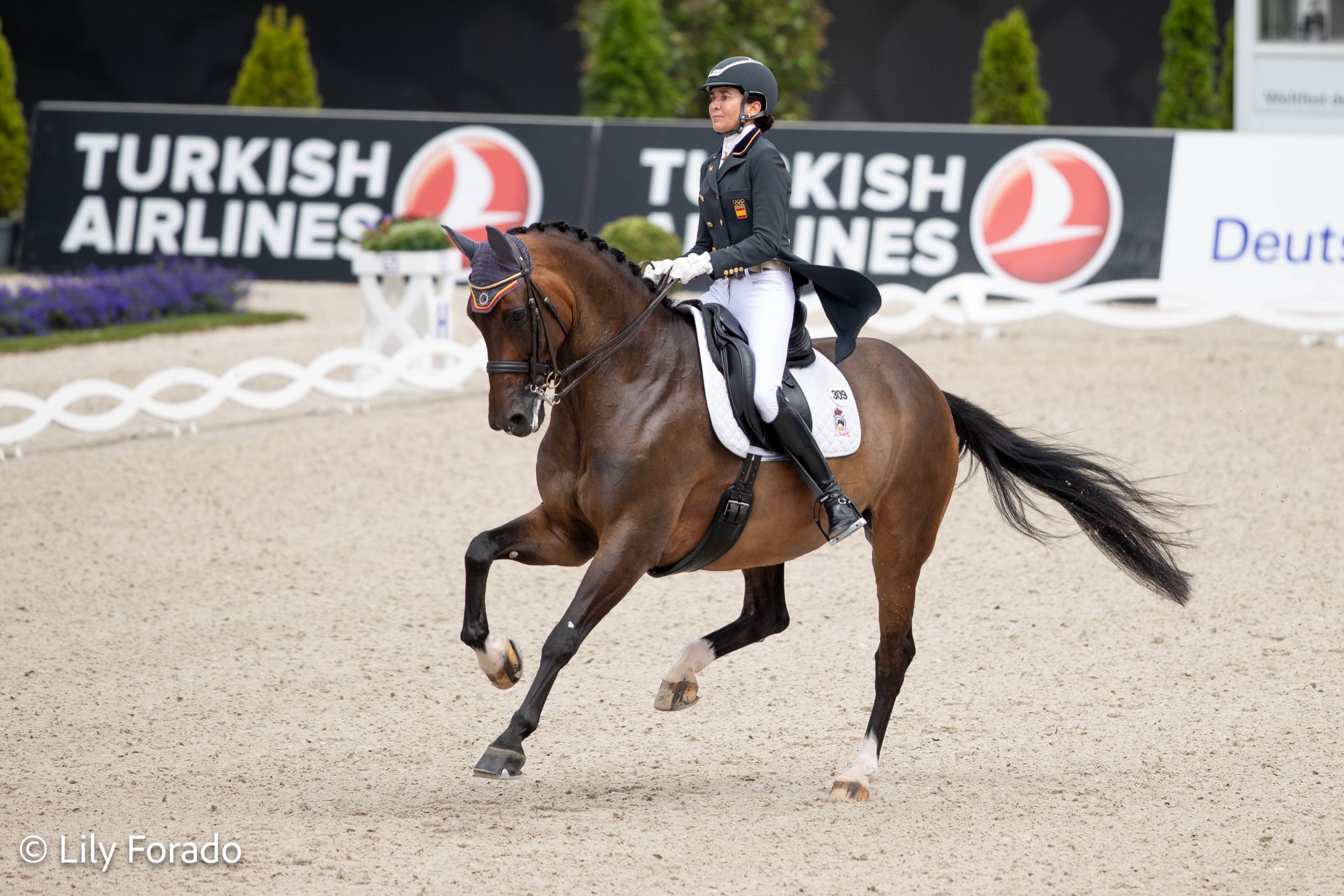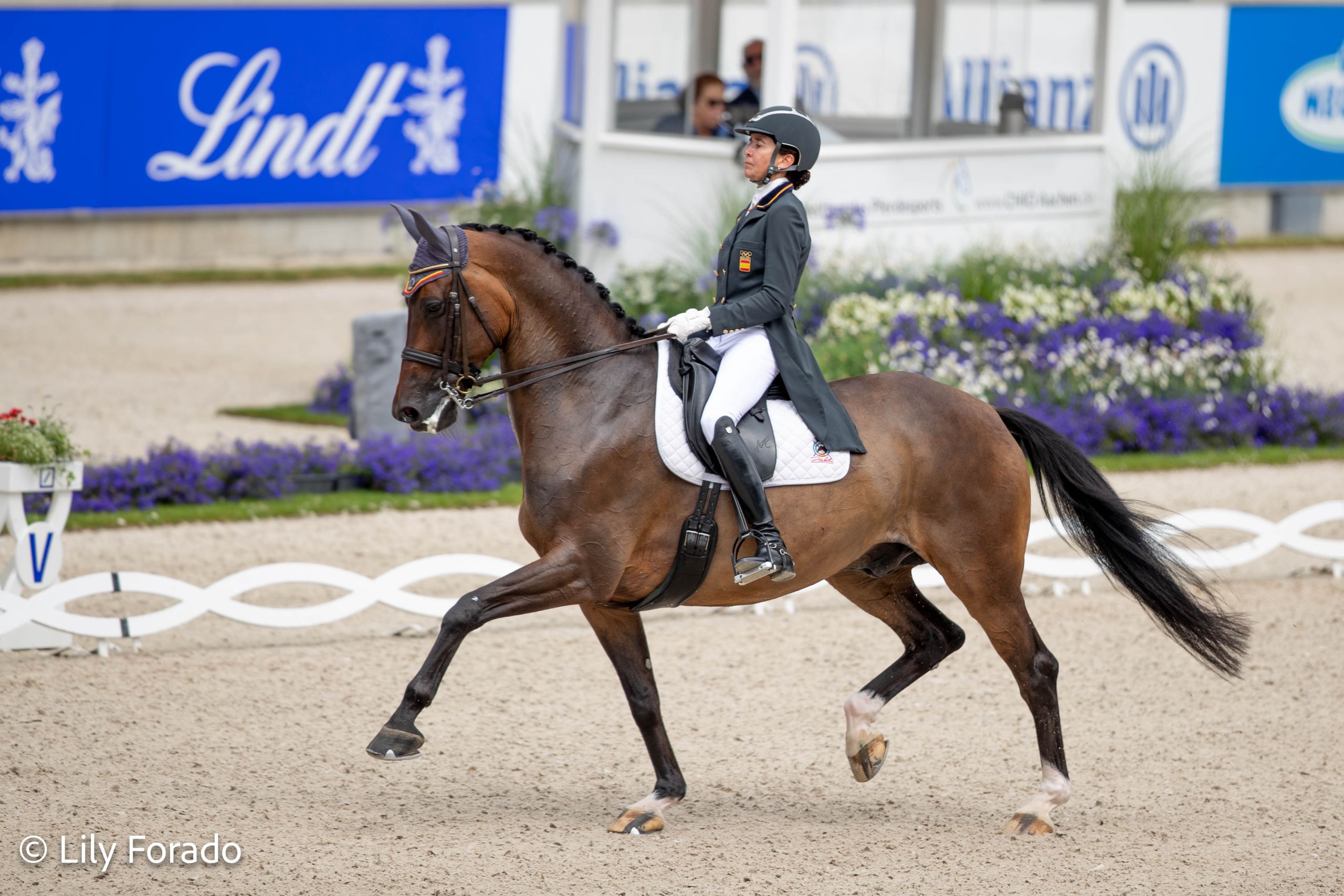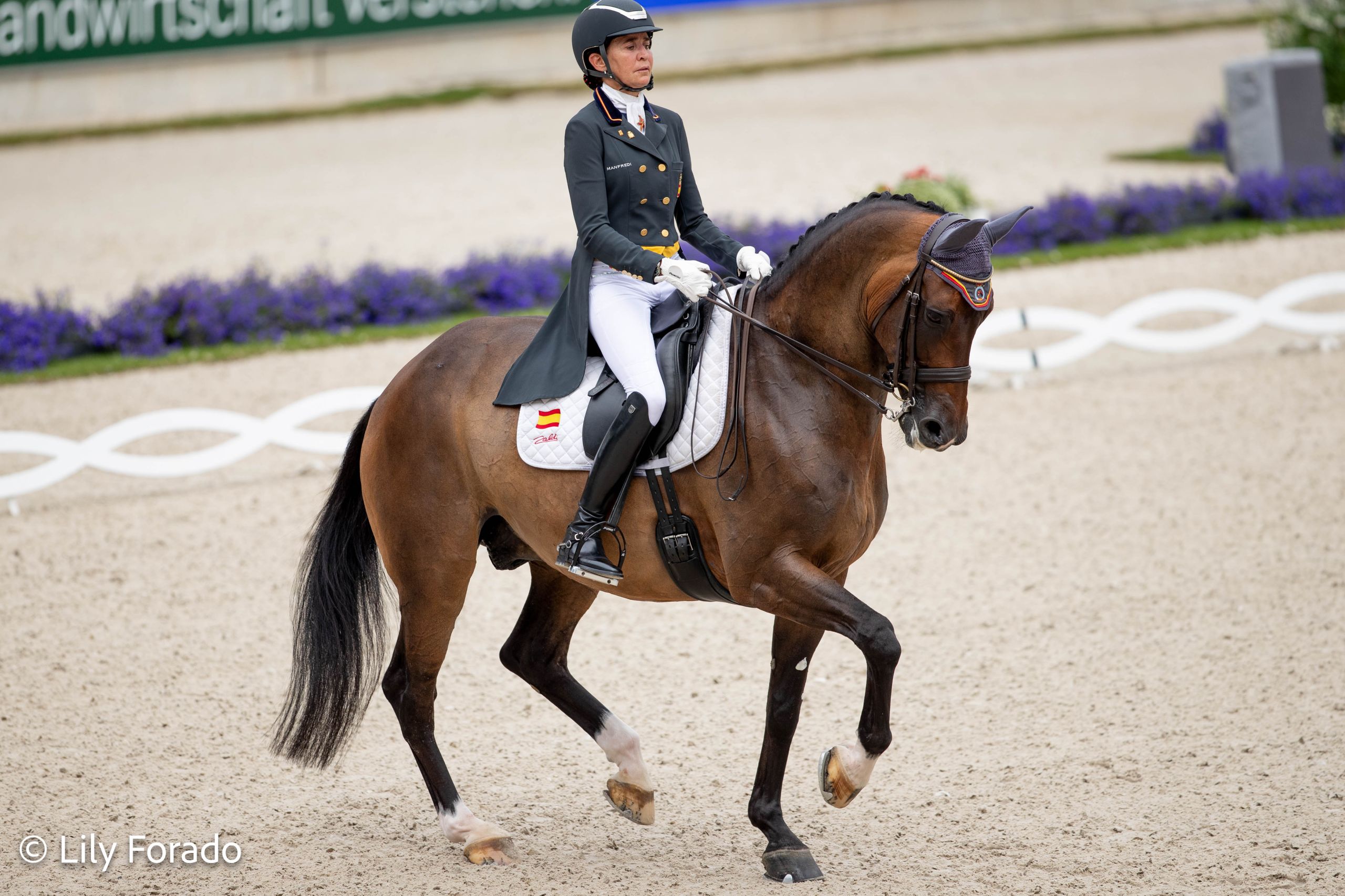 Beatriz Ferrer-Salat fue la última en representar los colores españoles. 2019 fue la última vez que cabalgó en el emblemático cuadrilongo alemán con Delgado y años después vuelve con su gran baza, Elegance. Hoy el hijo de Negro se ha mostrado más eléctrico, de hecho muy abrumado por el escenario en sí. Beatriz con todos sus medios montó como una campeona y peleó cada tranco, pero Elegance “estaba pasado de revoluciones” con mucha tensión. Varias imprecisiones en ciertos ejercicios sobre todo en el contraapoyo al galope, donde rompió el aire fue el detonante de su descenso de puntos. Su nota final fue de 68.587.
