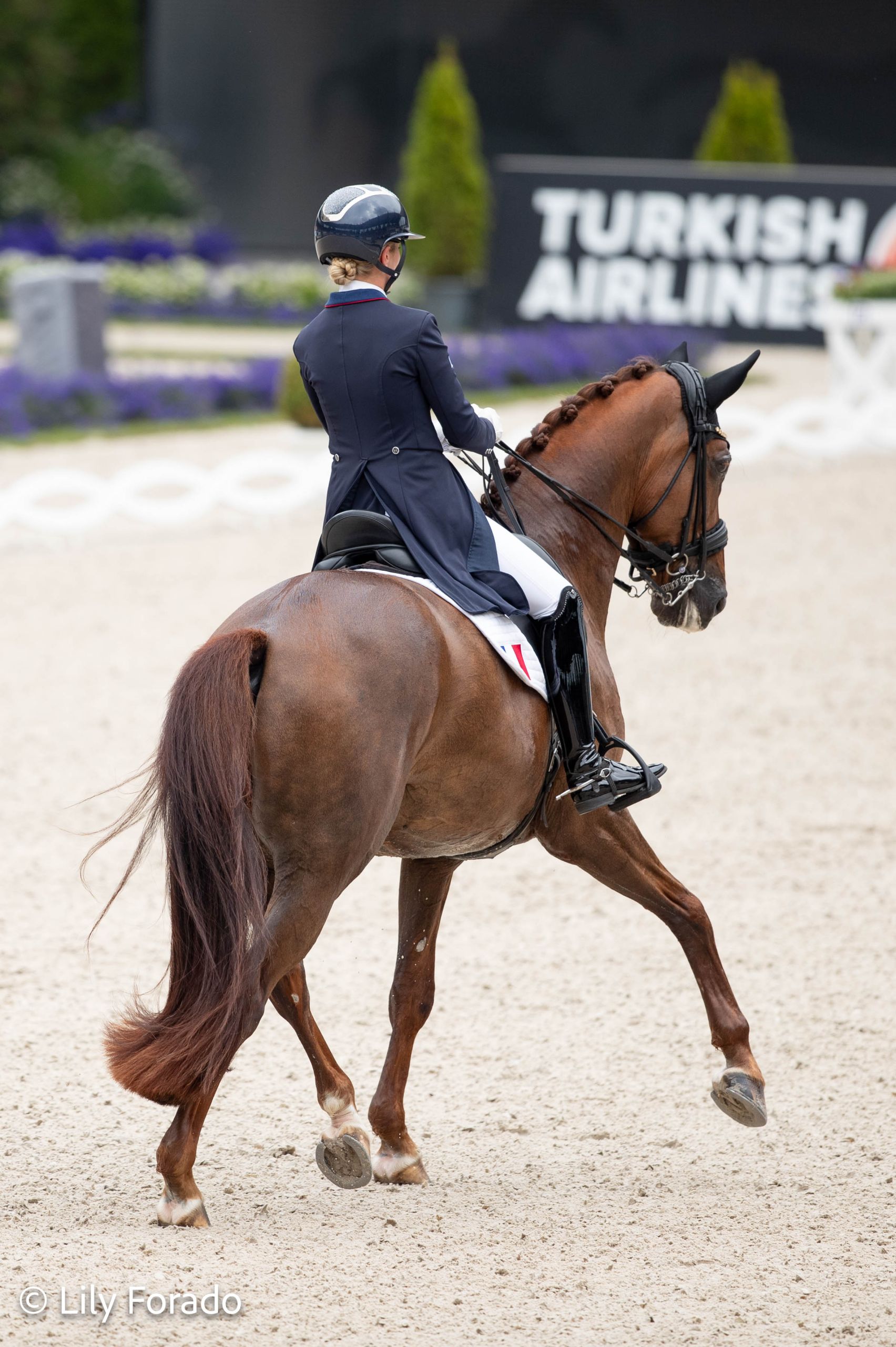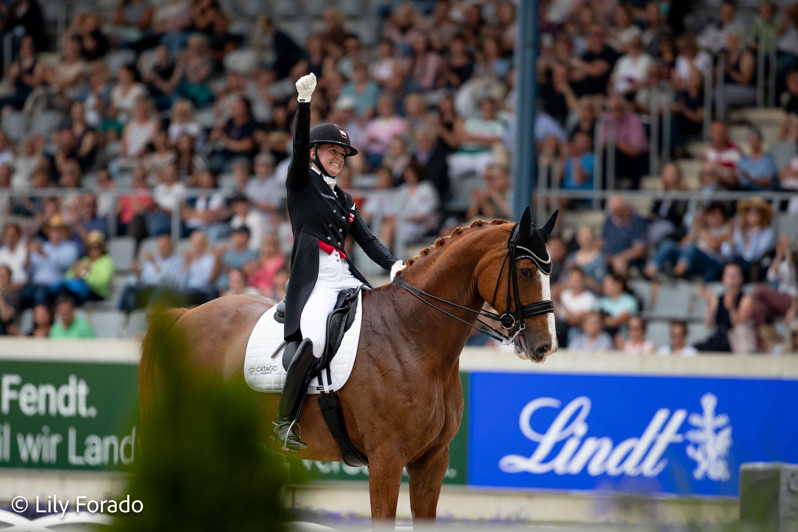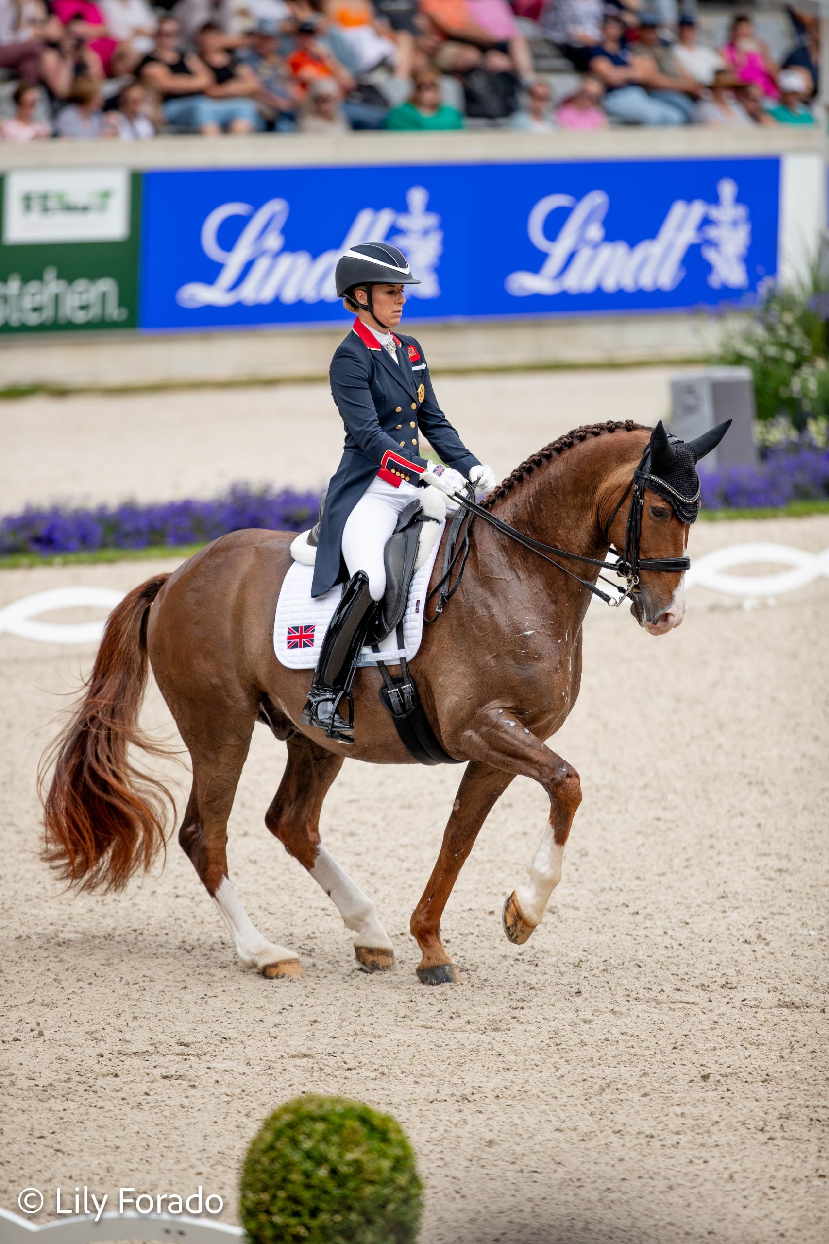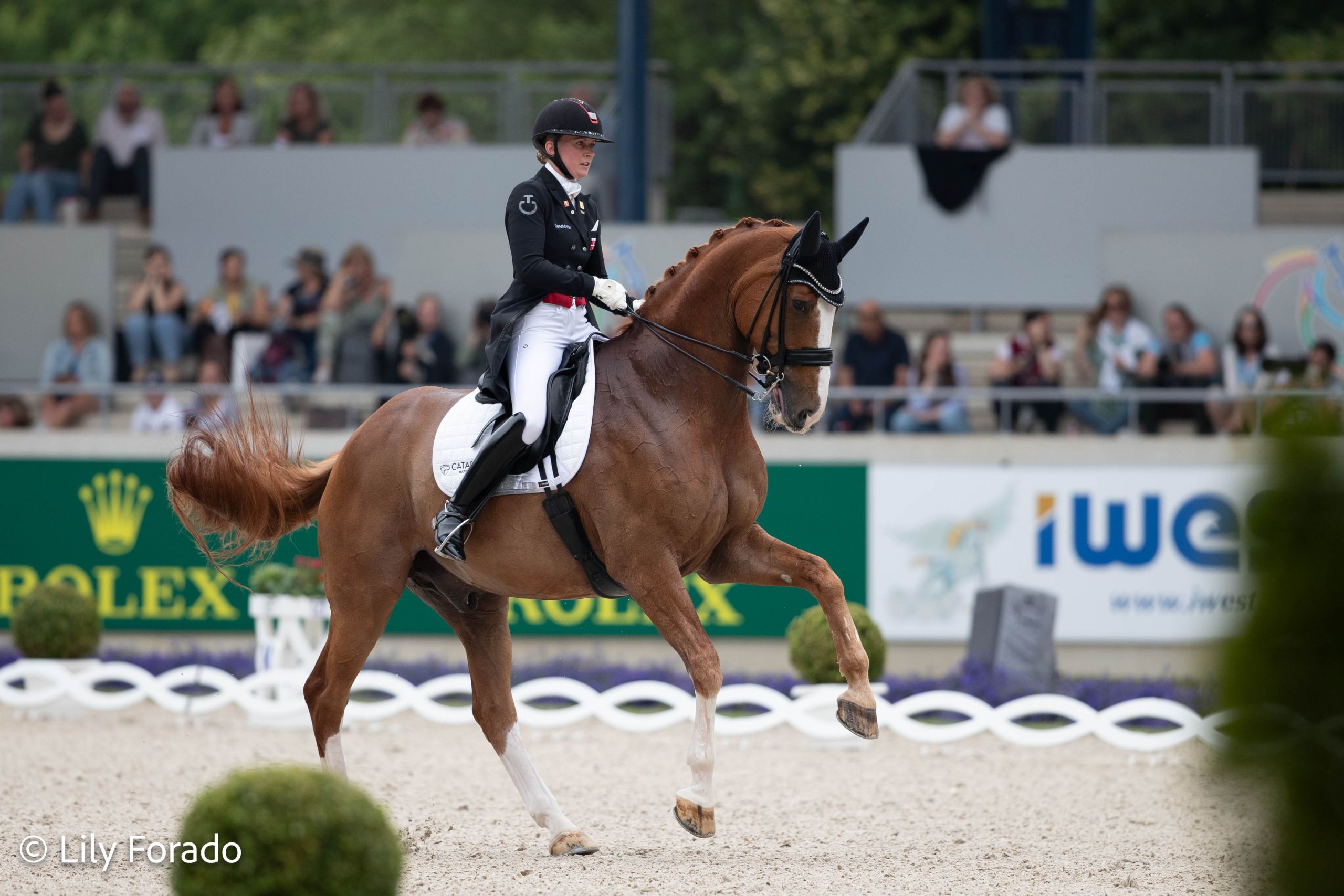 Beatriz Ferrer-Salat fue la última en representar los colores españoles. 2019 fue la última vez que cabalgó en el emblemático cuadrilongo alemán con Delgado y años después vuelve con su gran baza, Elegance. Hoy el hijo de Negro se ha mostrado más eléctrico, de hecho muy abrumado por el escenario en sí. Beatriz con todos sus medios montó como una campeona y peleó cada tranco, pero Elegance “estaba pasado de revoluciones” con mucha tensión. Varias imprecisiones en ciertos ejercicios sobre todo en el contraapoyo al galope, donde rompió el aire fue el detonante de su descenso de puntos. Su nota final fue de 68.587.