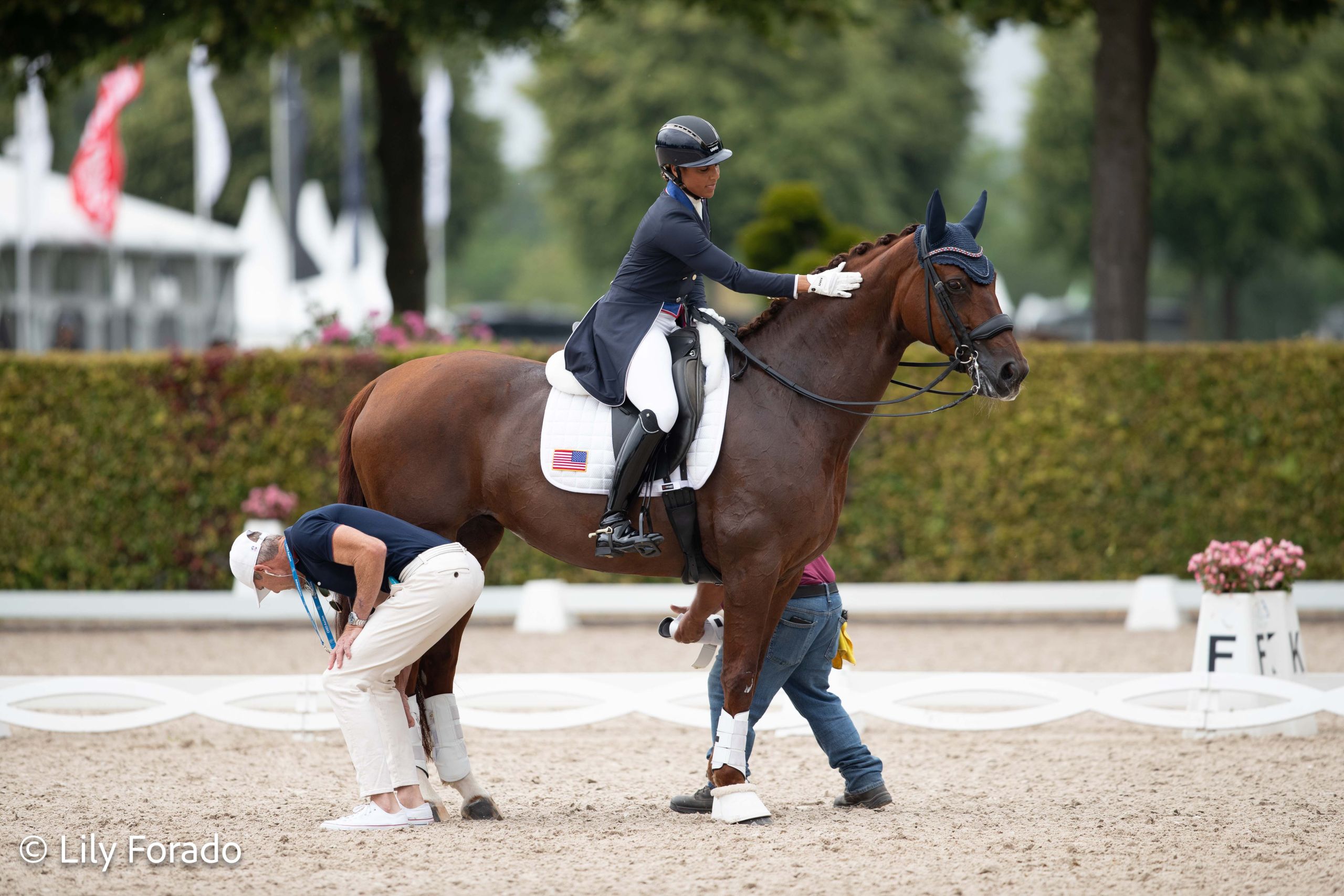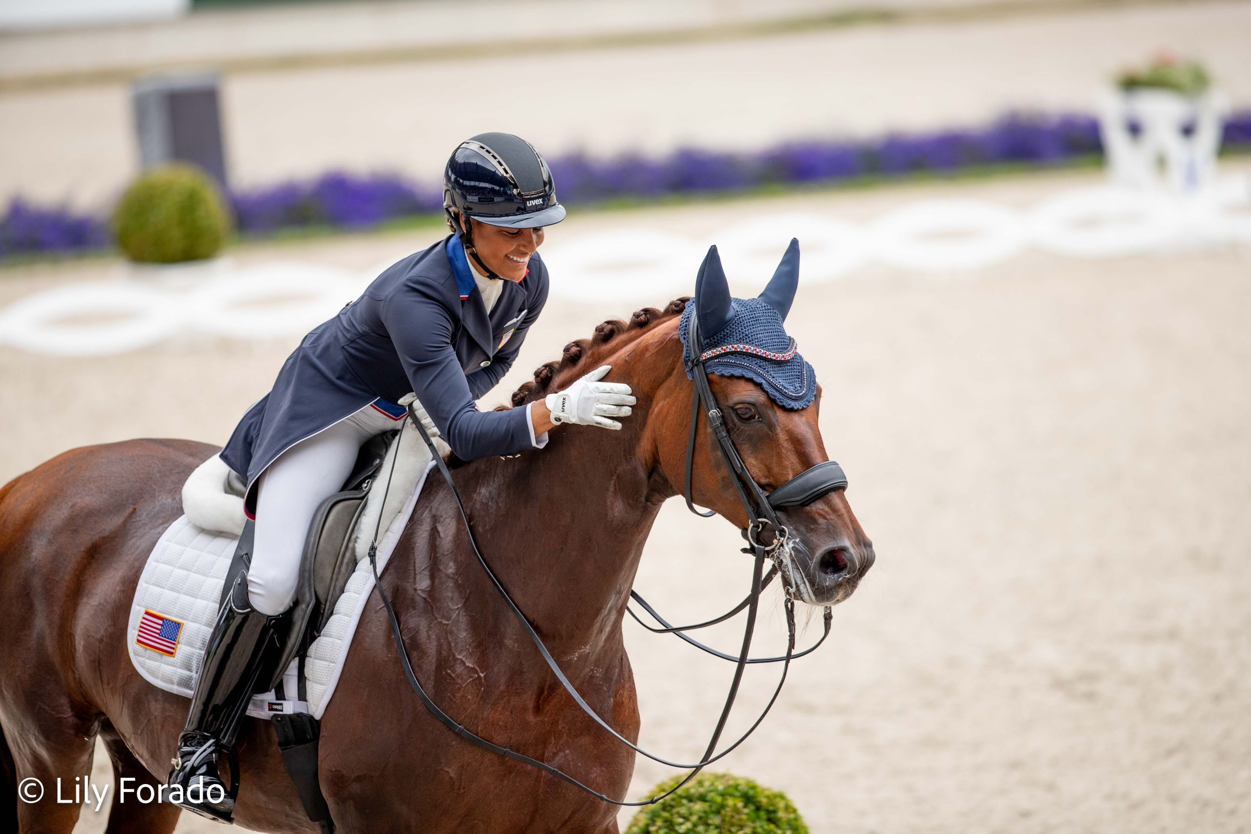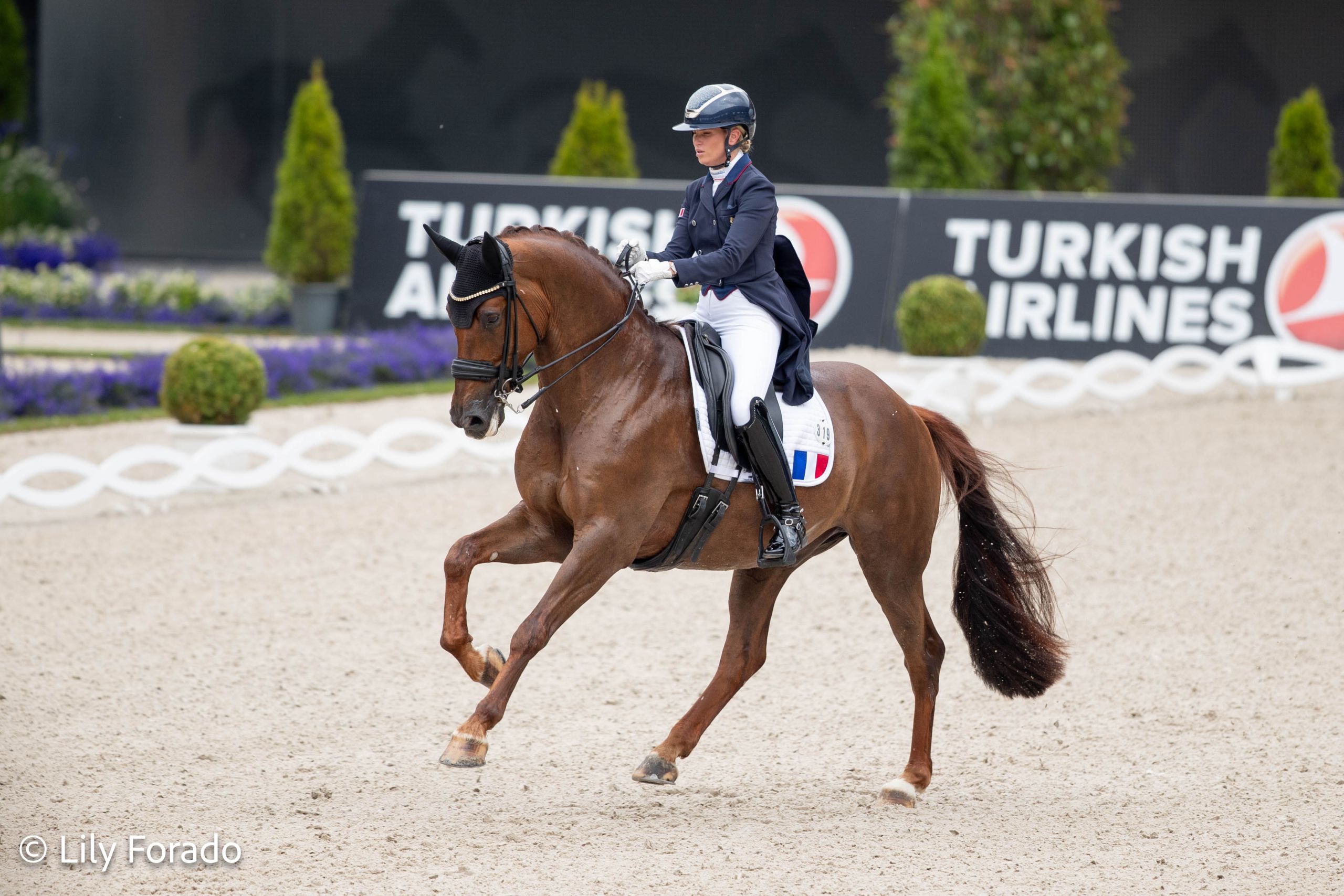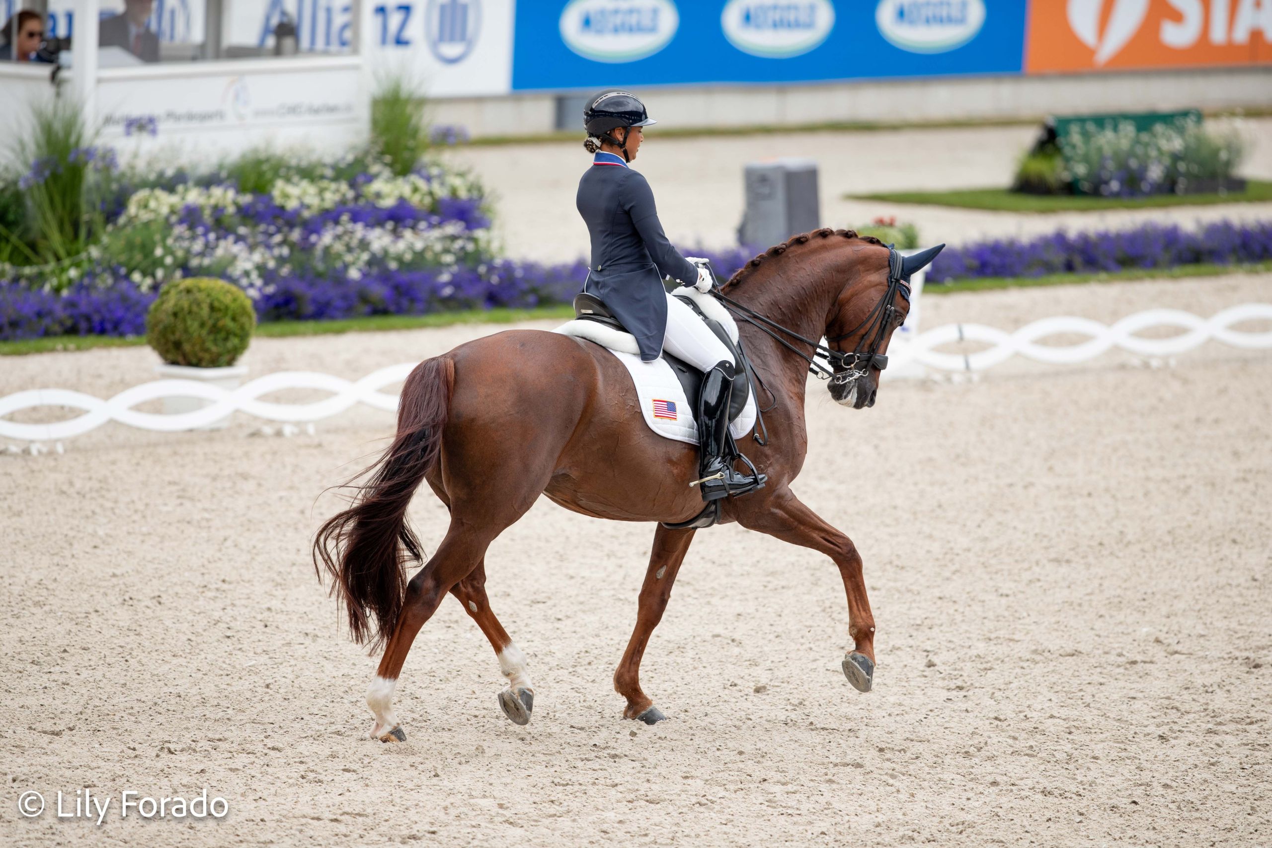 Beatriz Ferrer-Salat fue la última en representar los colores españoles. 2019 fue la última vez que cabalgó en el emblemático cuadrilongo alemán con Delgado y años después vuelve con su gran baza, Elegance. Hoy el hijo de Negro se ha mostrado más eléctrico, de hecho muy abrumado por el escenario en sí. Beatriz con todos sus medios montó como una campeona y peleó cada tranco, pero Elegance “estaba pasado de revoluciones” con mucha tensión. Varias imprecisiones en ciertos ejercicios sobre todo en el contraapoyo al galope, donde rompió el aire fue el detonante de su descenso de puntos. Su nota final fue de 68.587.