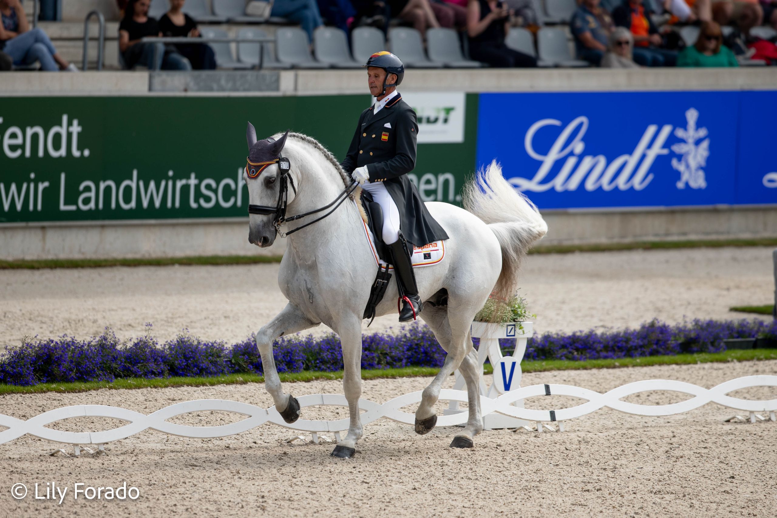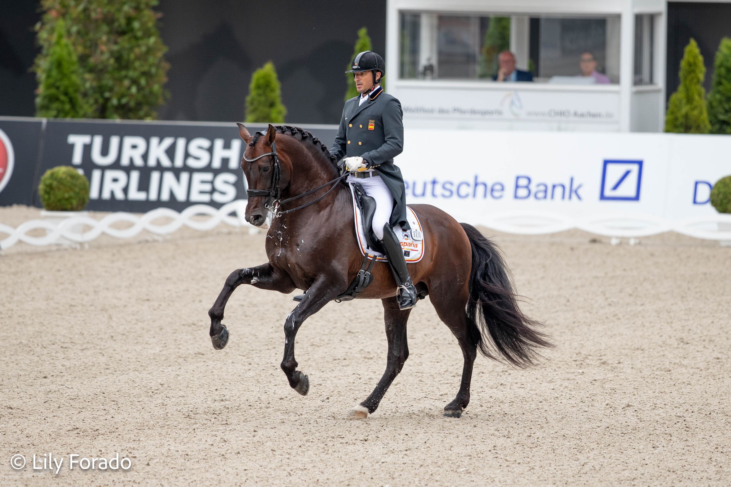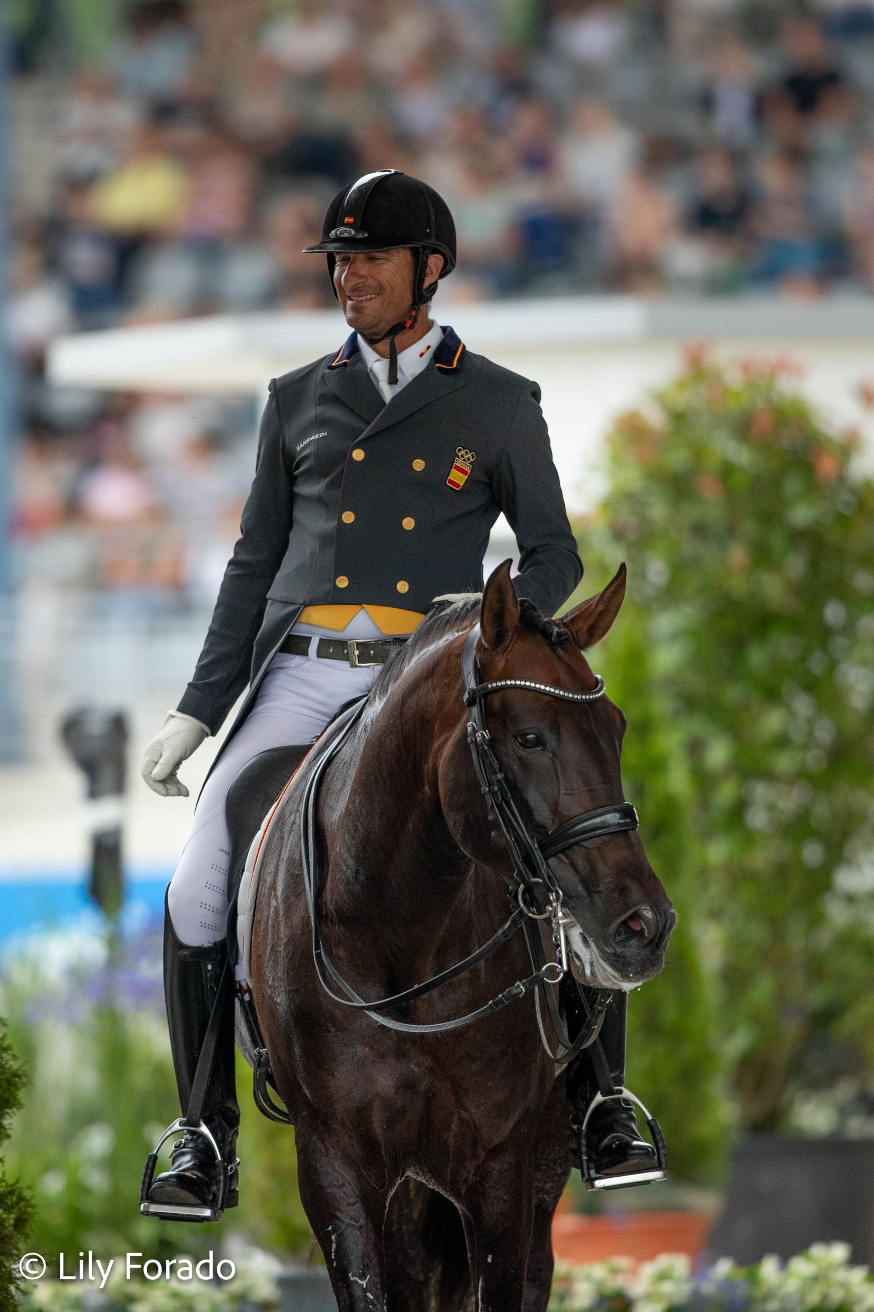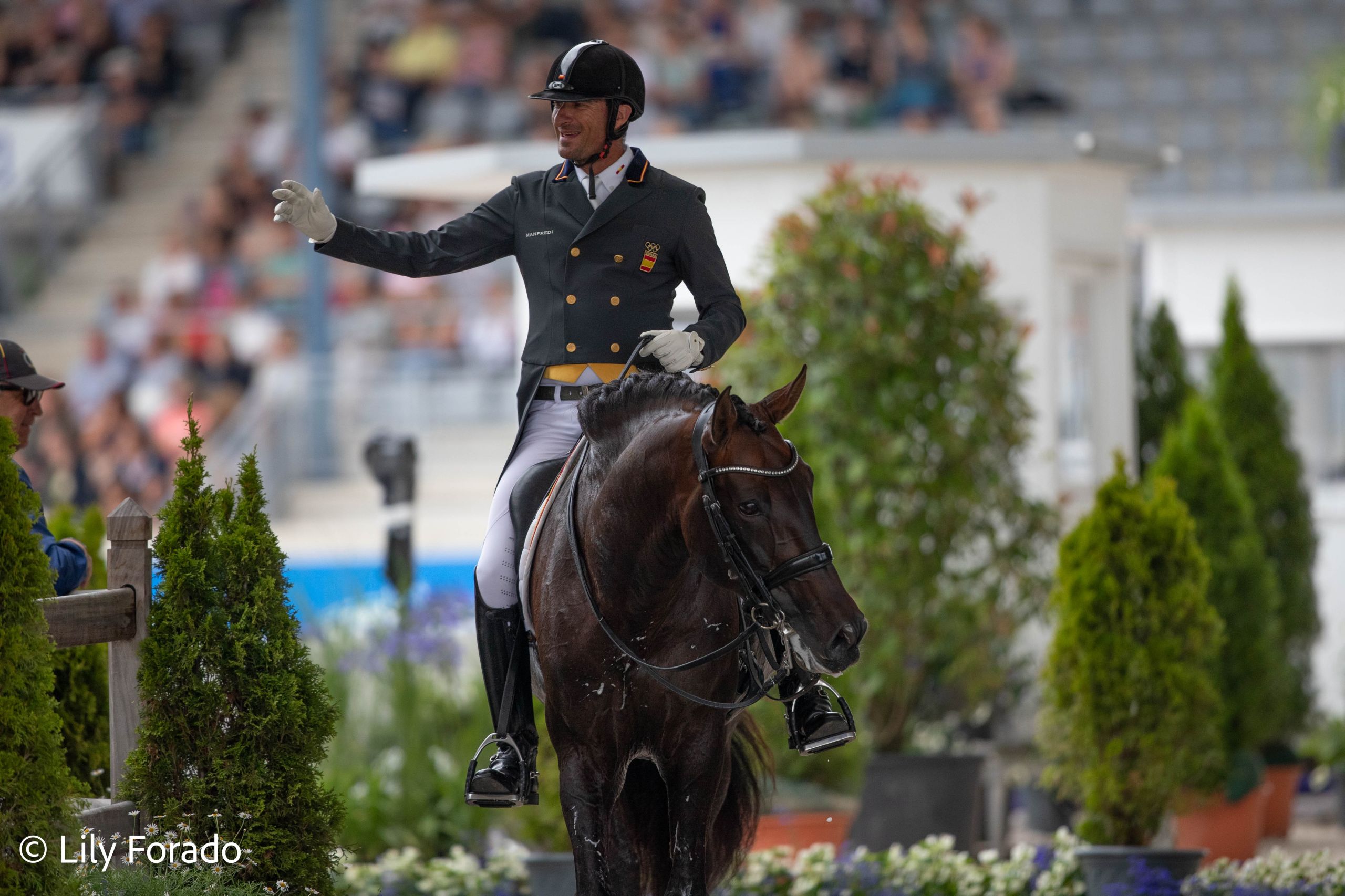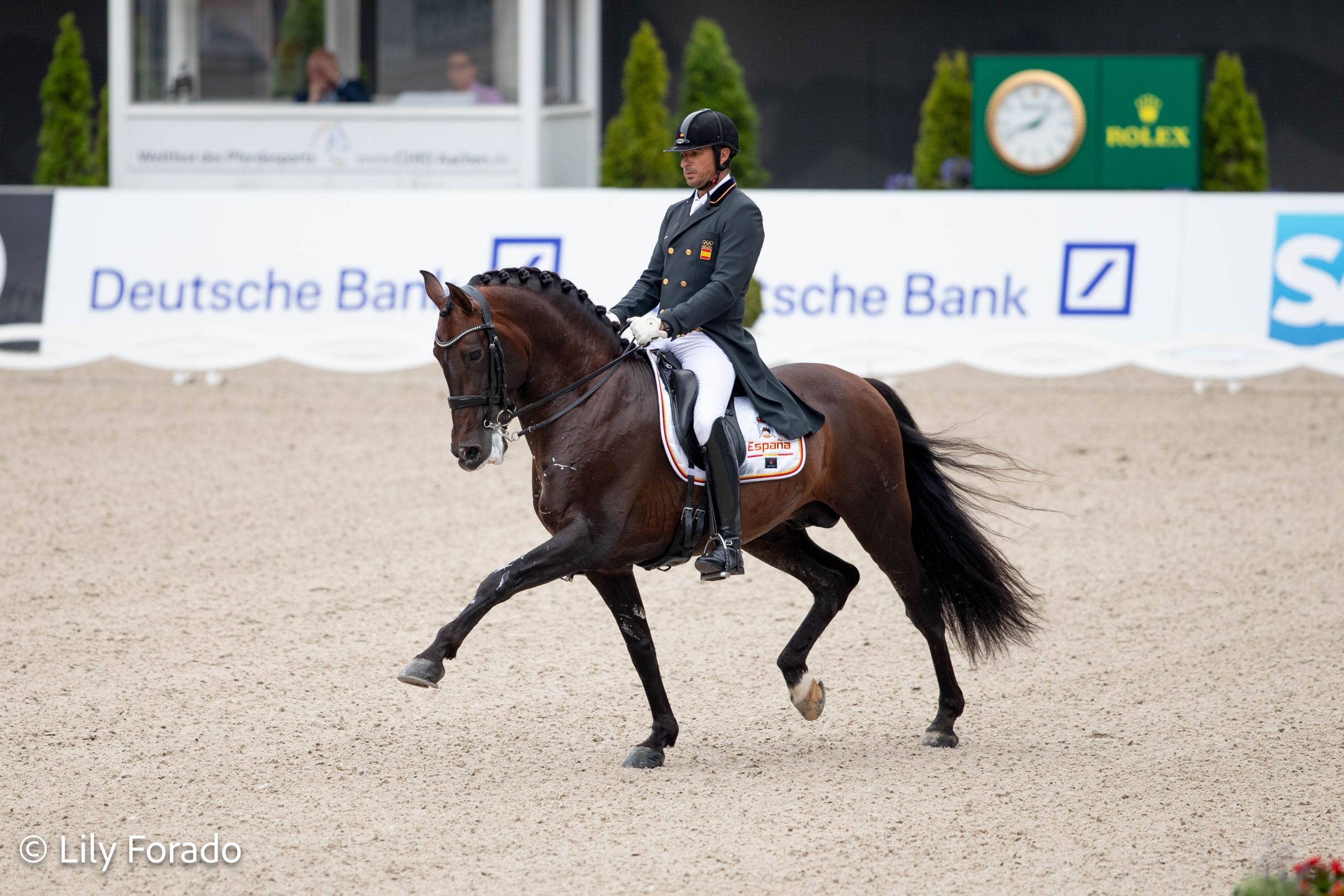 El nivel iba subiendo y la temperatura también.  Las alegrías para España prosiguieron con el turno de José Daniel Martin Dockx con Malagueño LXXXIII.  Encadenando ejercicio tras ejercicio con pericia y elegancia, el ejemplar de Francisco Santiago empezó con fuerza y tras su despliegue de calidad en piaffe y passage el marcador rondaba el 75%. Desde 2021, Aachen es un lugar especial para dicho binomio, ya que en cada actuación es mejor que la anterior. Los últimos trancos de máxima reunión fueron perfección pura. El semental castaño presentó un contacto muy cómodo, una actitud de recogimiento, caderas bajas, posteriores remetidos, tercio anterior y base del cuello elevados, frente en la vertical y con la nuca en su punto más alto. Con una puntuación mucho más elevada que el año pasado con dos puntos mássu nuevo récord personal de 74,217% lo ha situado en décimo primera posición. Tras acabar la prueba, el jinete no pudo contener su alegría y alzó su puño arriba. Su sonrisa fue de oreja a oreja.