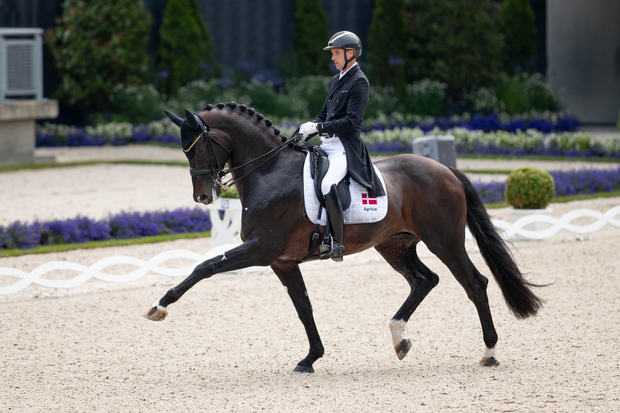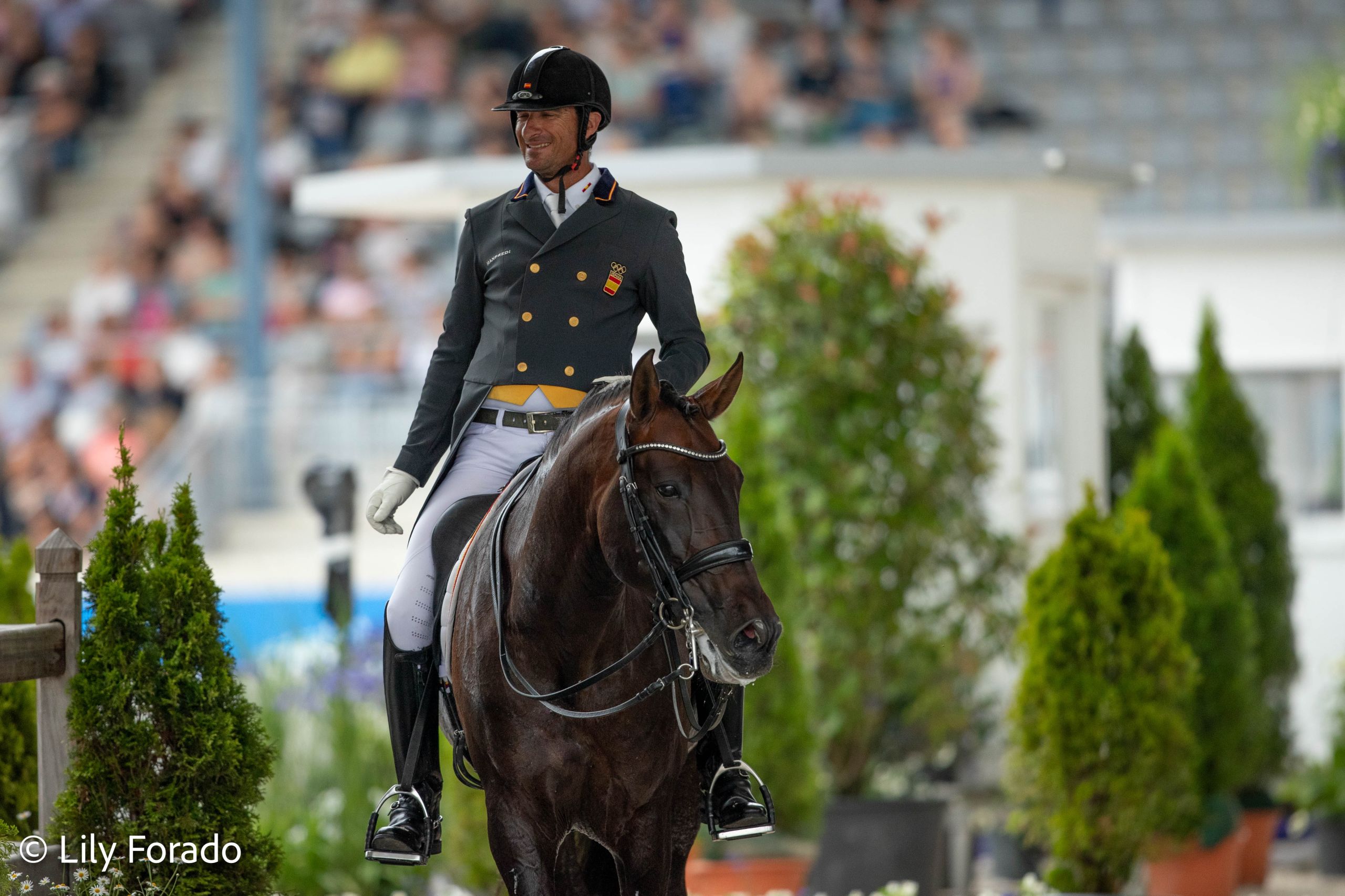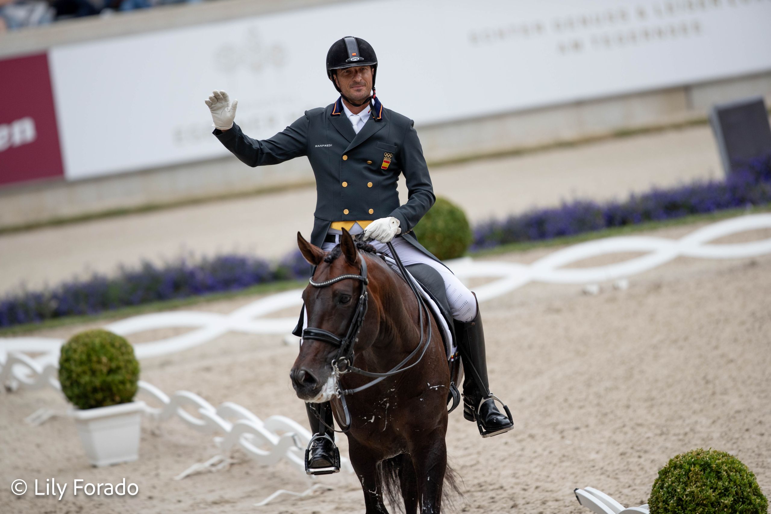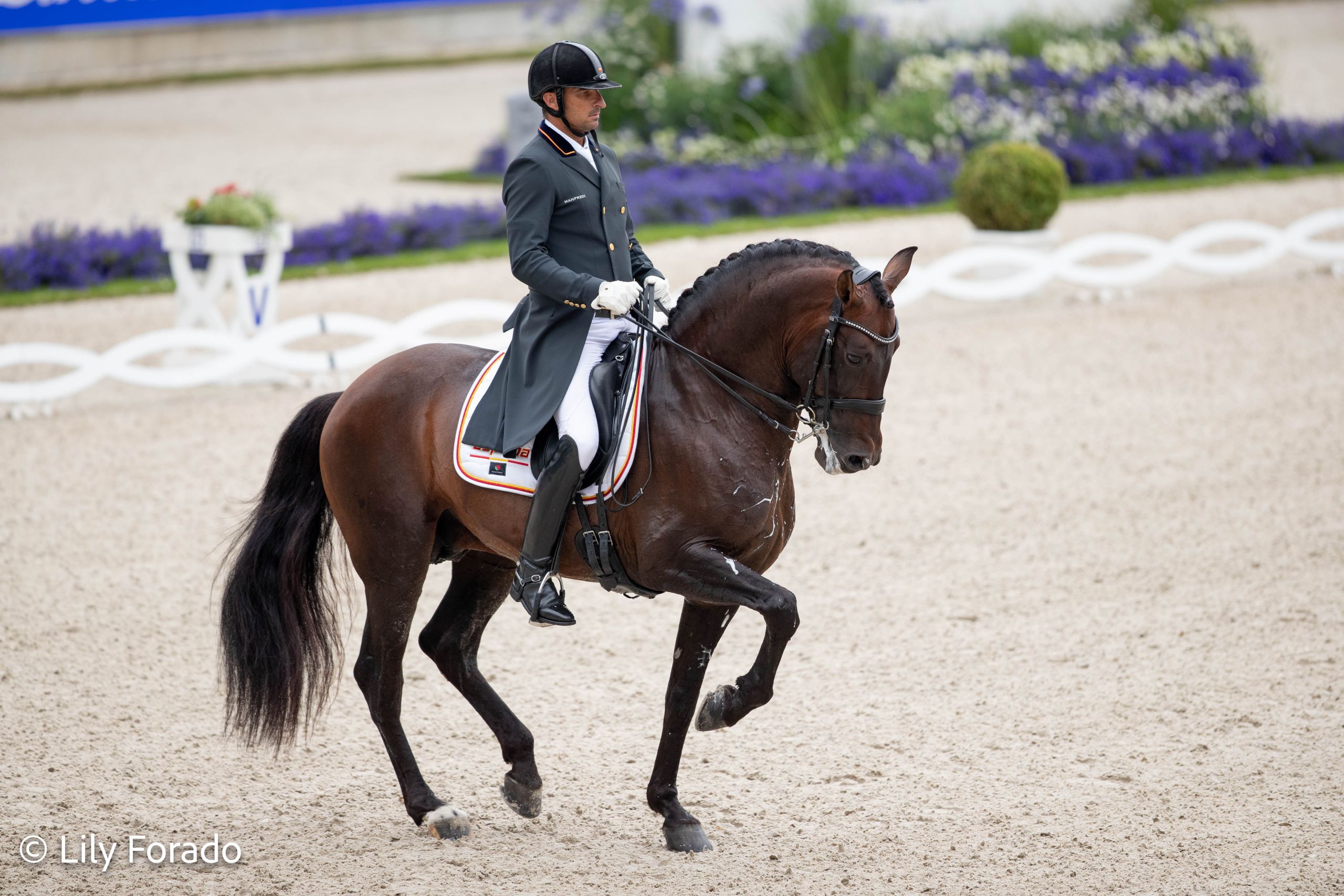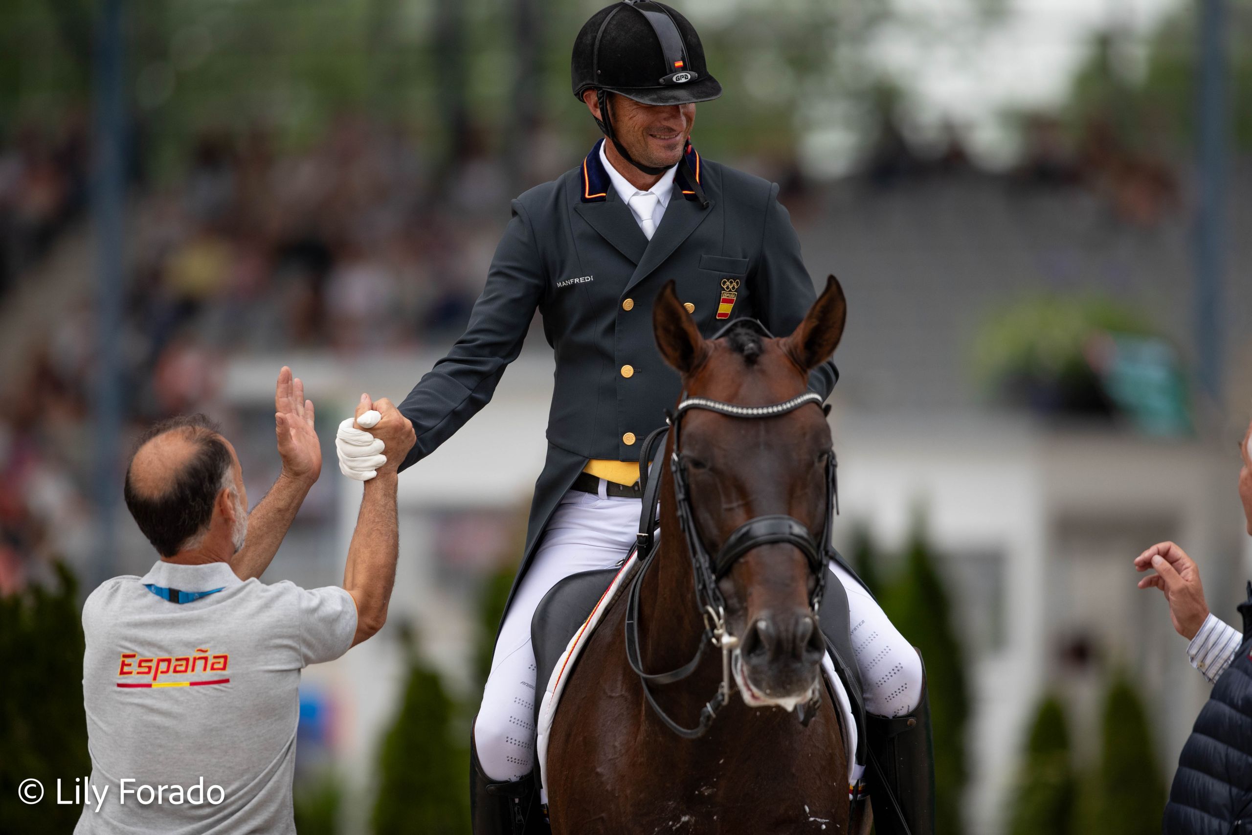 El nivel iba subiendo y la temperatura también.  Las alegrías para España prosiguieron con el turno de José Daniel Martin Dockx con Malagueño LXXXIII.  Encadenando ejercicio tras ejercicio con pericia y elegancia, el ejemplar de Francisco Santiago empezó con fuerza y tras su despliegue de calidad en piaffe y passage el marcador rondaba el 75%. Desde 2021, Aachen es un lugar especial para dicho binomio, ya que en cada actuación es mejor que la anterior. Los últimos trancos de máxima reunión fueron perfección pura. El semental castaño presentó un contacto muy cómodo, una actitud de recogimiento, caderas bajas, posteriores remetidos, tercio anterior y base del cuello elevados, frente en la vertical y con la nuca en su punto más alto. Con una puntuación mucho más elevada que el año pasado con dos puntos mássu nuevo récord personal de 74,217% lo ha situado en décimo primera posición. Tras acabar la prueba, el jinete no pudo contener su alegría y alzó su puño arriba. Su sonrisa fue de oreja a oreja.