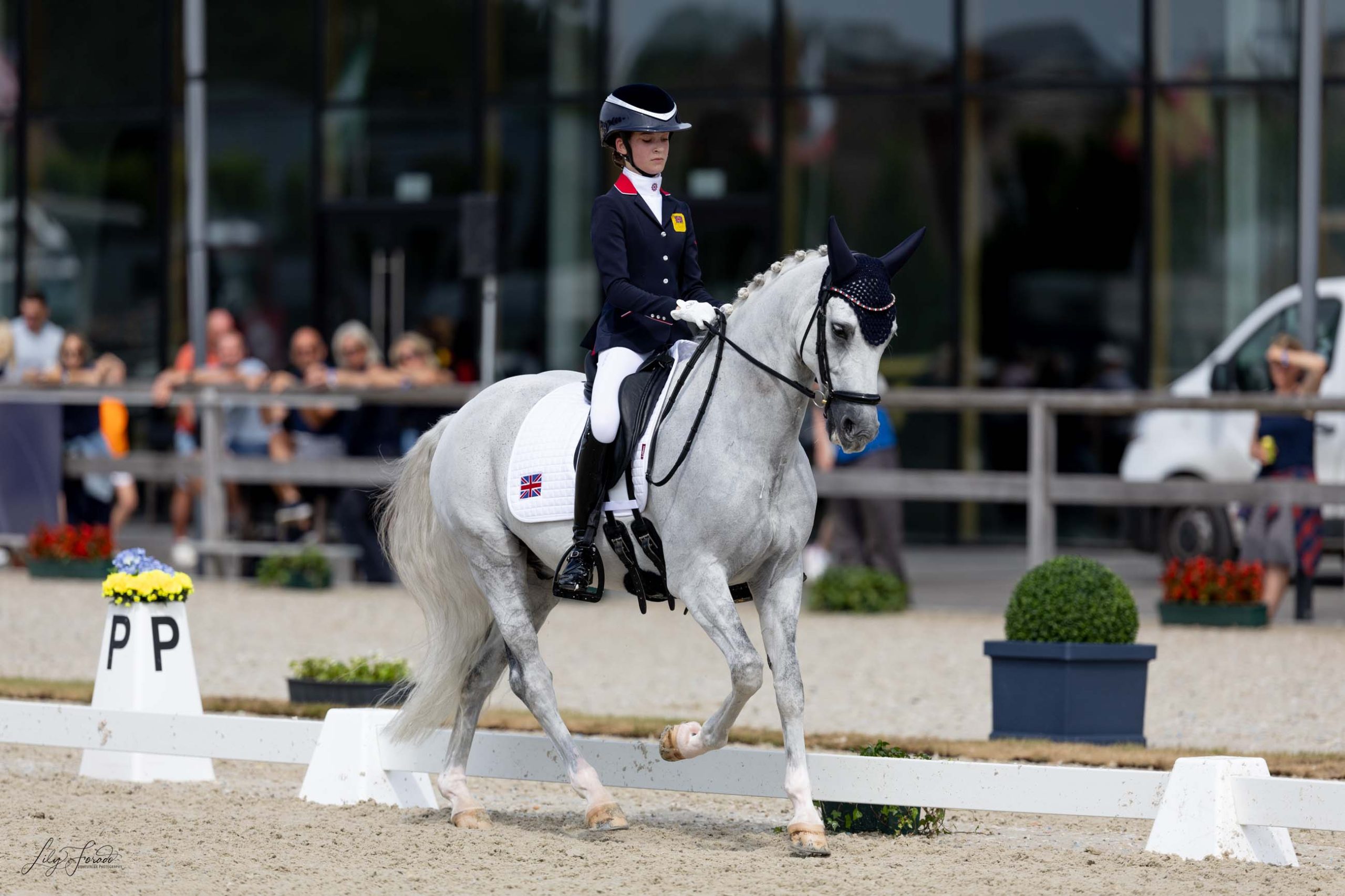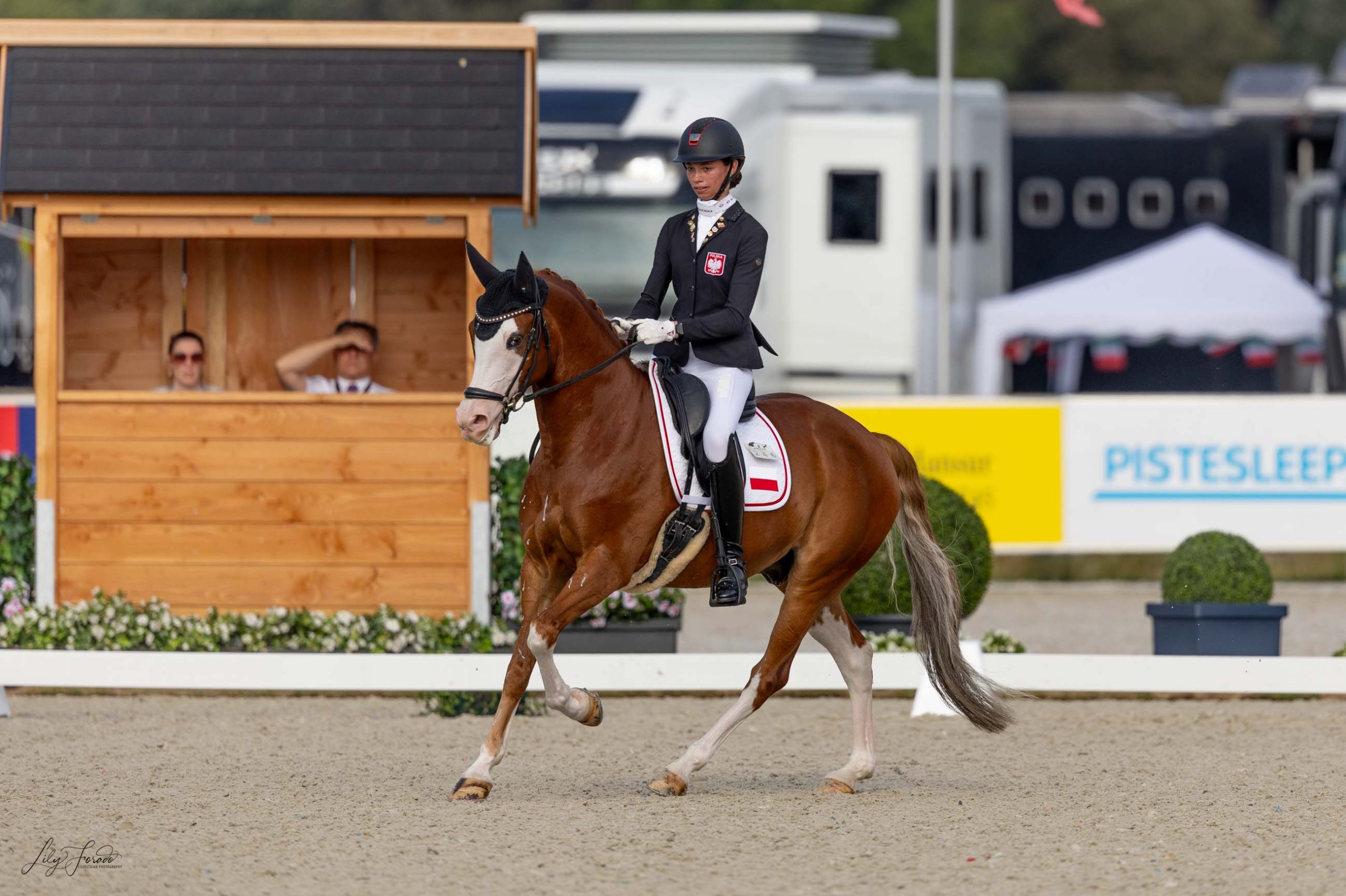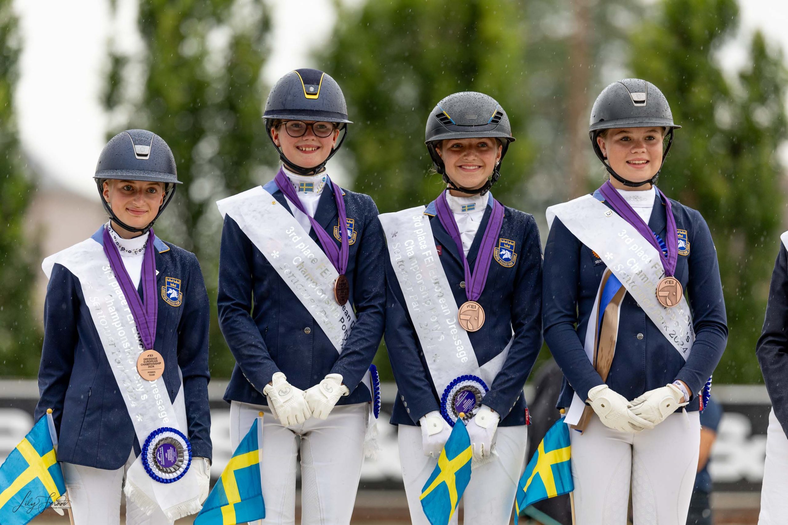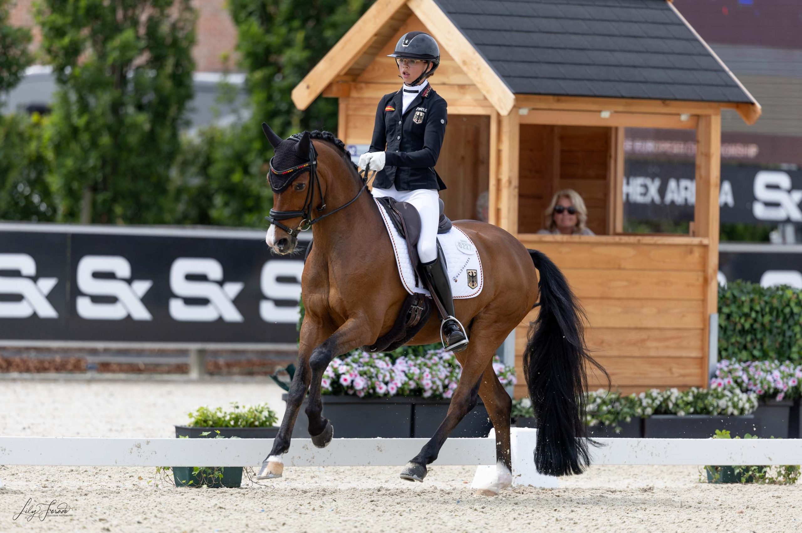 Con mucho suspense y nervios a flor de piel, la segunda parte de prueba por equipos de Ponis supuso una montaña rusa de emociones.  Codo con codo,  la lucha por la medalla de plata fue muy emocionante. Alemania lideraba la clasificación, pero es que Dinamarca y Suecia iban oscilando en el tablero según pasaban sus jinetes. Tras cumplir con las expectativas, la alemana  Leni-Sophie Gosmann con Diamantini Ea WE situó la nación germana en cabeza de manera provisional gracias a su 72.772%. Posteriormente, su compañera y casi la última en competir, Madlin Tillmann con Chilly Morning WE no defraudó y encabezó a su equipo en su lugar habitual, el escalón dorado. Anotando un 74.143%, dicha media aseguró la victoria al equipo alemán.  Los daneses no fueron para menos y es que en la última rotación de jinetes, Ingeborg Elizabeth Schou con el semental Fs Calimero dejó a todo el mundo boquiabierto con su actuación posicionando a su nación en el escalón de plata. Su 74.371% la situó en cabeza de la clasificación individual .