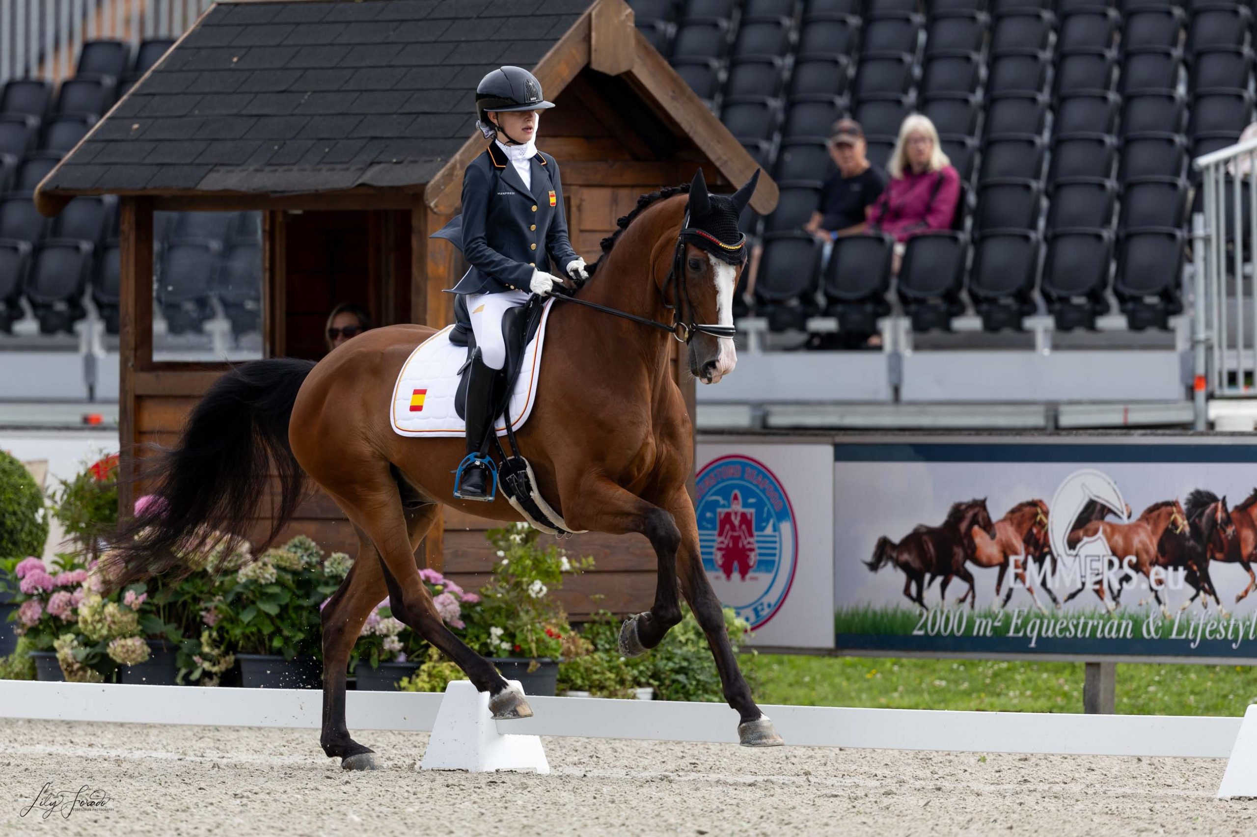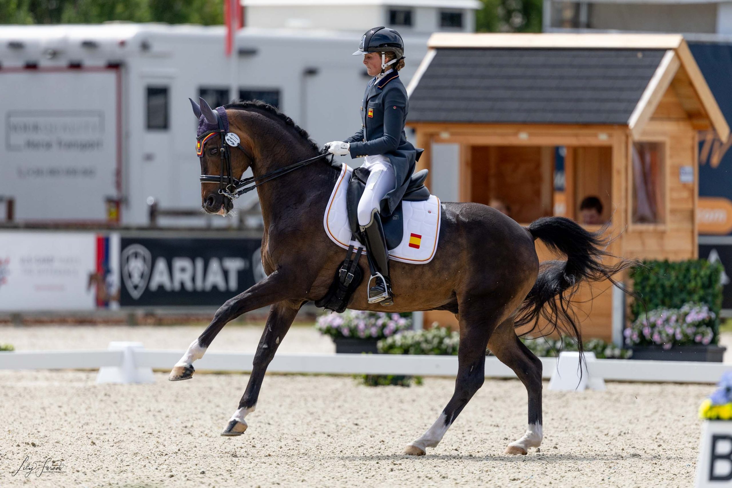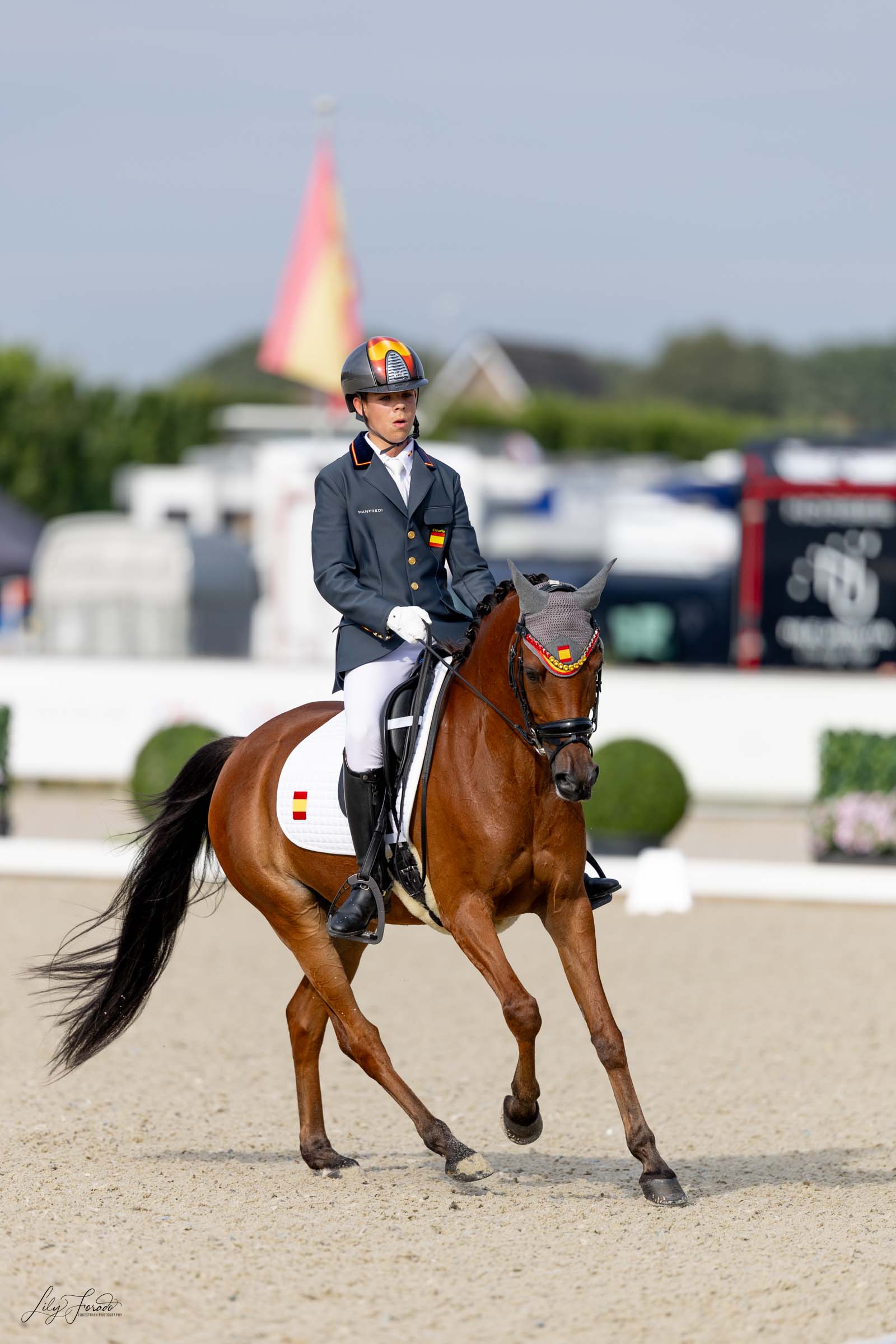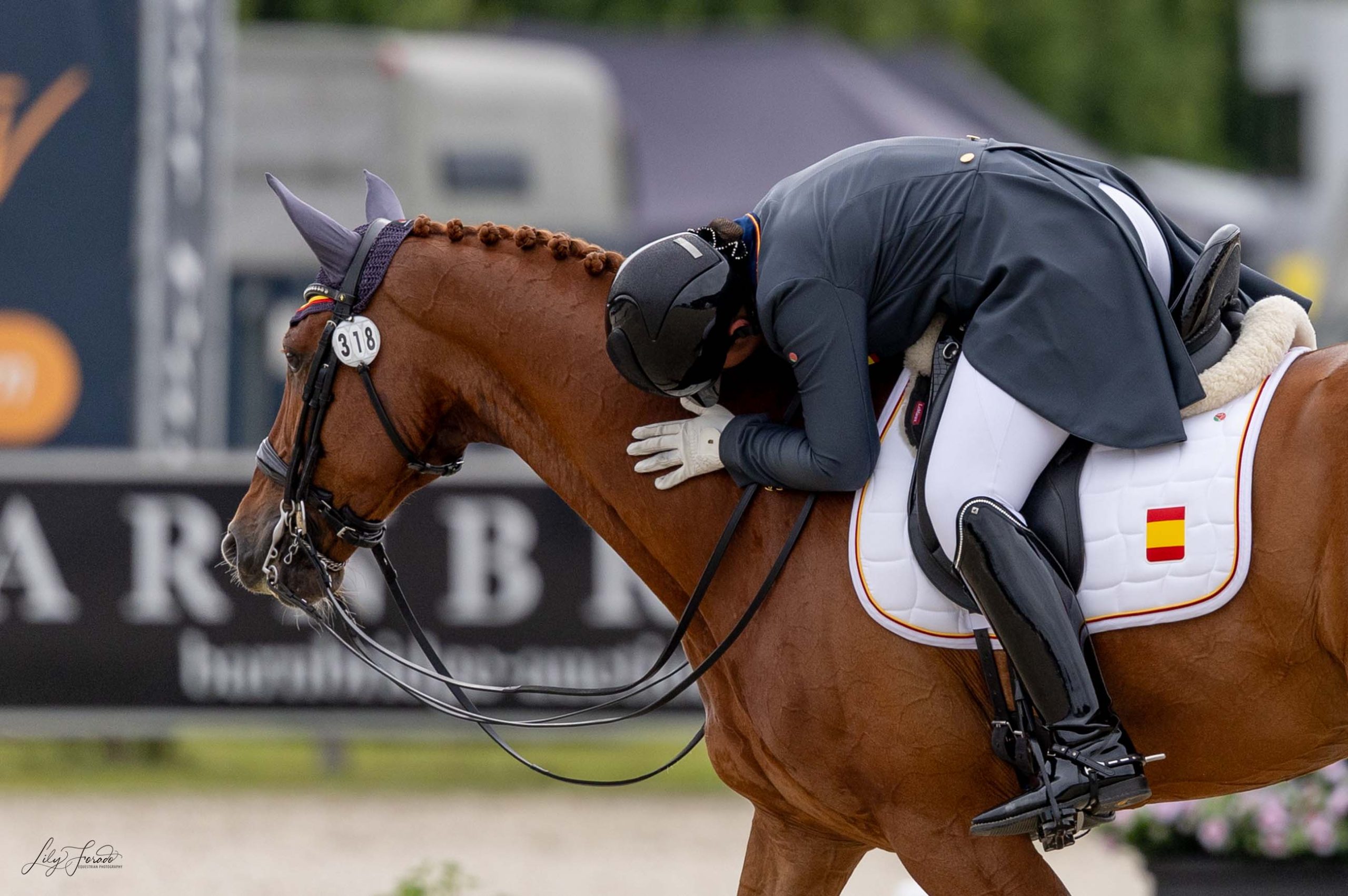 A nivel español Ixone Lacunza Vázquez ha vuelto a demostrar de nuevo sus grandes tablas en pista. La alumna de Victor Álvarez es sinónimo de concentración en pista. Tranco a tranco va ejecutando los ejercicios y va rascando puntos donde puede. Su nota final ha sido de 67.886% copando la trigésimo segunda posición. En cuanto a Álvaro López montando a Keulse Hoeve’s Mark fue el encargado de abrir pista de nuevo. Estar en el europeo es la gran recompensa de toda la temporada. Álvaro ha tenido una ciertas imprecisiones de ritmo hoy en la vueltas, pero tras su saludo final su sonrisa lo decía todo, que es al final lo importante. Su nota final ha sido de 63.315. España ha finalizado en novena posición por equipos.