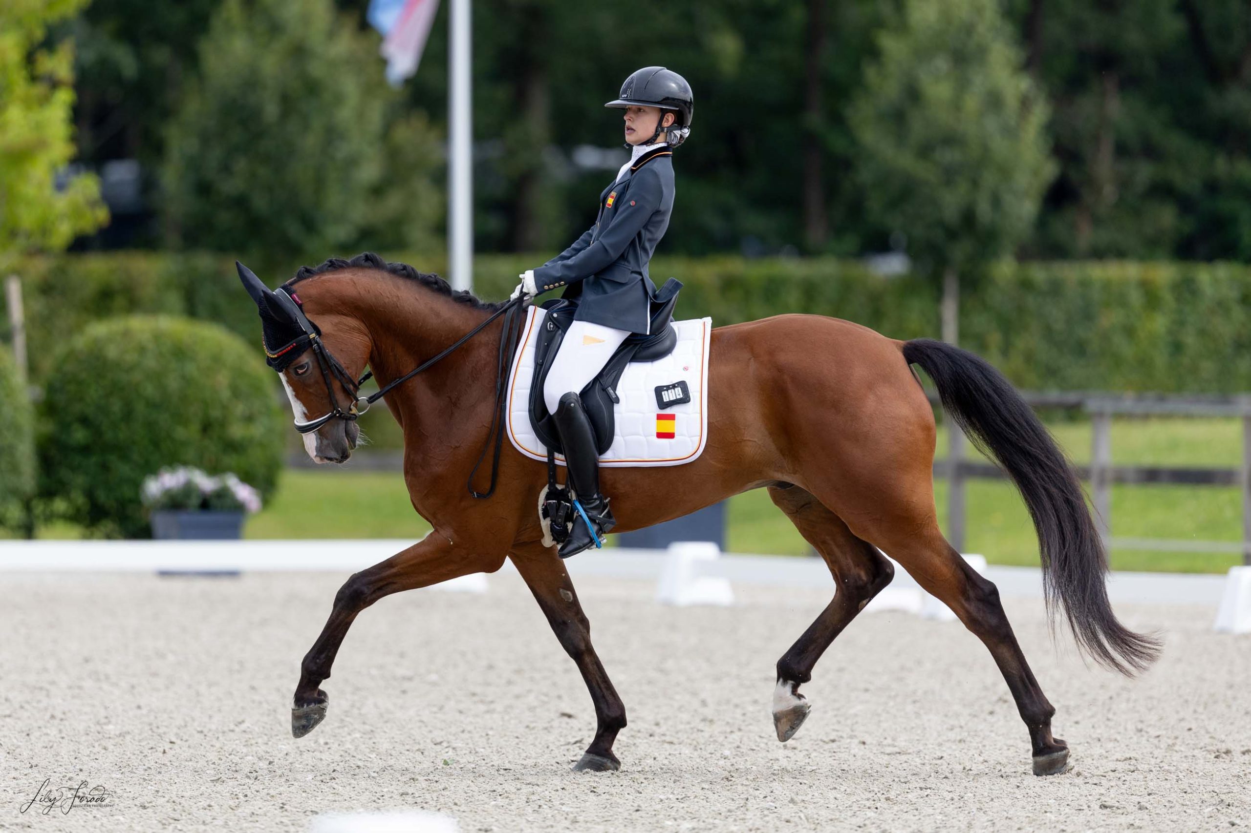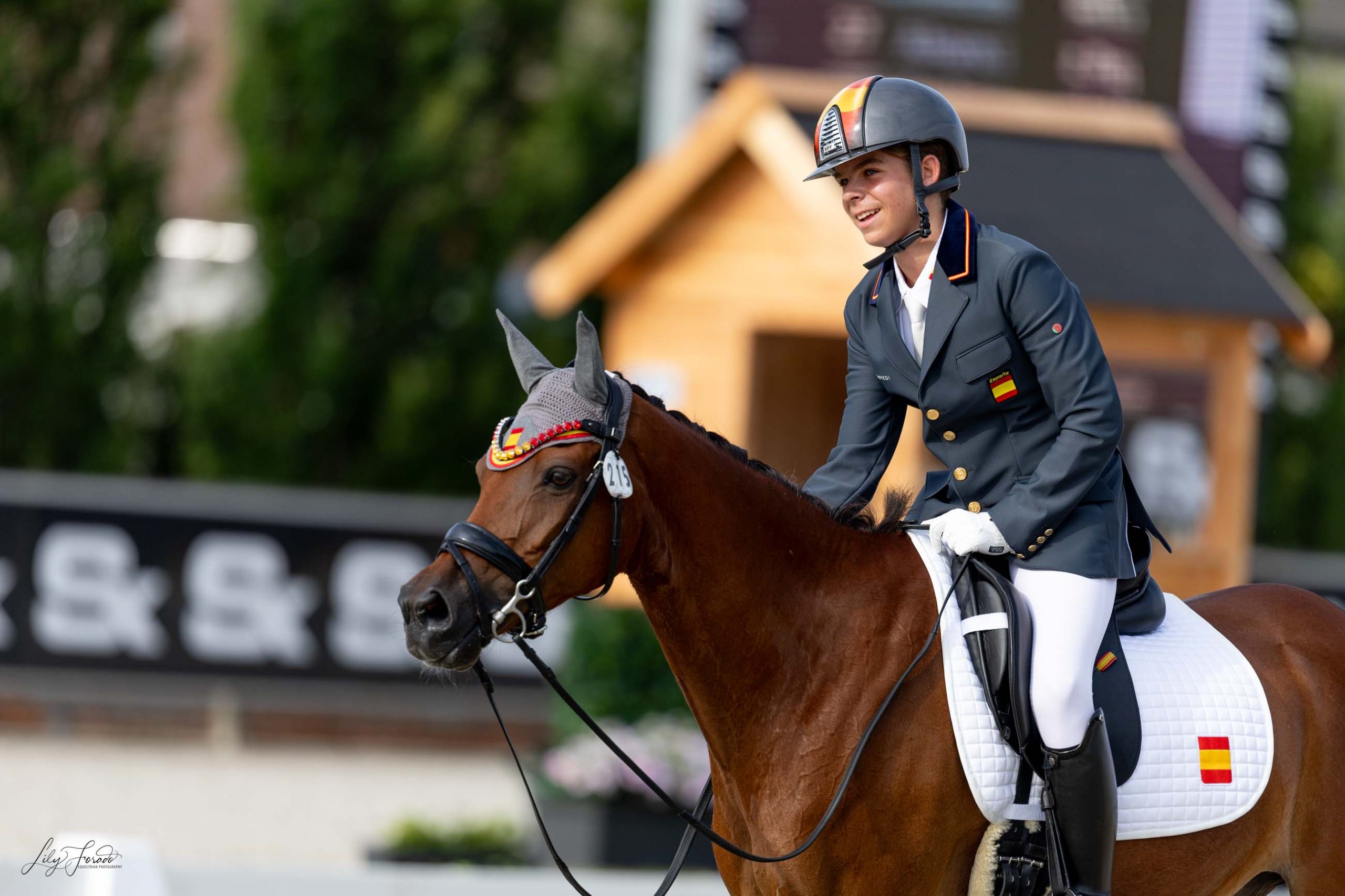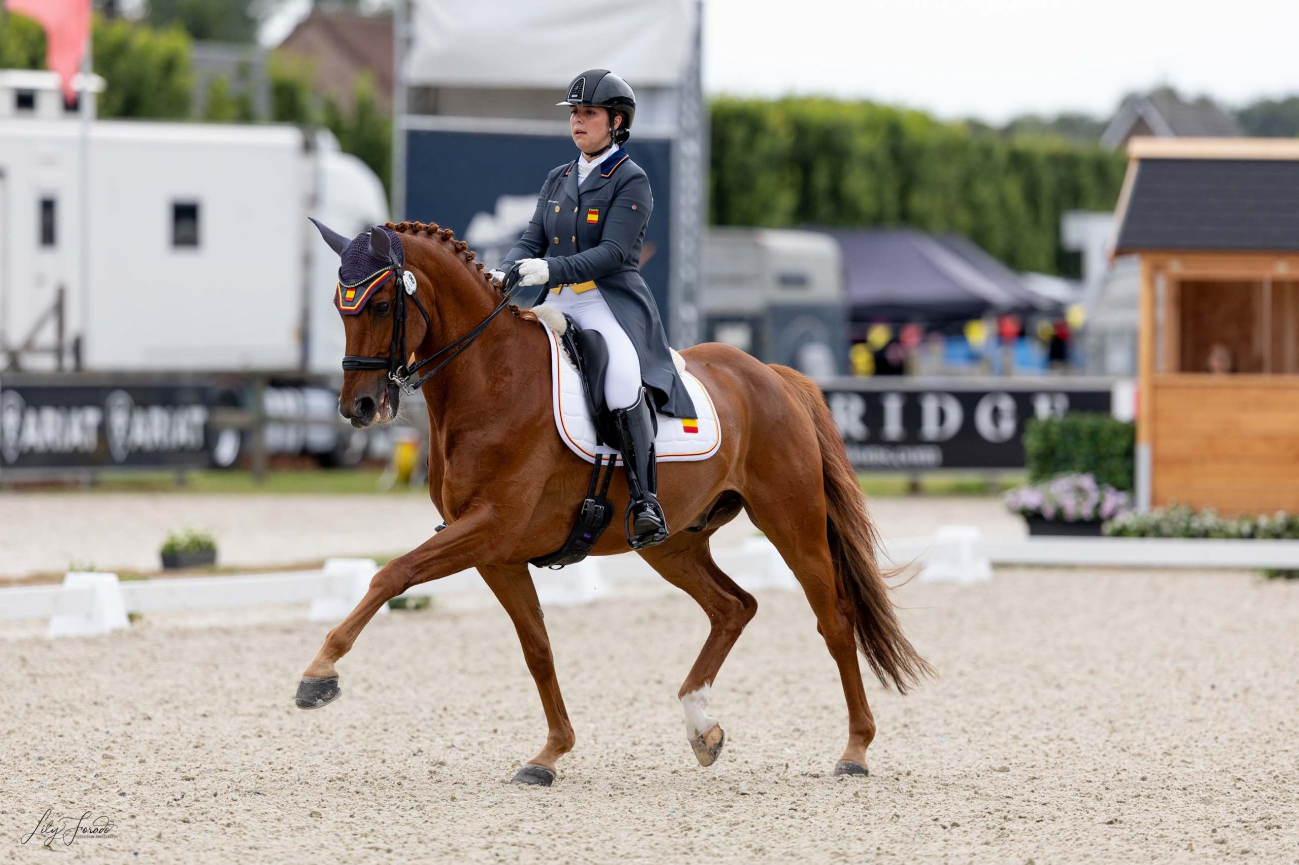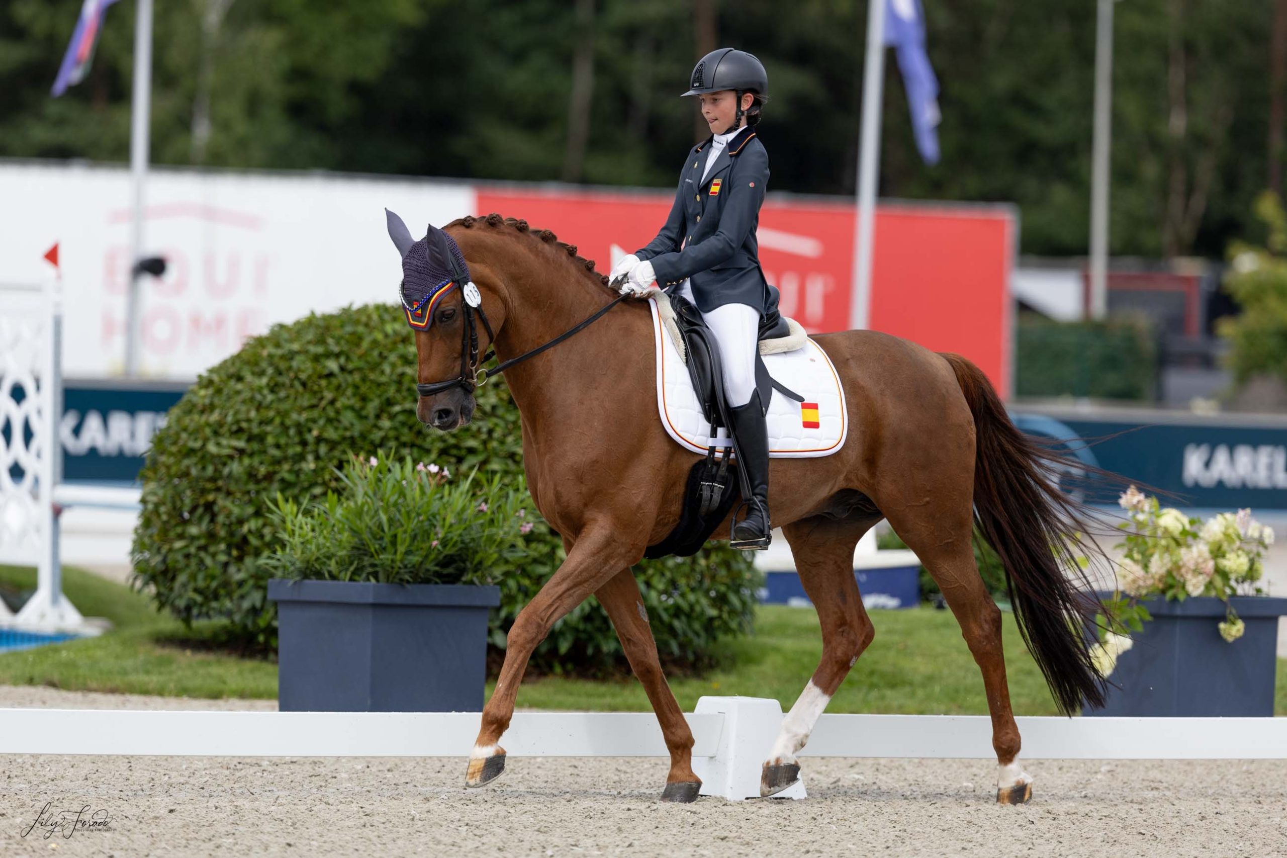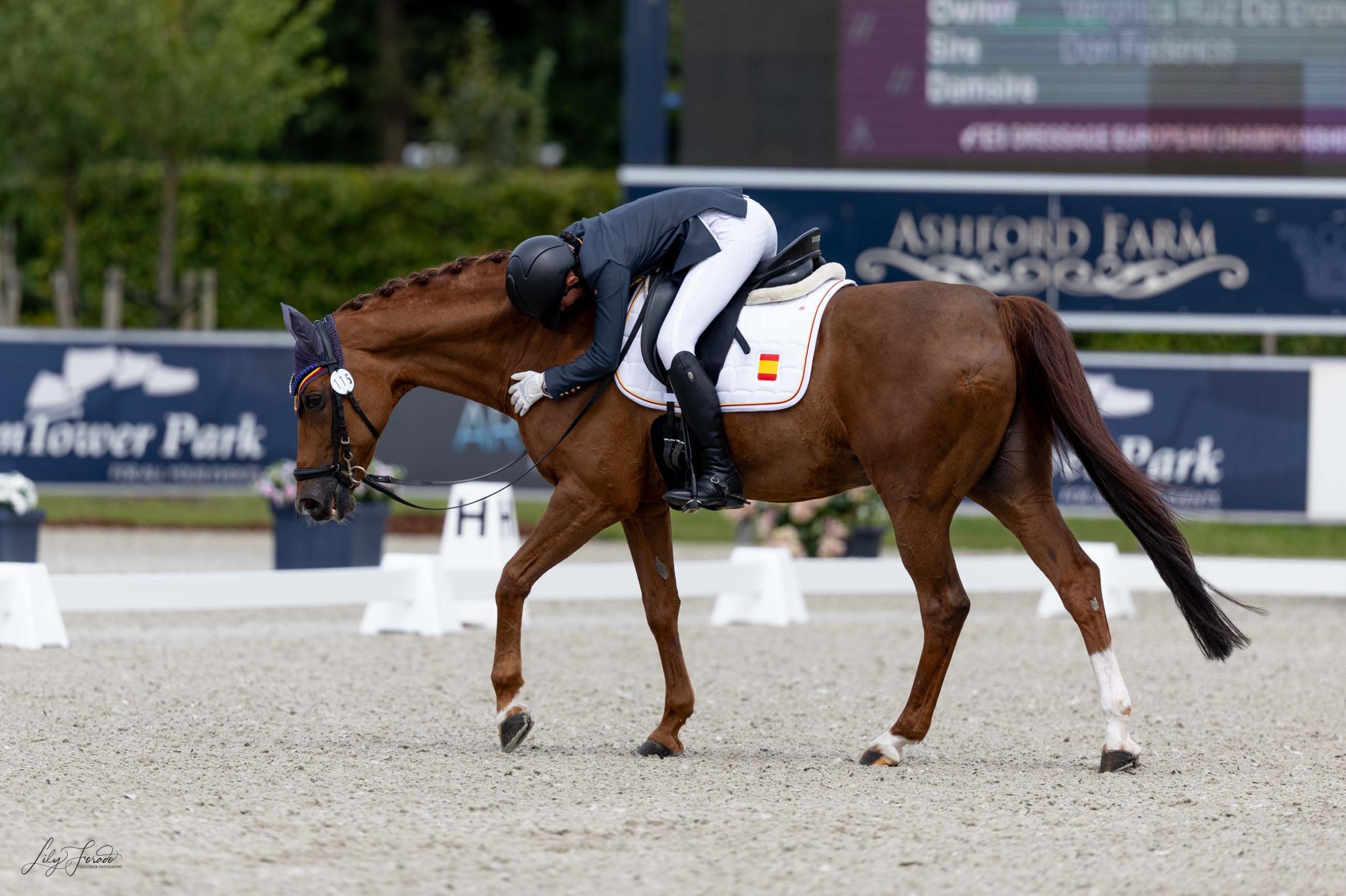 A nivel español Ixone Lacunza Vázquez ha vuelto a demostrar de nuevo sus grandes tablas en pista. La alumna de Victor Álvarez es sinónimo de concentración en pista. Tranco a tranco va ejecutando los ejercicios y va rascando puntos donde puede. Su nota final ha sido de 67.886% copando la trigésimo segunda posición. En cuanto a Álvaro López montando a Keulse Hoeve’s Mark fue el encargado de abrir pista de nuevo. Estar en el europeo es la gran recompensa de toda la temporada. Álvaro ha tenido una ciertas imprecisiones de ritmo hoy en la vueltas, pero tras su saludo final su sonrisa lo decía todo, que es al final lo importante. Su nota final ha sido de 63.315. España ha finalizado en novena posición por equipos.