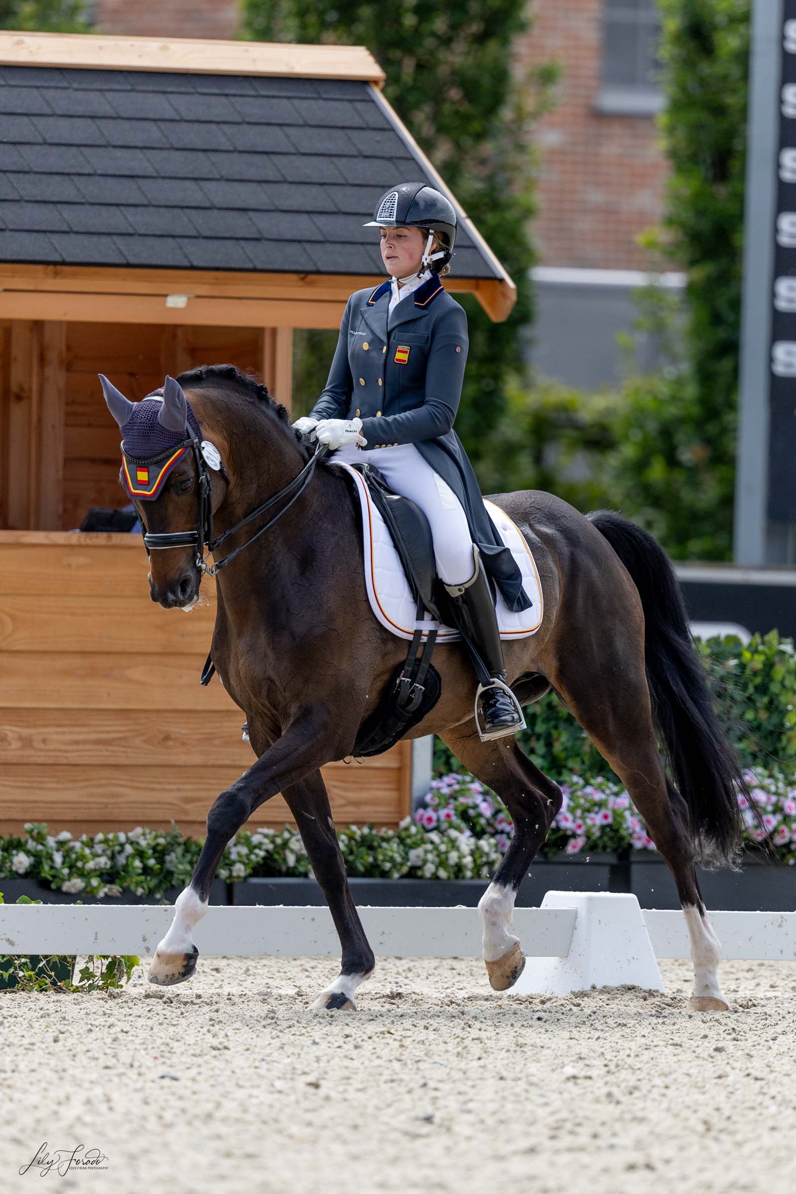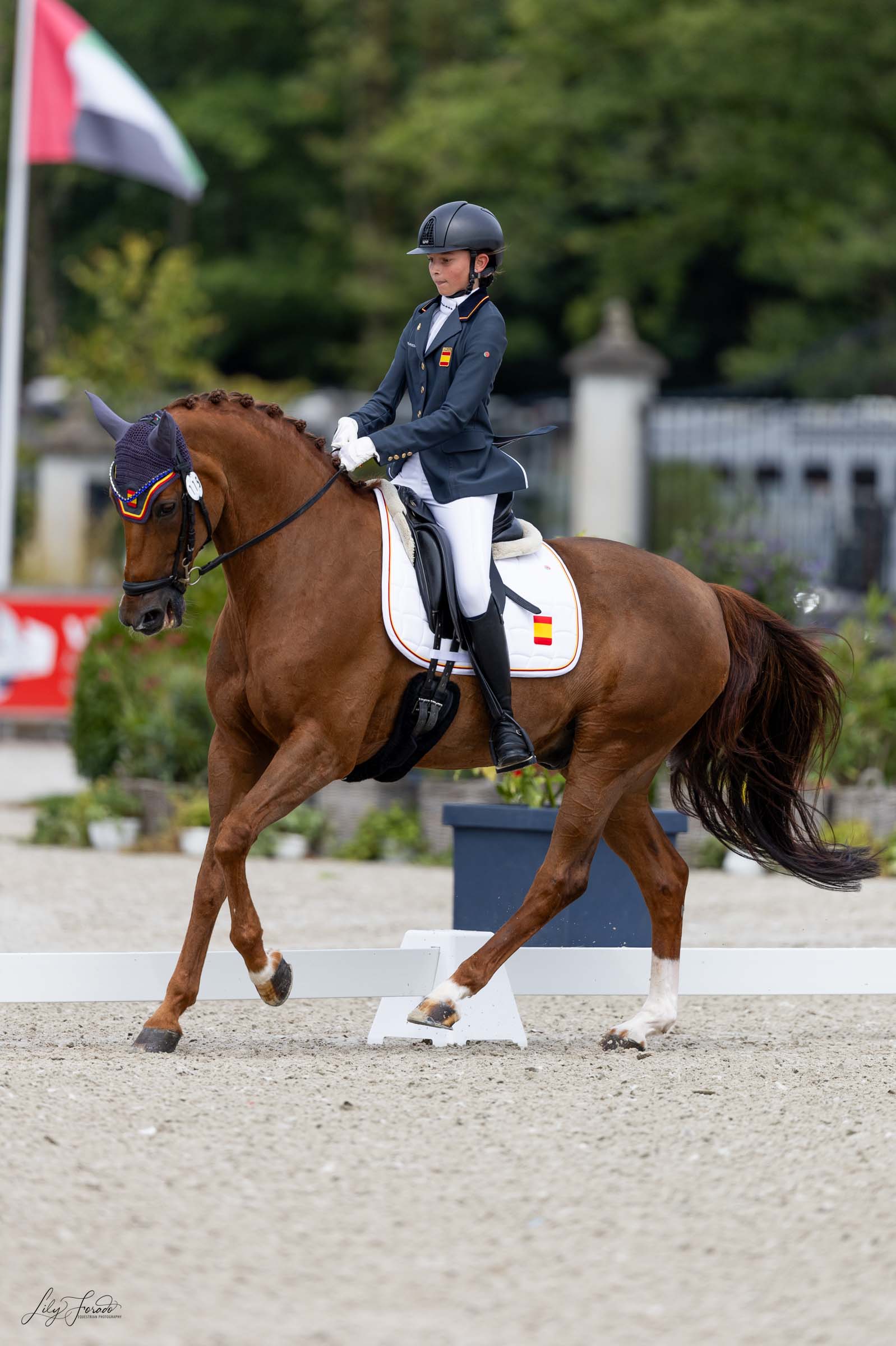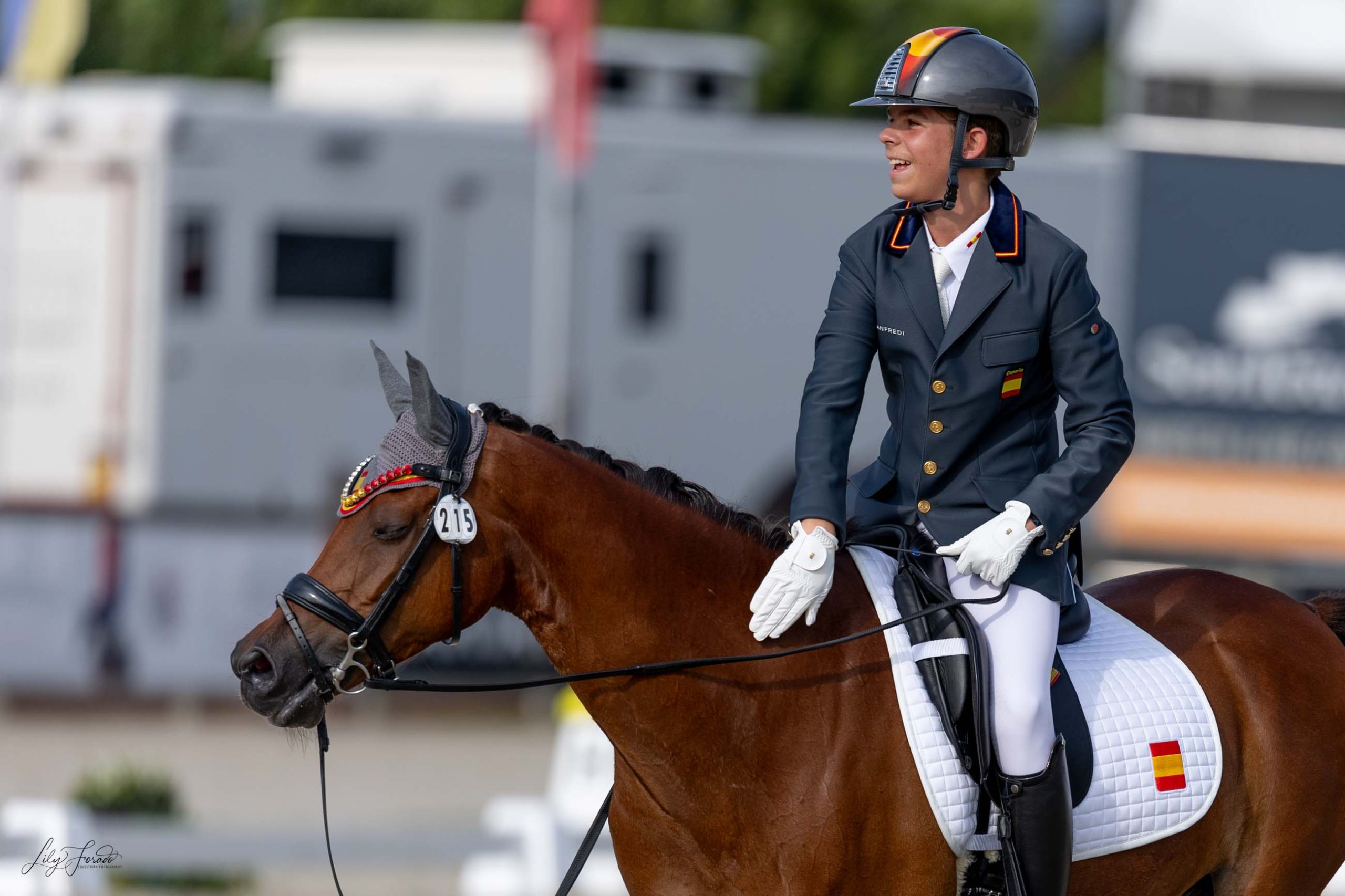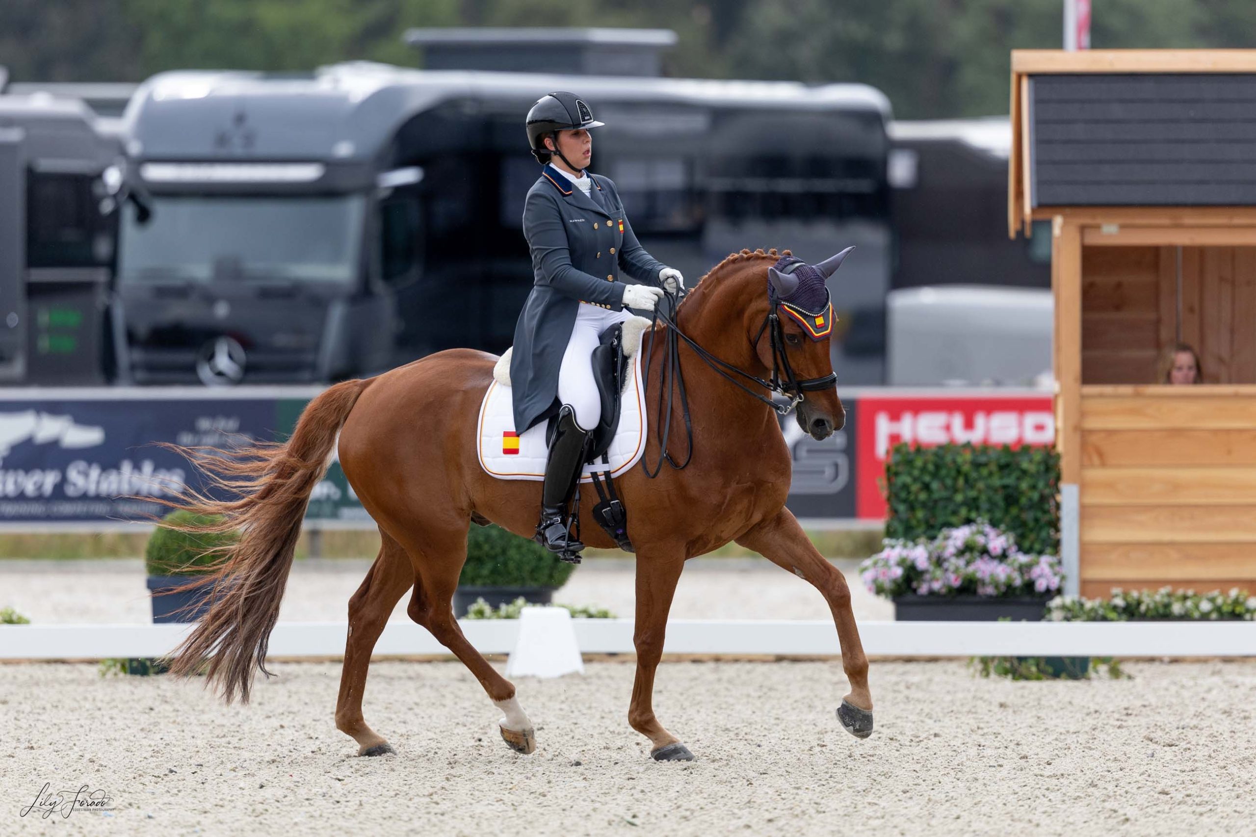 A nivel español Ixone Lacunza Vázquez ha vuelto a demostrar de nuevo sus grandes tablas en pista. La alumna de Victor Álvarez es sinónimo de concentración en pista. Tranco a tranco va ejecutando los ejercicios y va rascando puntos donde puede. Su nota final ha sido de 67.886% copando la trigésimo segunda posición. En cuanto a Álvaro López montando a Keulse Hoeve’s Mark fue el encargado de abrir pista de nuevo. Estar en el europeo es la gran recompensa de toda la temporada. Álvaro ha tenido una ciertas imprecisiones de ritmo hoy en la vueltas, pero tras su saludo final su sonrisa lo decía todo, que es al final lo importante. Su nota final ha sido de 63.315. España ha finalizado en novena posición por equipos.